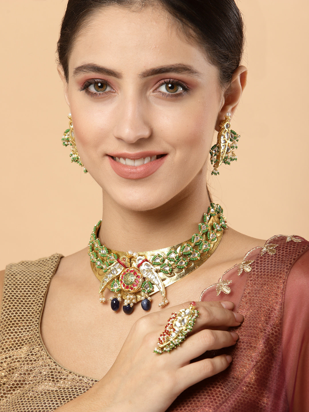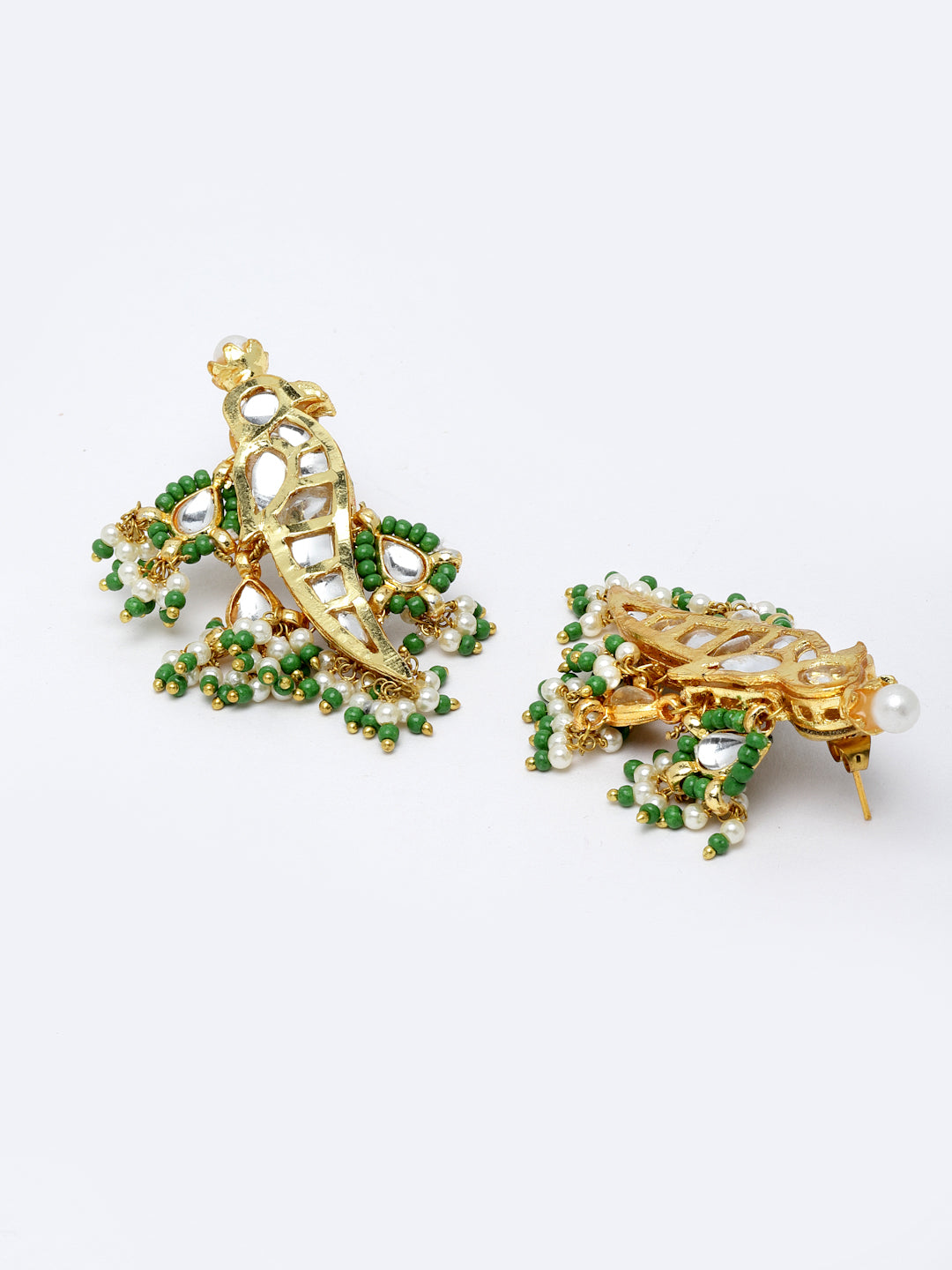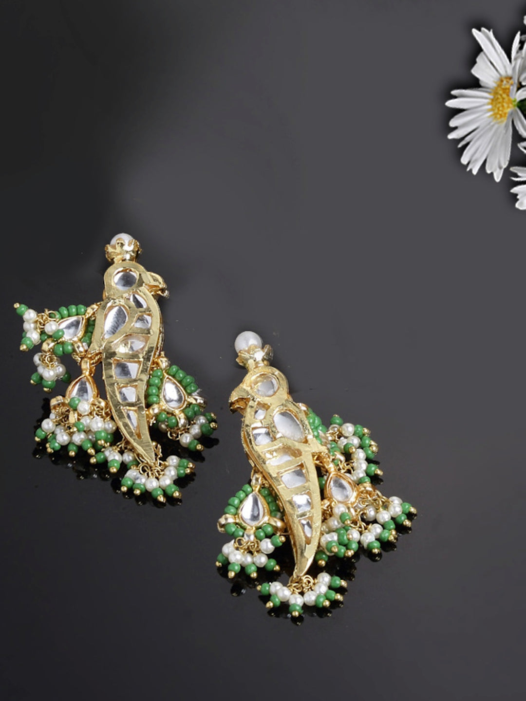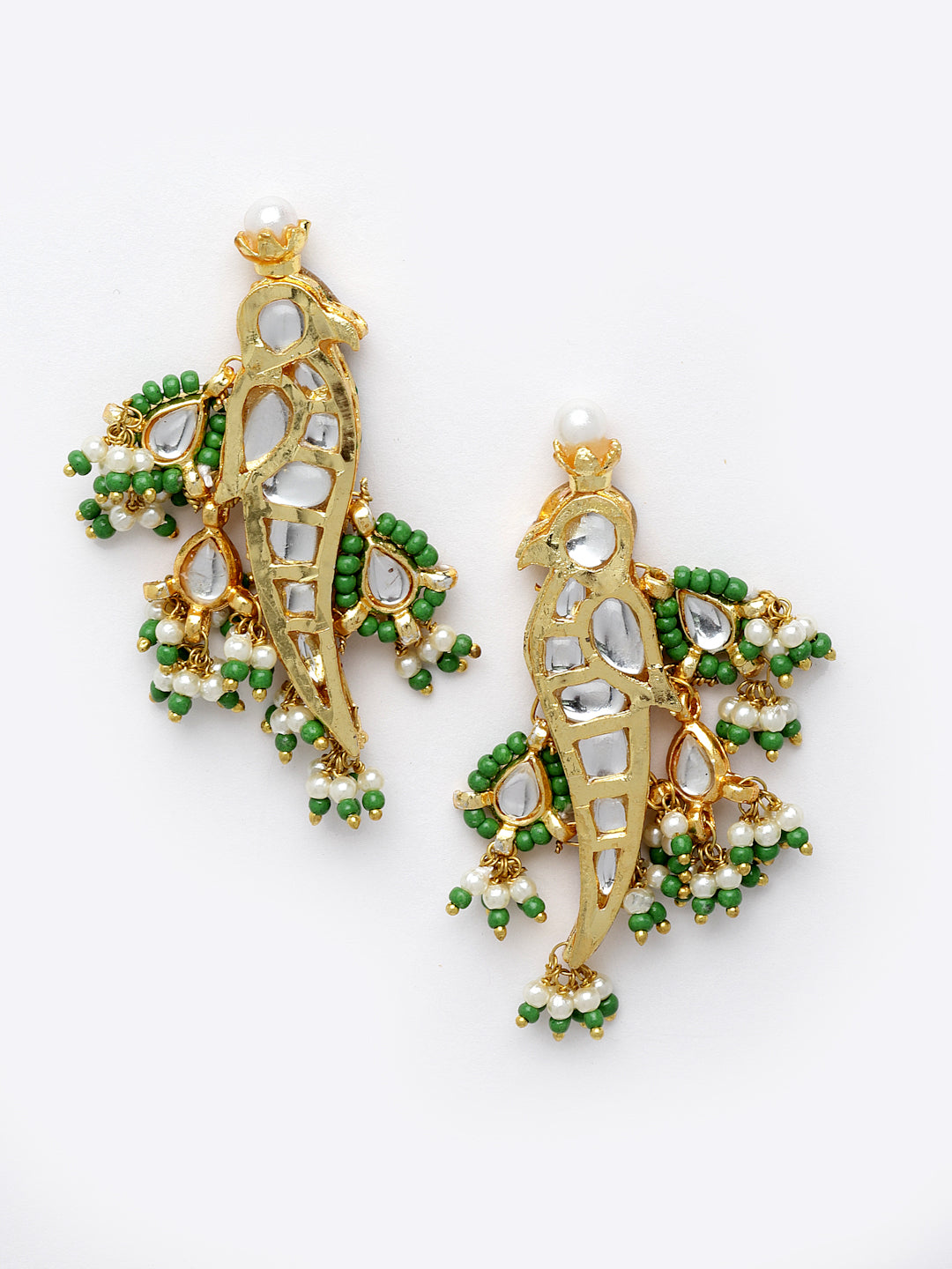 Pair Of Love Birds Highlighted With Green Which Goes With Every Thing... Style These With Super Comfy And Boho Look To Give A Any Outfit A Peped Up Look.; Category Of Jewellery Is Earring; Sub Category Is Drop; Ideal For Women; Color Is Green, Gold, White; Gemstones Used - Kundan, Pearls, Natural Stones; Plating Is Gold-Plated; Base Metal Is Alloy; Other Material Used - Closure Stopper And Kanchain; Size Is Freesize; Adjustable - No; Weight Is 10 Gms; Mesaurements - Length Of Earring= 6.5 Cm; Width Of Earring =3 Cm; Adjustable - No; Content 1 Pair Earring