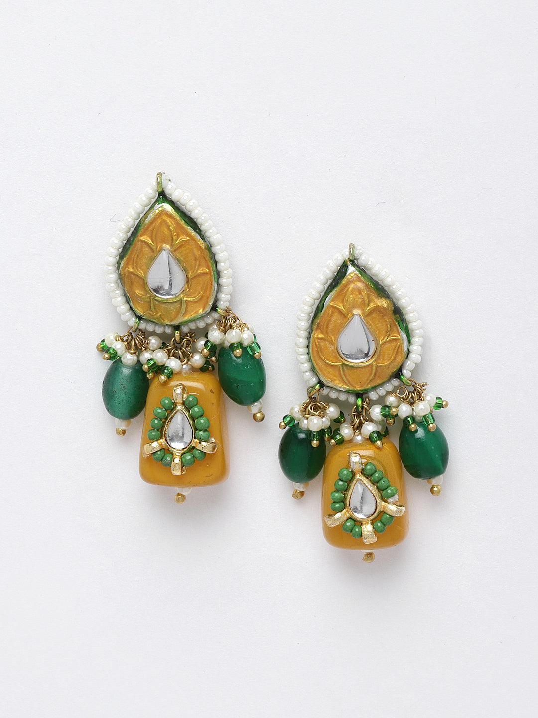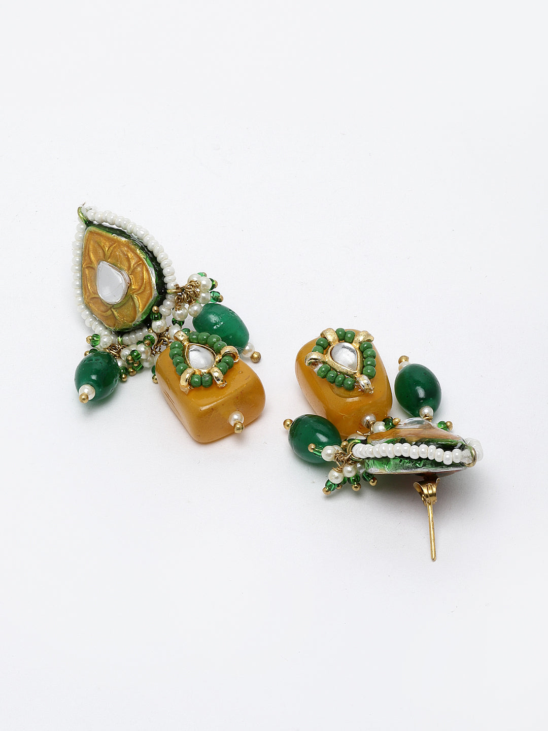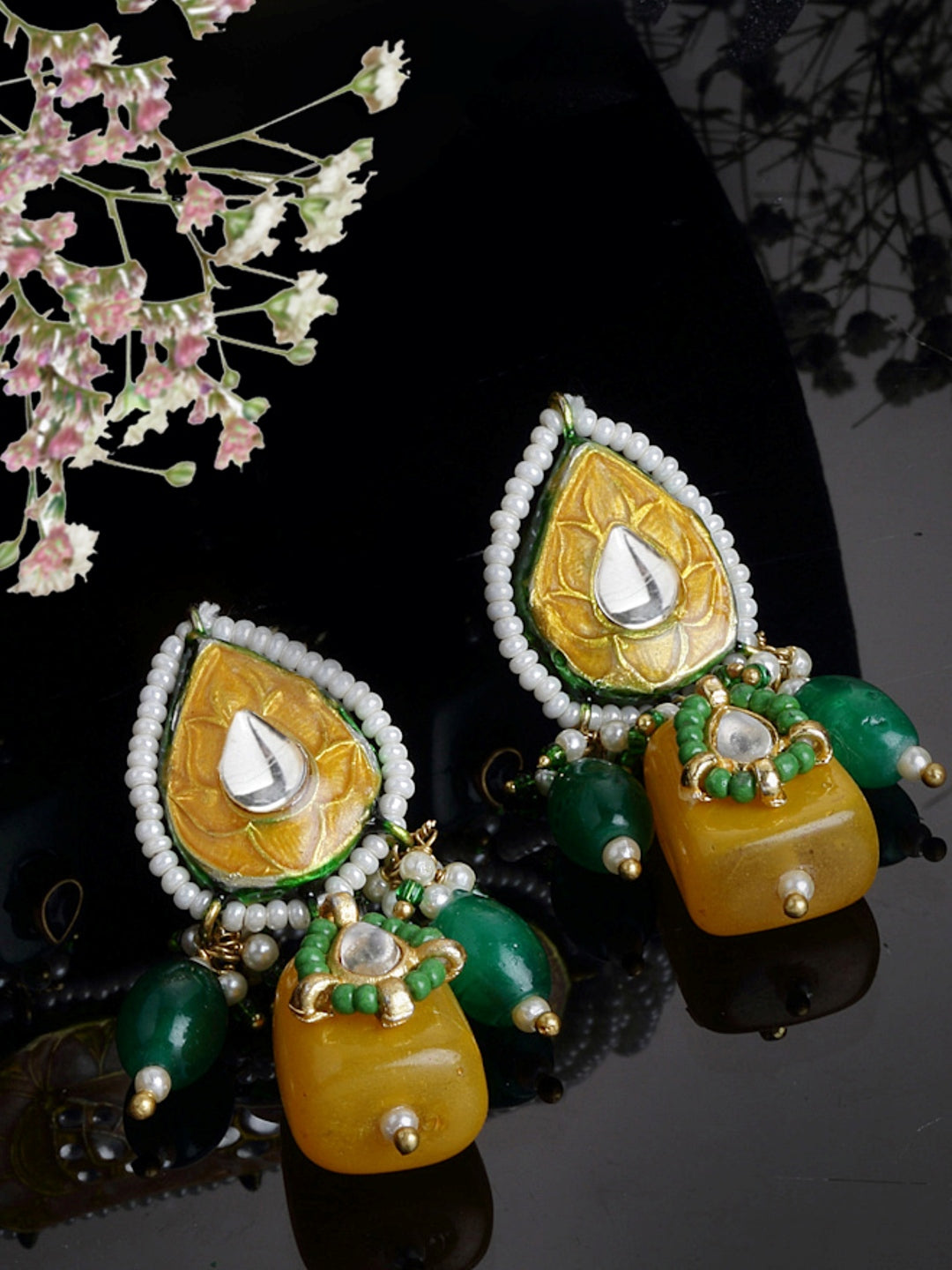 Super Light And Comfy Earrings With A Pop Of Green Color Highlighted With Yellow Sapphire Stone With Kundan Work Is What Makes This Earring Super Light And Elegant.; Category Of Jewellery Is Earring; Sub Category Is Drop; Ideal For Women; Color Is Green, Gold, White; Gemstones Used - Kundan, Pearls, Natural Stones; Plating Is Gold-Plated; Base Metal Is Alloy; Other Material Used - Closure Stopper And Kanchain; Size Is Freesize; Adjustable - No; Weight Is 8 Gms; Mesaurements - Length Of Earring= 6 Cm; Width Of Earring =2.3 Cm; Adjustable - No; Content 1 Pair Earring