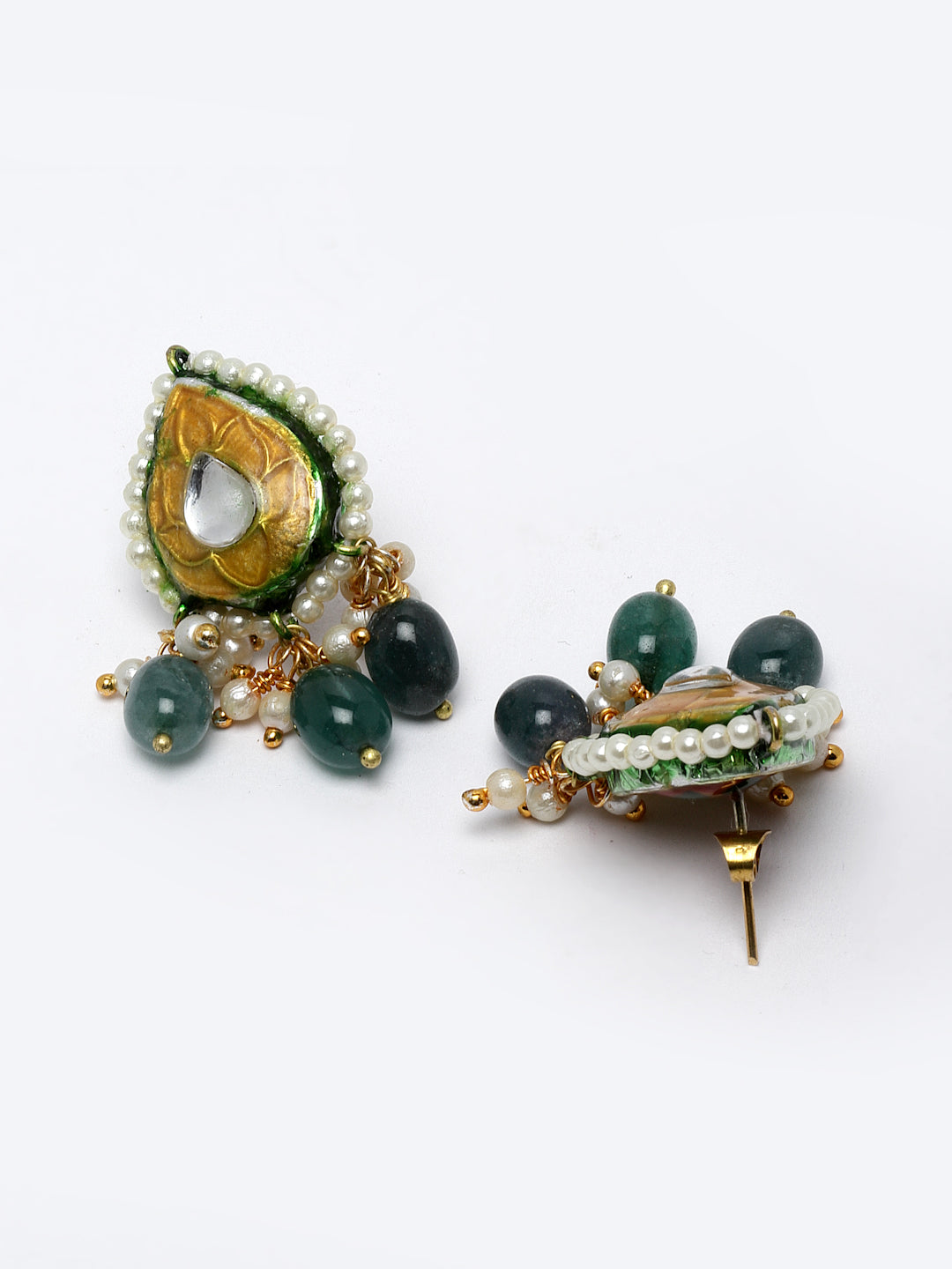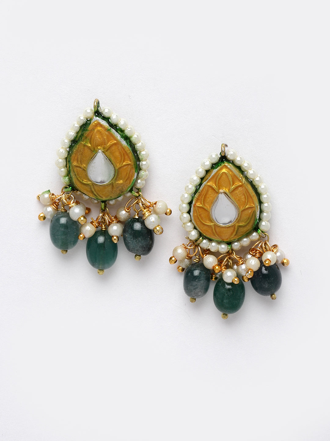 Super Light And Comfy Meenakari Handmade Top Enhanced With Semi Precious Emerld Is What Makes This Super Elegant And Everyday Earring.; Category Of Jewellery Is Earring; Sub Category Is Drop; Ideal For Women; Color Is Green, Gold, White; Gemstones Used - Kundan, Pearls, Natural Stones, Faux Emerald; Plating Is Gold-Plated; Base Metal Is Alloy; Other Material Used - Closure Stopper And Kanchain; Size Is Freesize; Adjustable - No; Weight Is 8 Gms; Mesaurements - Length Of Earring= 3.9 Cm; Width Of Earring =2.1 Cm; Adjustable - No; Content 1 Pair Earring