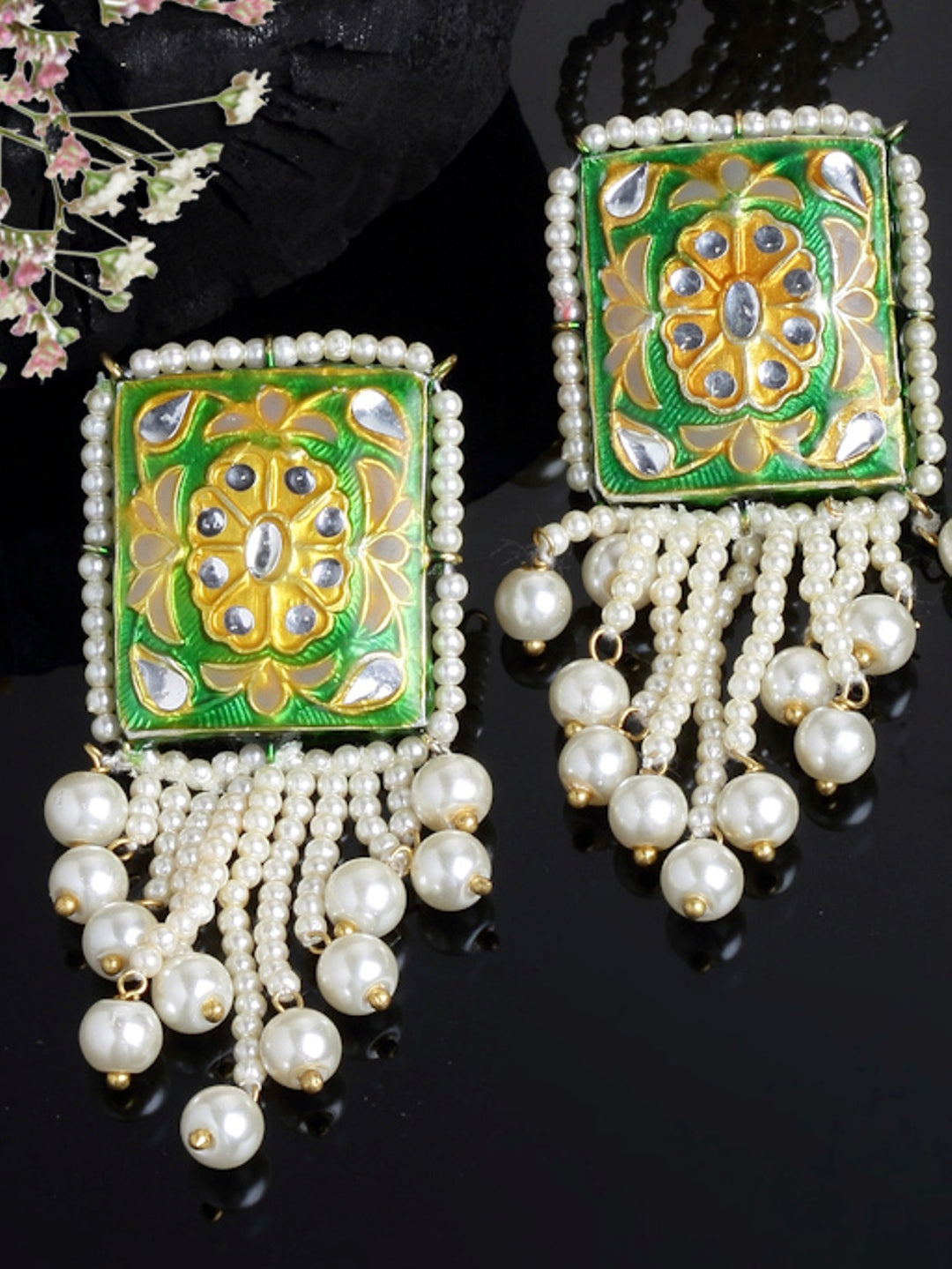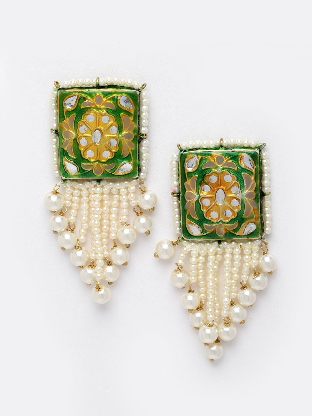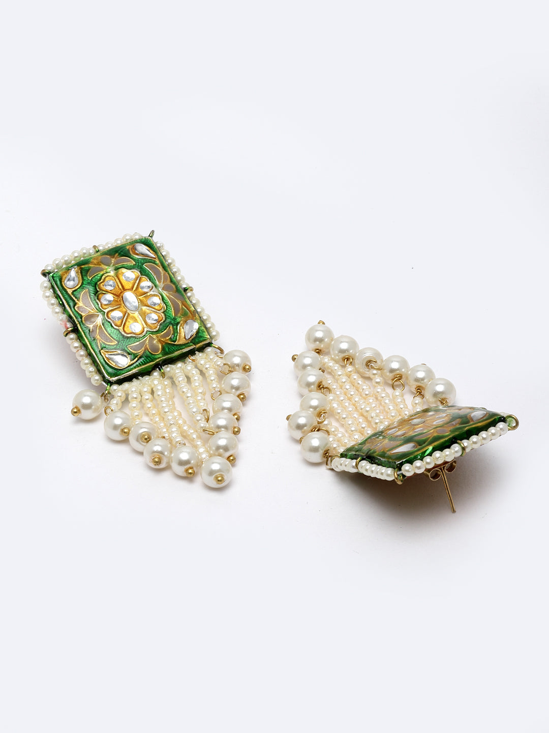 Meenakari Handmade Tikda Enhanced With Rich Meena Of Green With Tassels Of Pearl And Class Is All What It Takes To Flaunt Best Version Of You Everyday Every Occasion.; Category Of Jewellery Is Earring; Sub Category Is Drop; Ideal For Women; Color Is Green, Gold, White; Gemstones Used - Kundan, Pearls, Natural Stones; Plating Is Gold-Plated; Base Metal Is Alloy; Other Material Used - Closure Stopper And Kanchain; Size Is Freesize; Adjustable - No; Weight Is 15 Gms; Mesaurements - Length Of Earring= 7.6 Cm; Width Of Earring =2.9 Cm; Adjustable - No; Content 1 Pair Earring