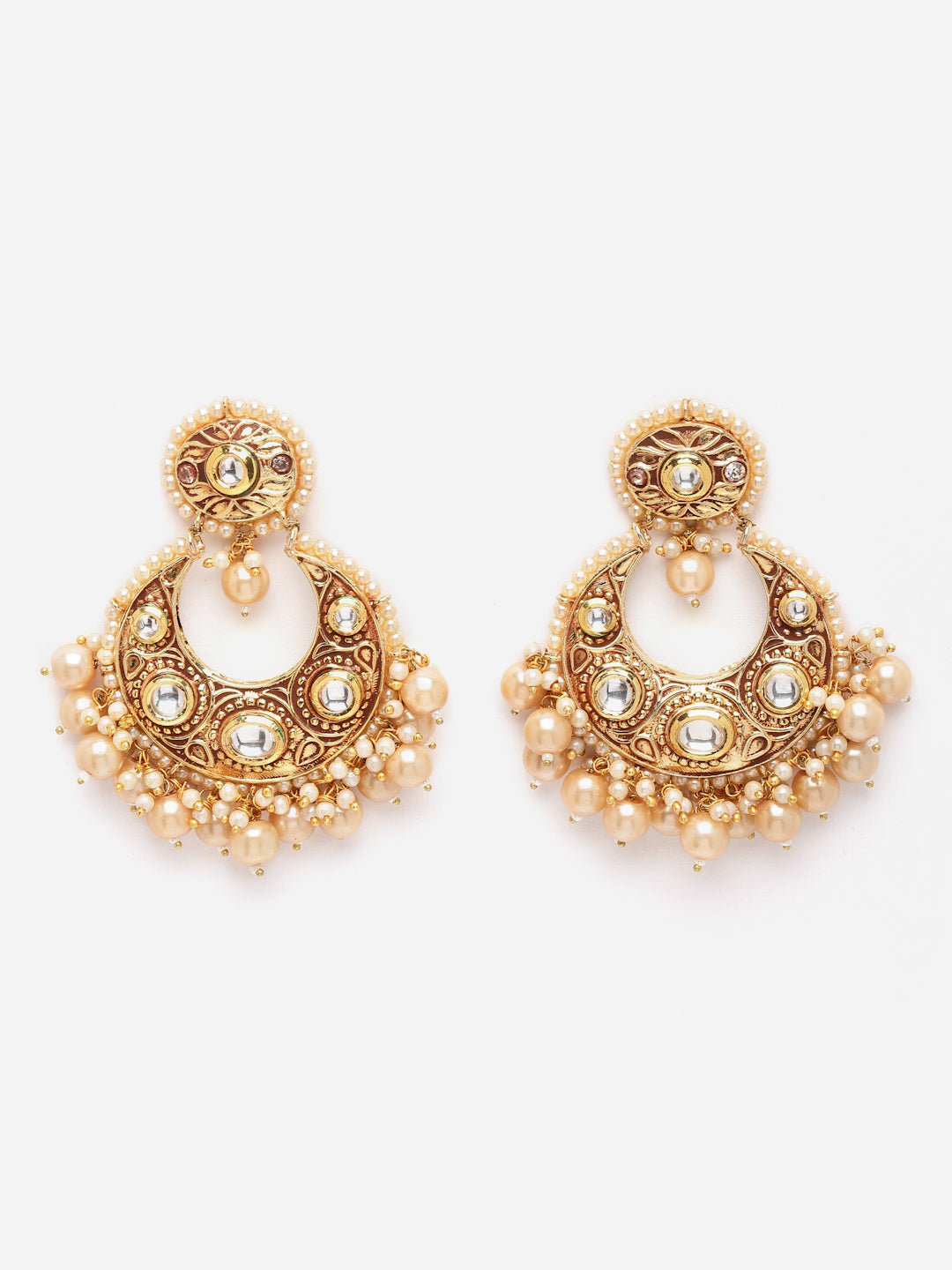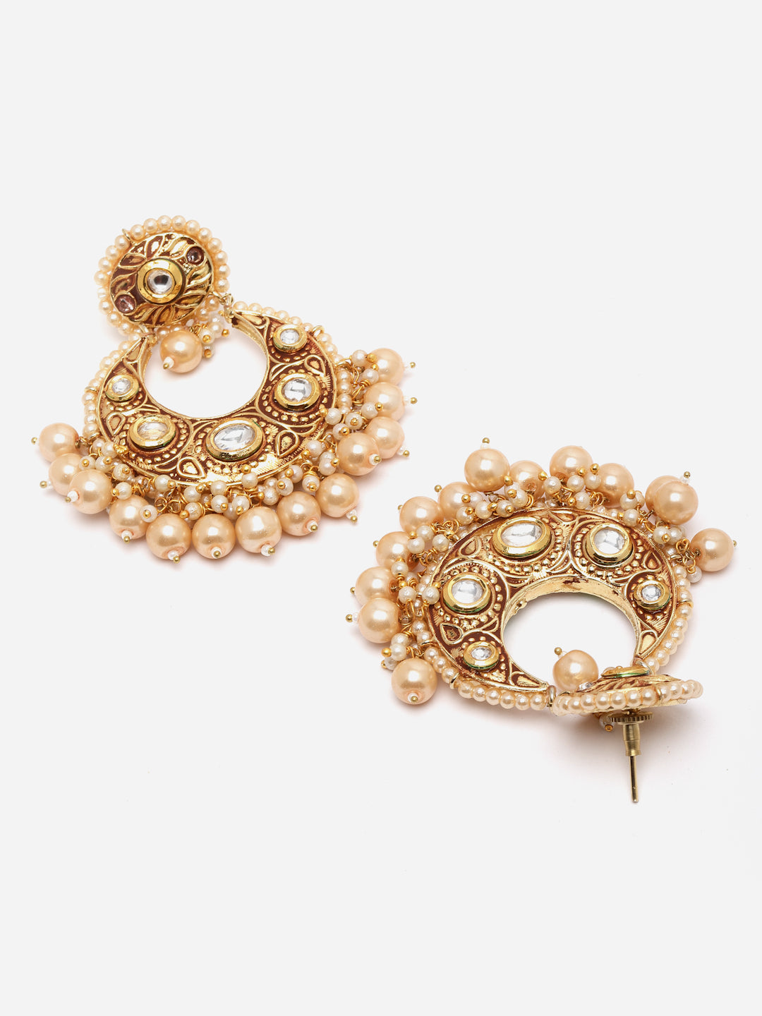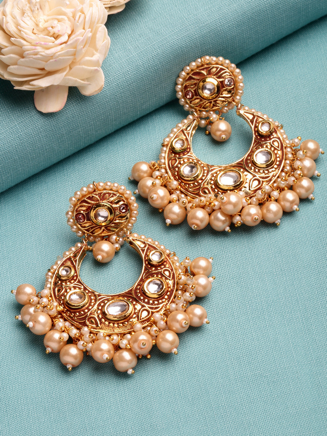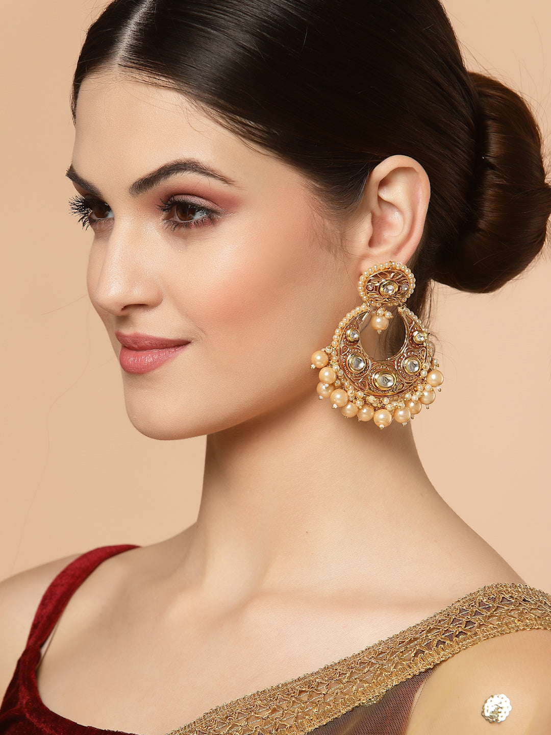 Super Elegant And Geru (Temple Finish) Chandbala With Pearl Effect Is What Makes This Jewellery Pc Unique And Elegance. Celebrate Your Festivity And Feminity This Season With Best Version Of Being You.; Category Of Jewellery Is Earring; Sub Category Is Drop; Ideal For Women; Color Is Red, Gold, Cream; Gemstones Used - Kundan, Pearls, Natural Stones; Plating Is Gold-Plated; Base Metal Is Alloy; Other Material Used - Closure Stopper And Kanchain; Size Is Freesize; Adjustable - No; Weight Is 70 Gms; Mesaurements - Length Of Earring= 8.4 Cm; Width Of Earring =7.1 Cm; Adjustable - No; Content 1 Pair Earring