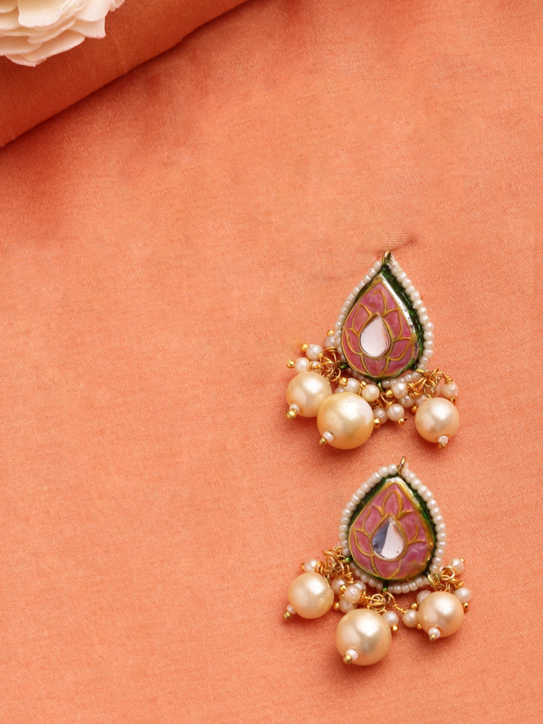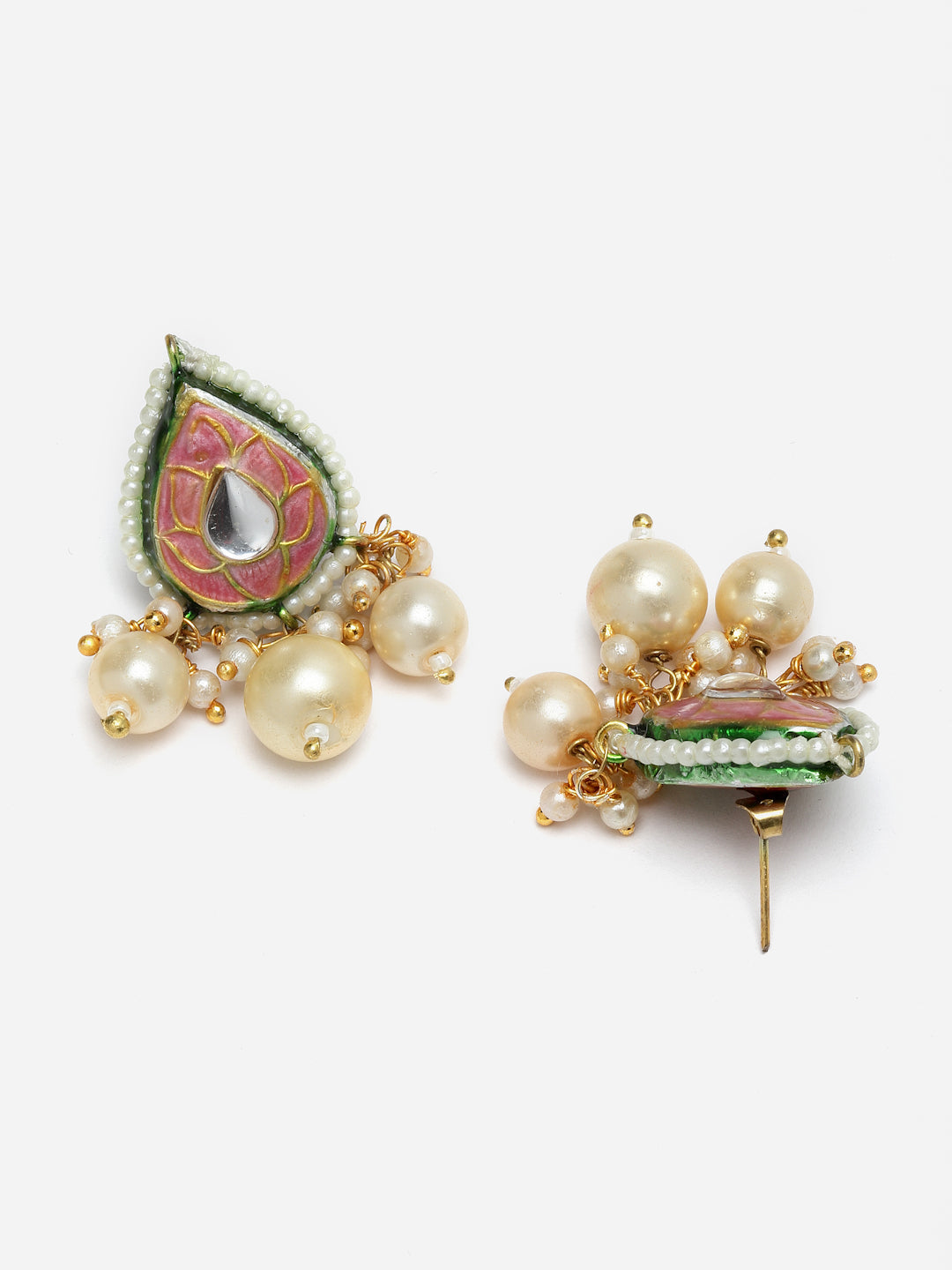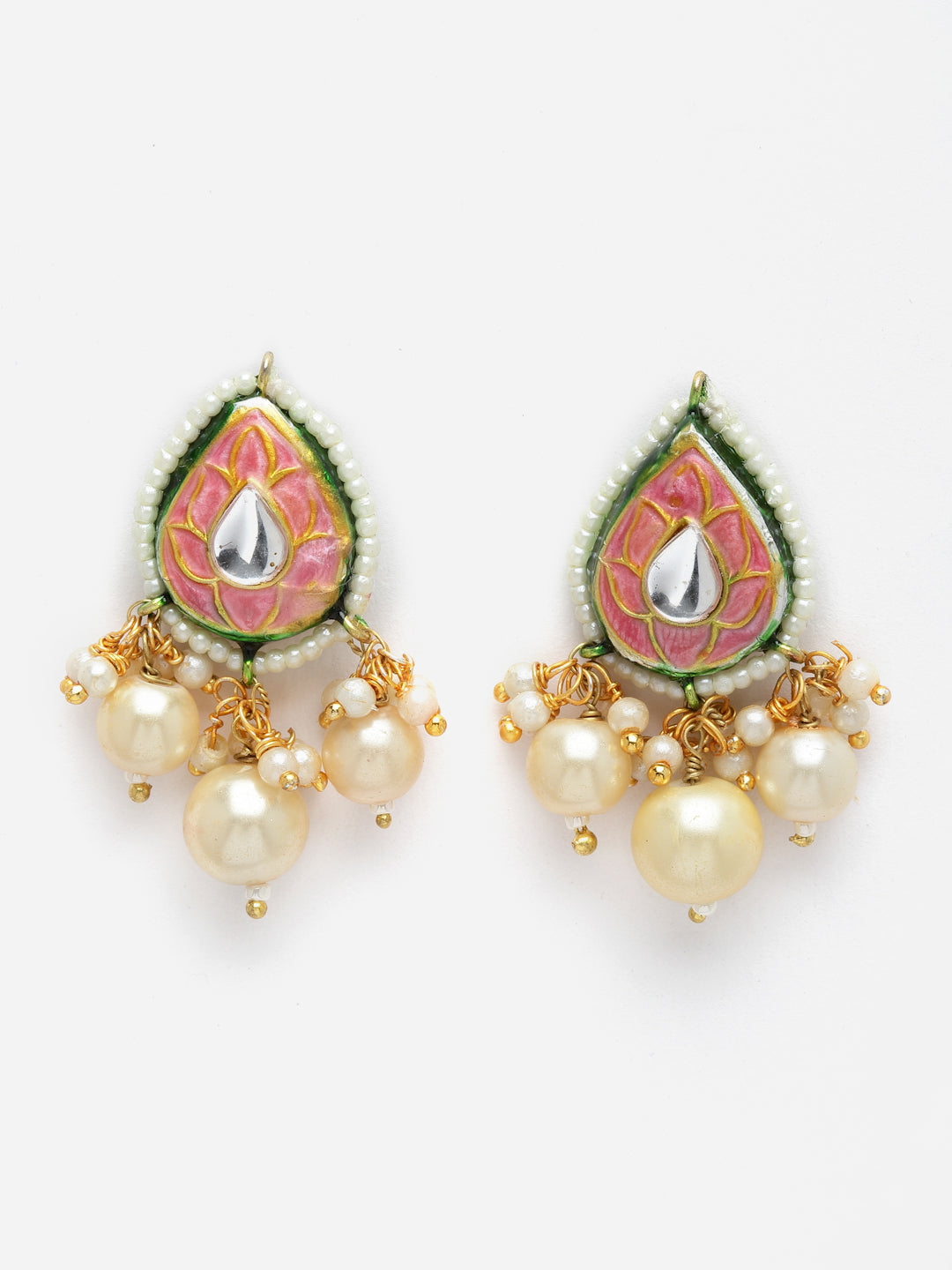 Meenakari Oink With Tinch Of Pearl And Kundan Drop In Center Is Elegant And Classy And Super Easy Pc To Flaunt. Be It Everyday Shopping Or Office Wear.; Category Of Jewellery Is Earring; Sub Category Is Drop; Ideal For Women; Color Is Pink, Gold, Cream; Gemstones Used - Kundan, Pearls, Natural Stones; Plating Is Gold-Plated; Base Metal Is Alloy; Other Material Used - Closure Stopper And Kanchain; Size Is Freesize; Adjustable - No; Weight Is 26 Gms; Mesaurements - Length Of Earring= 4.6 Cm; Width Of Earring =2.1 Cm; Adjustable - No; Content 1 Pair Earring