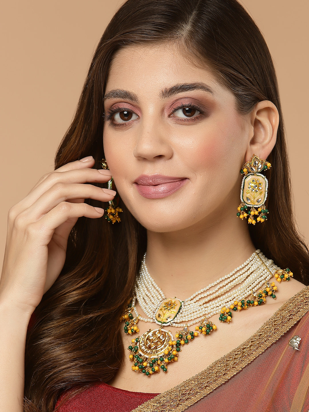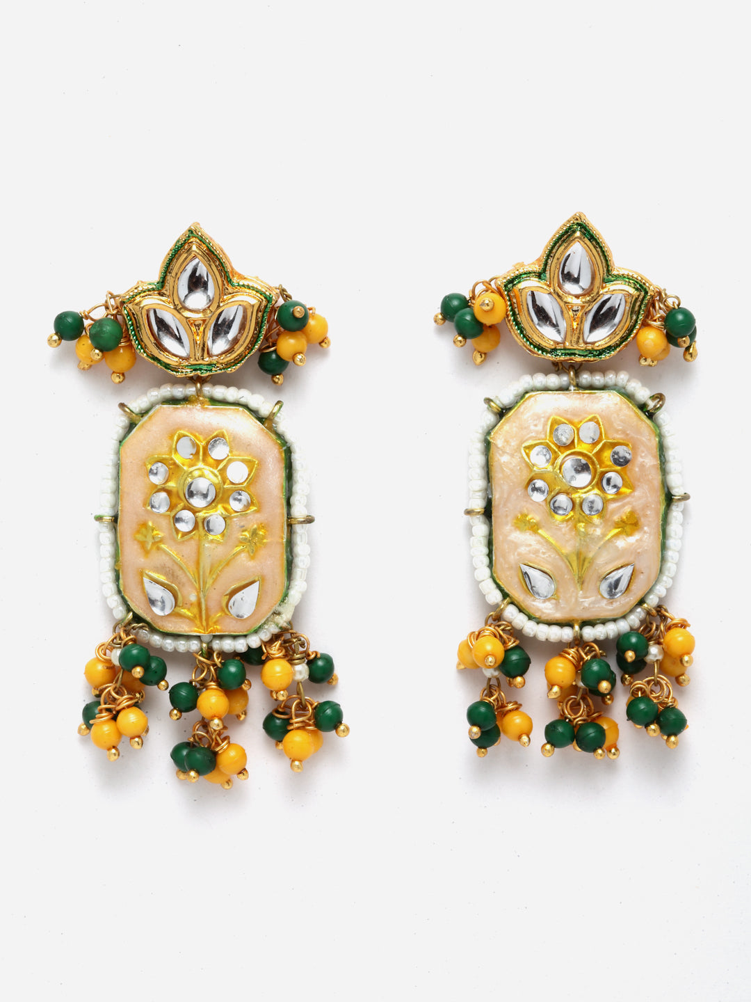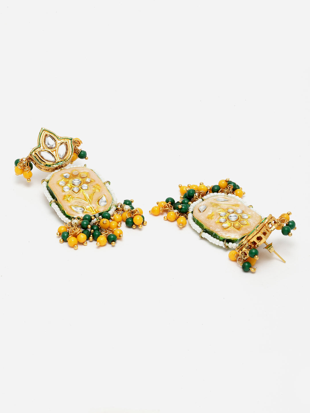 Kundan And Meenakari Amalgamation Of Ivory Meena With Yellow And Green Tinch Of Colors Is What This Pc Unique And Classy.; Category Of Jewellery Is Earring; Sub Category Is Drop; Ideal For Women; Color Is Yellow, Green, Cream, Gold, White; Gemstones Used - Kundan, Pearls, Natural Stones; Plating Is Gold-Plated; Base Metal Is Alloy; Other Material Used - Closure Stopper And Kanchain; Size Is Freesize; Adjustable - No; Weight Is 15 Gms; Mesaurements - Length Of Earring= 6.1 Cm; Width Of Earring =2.5 Cm; Adjustable - No; Content 1 Pair Earring