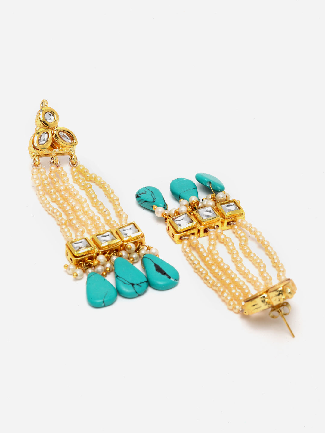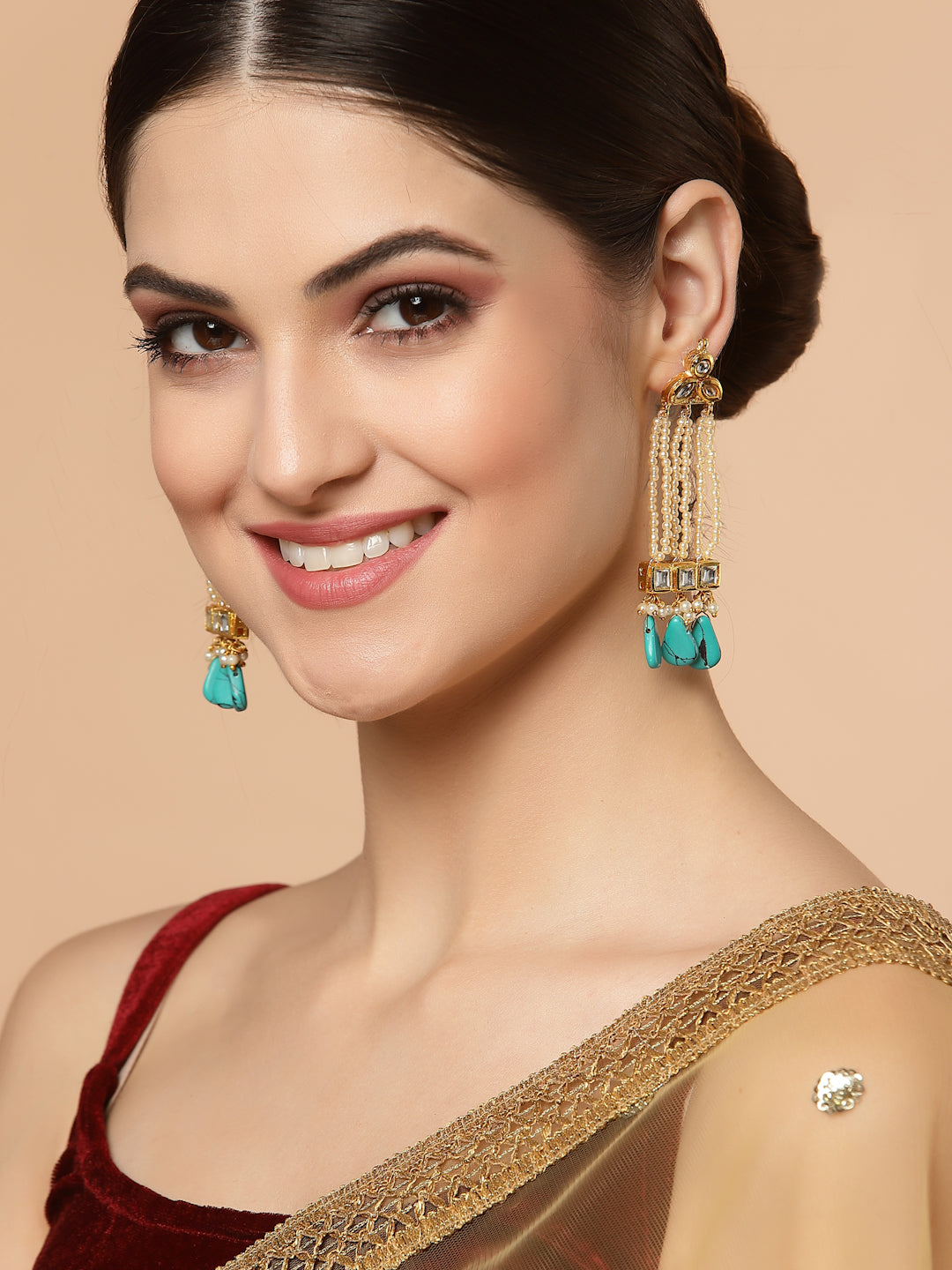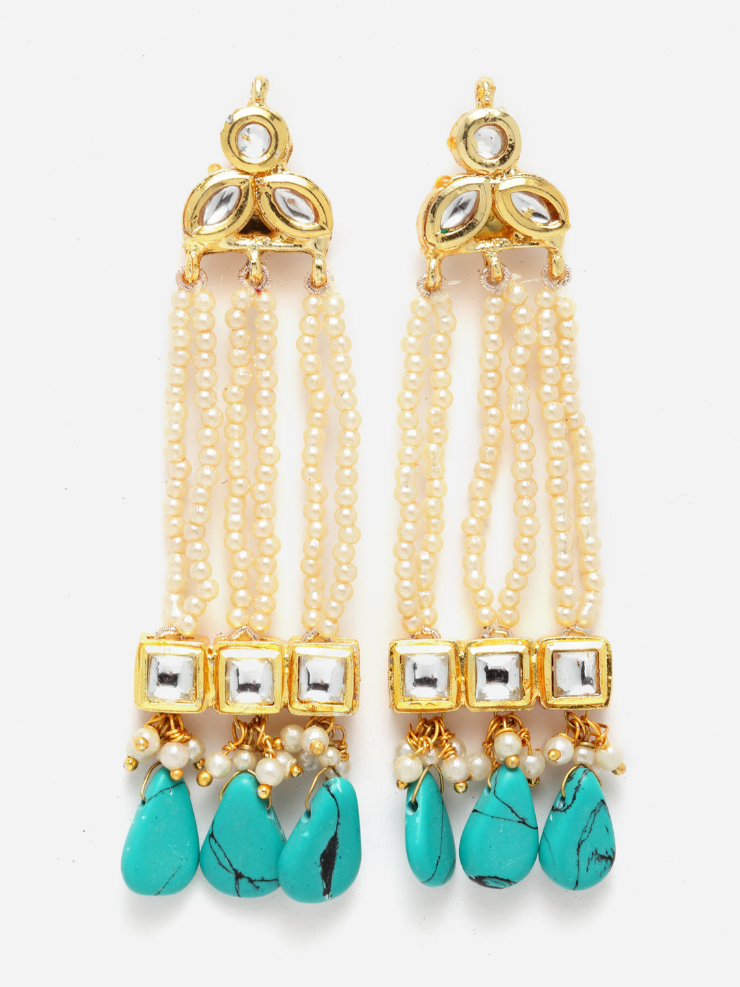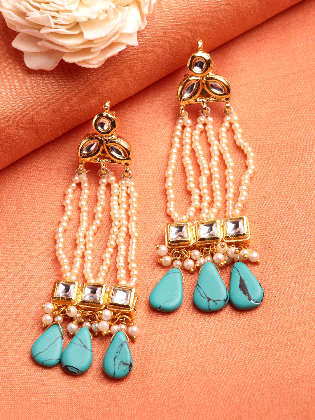 Kundan With Pearl And Firoza Stone Handmade And Flaunted To Give Us Best Version Of You In Todays World.; Category Of Jewellery Is Earring; Sub Category Is Drop; Ideal For Women; Color Is Blue, Cream, Gold, Black; Gemstones Used - Kundan, Pearls, Natural Stones; Plating Is Gold-Plated; Base Metal Is Alloy; Other Material Used - Closure Stopper And Kanchain; Size Is Freesize; Adjustable - No; Weight Is 22 Gms; Mesaurements - Length Of Earring= 9 Cm; Width Of Earring =4 Cm; Adjustable - No; Content 1 Pair Earring