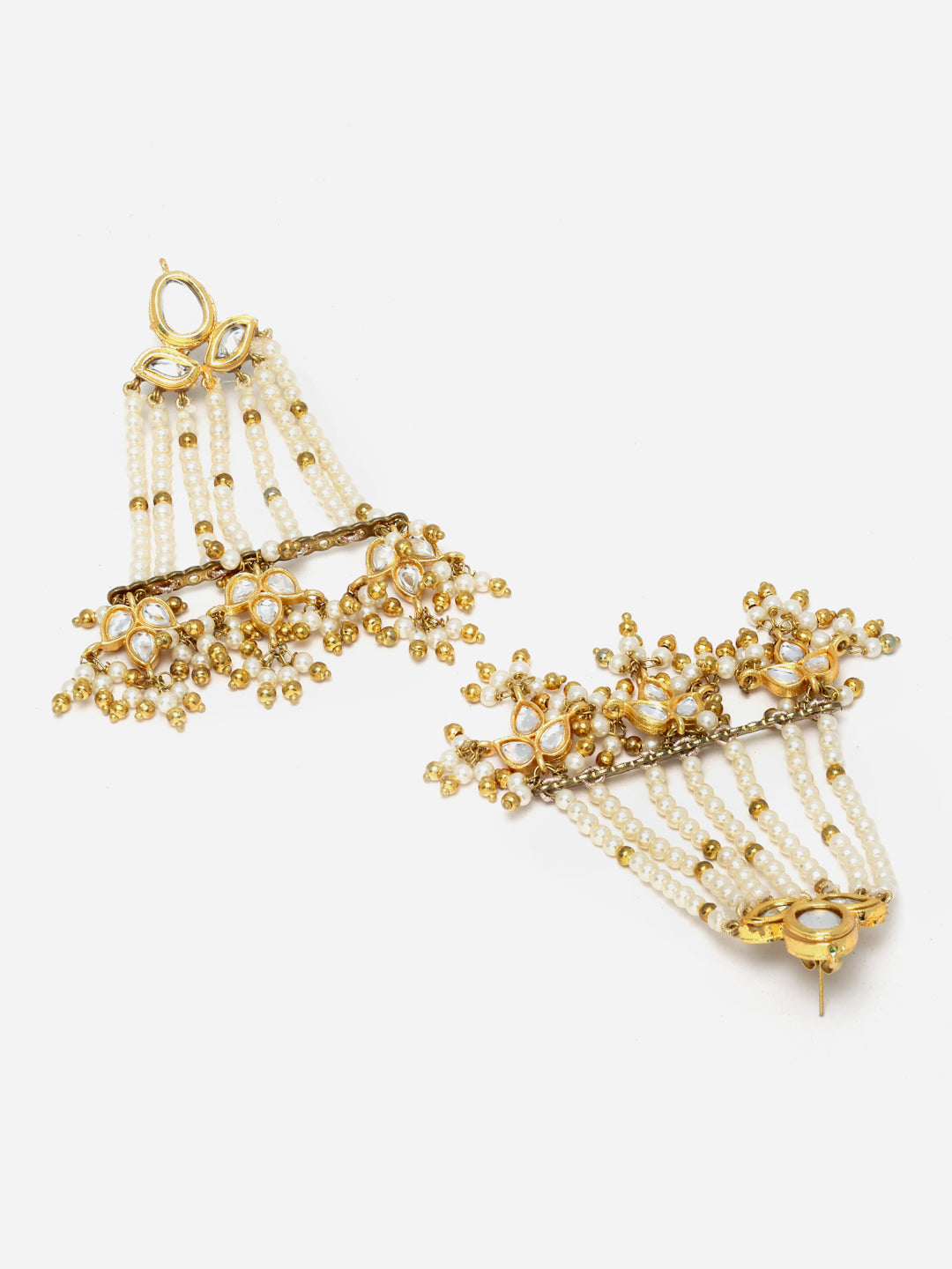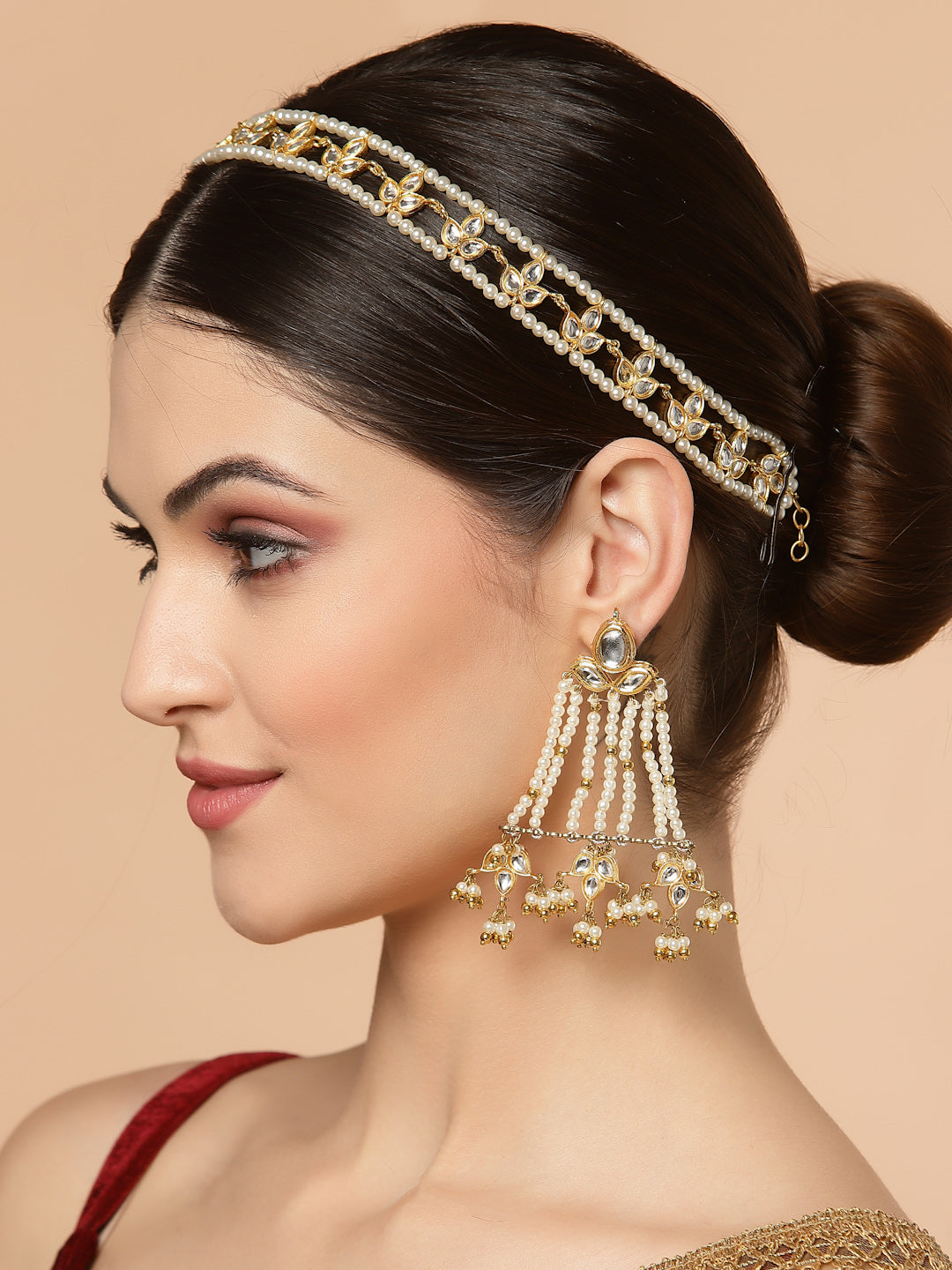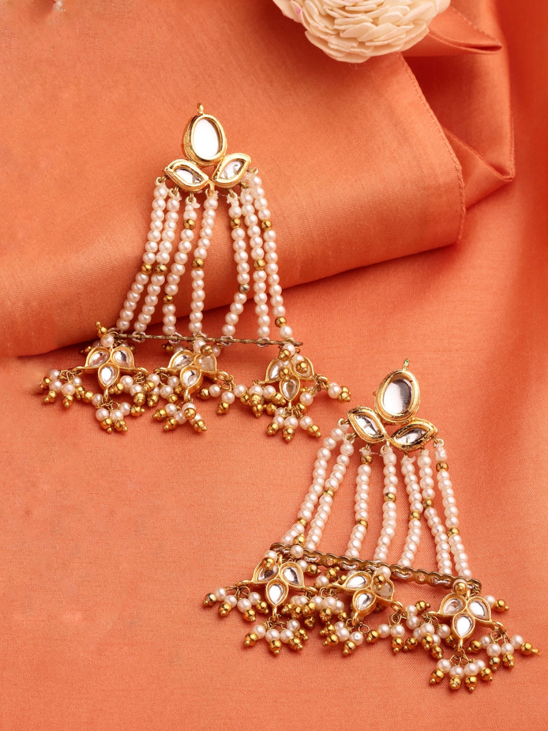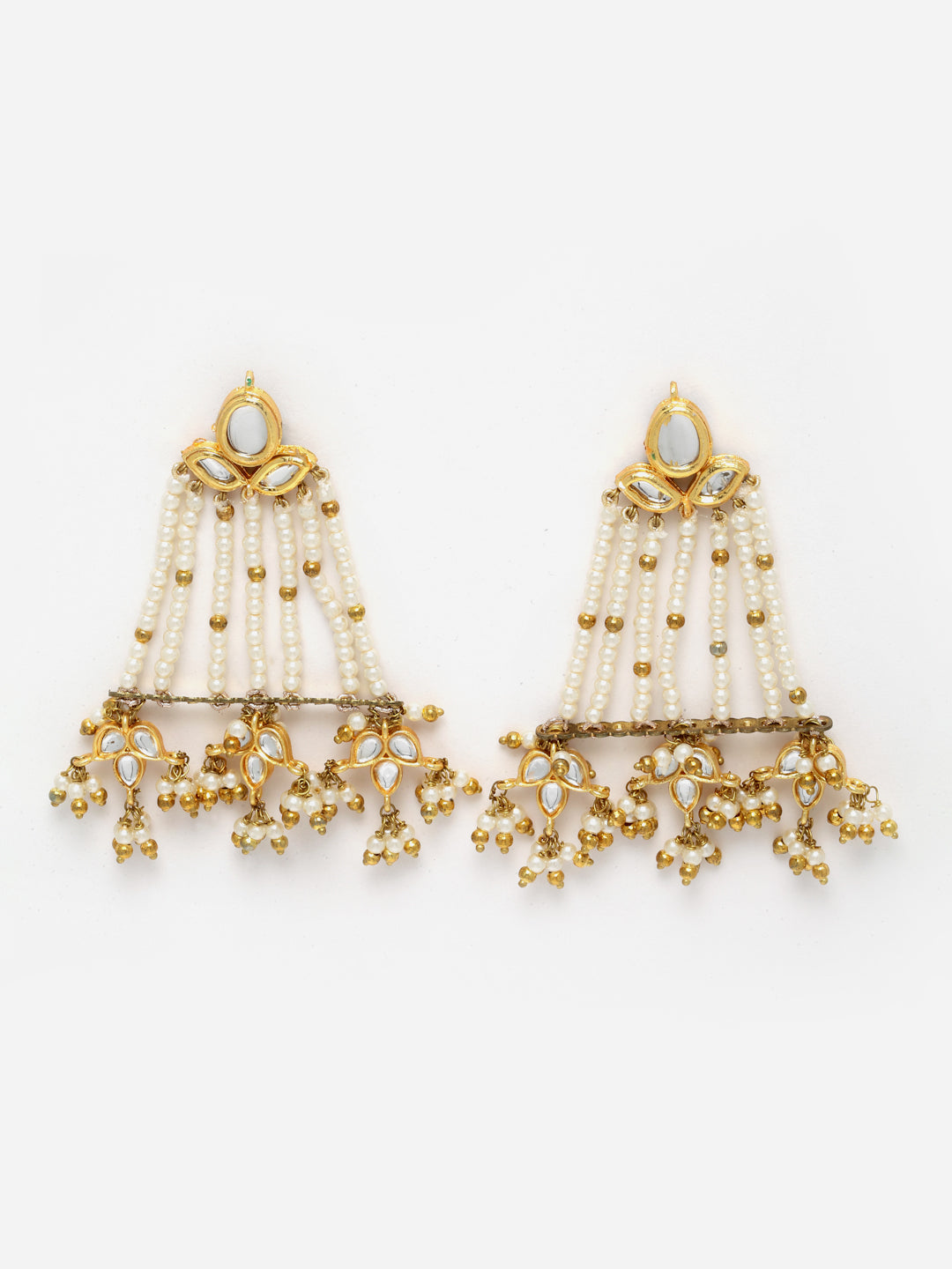 Gold And White Classic Combo Earring To Flaunt This Festive Season Is A Must For Any Wardrobe.; Category Of Jewellery Is Earring; Sub Category Is Drop; Ideal For Women; Color Is Gold, Cream; Gemstones Used - Kundan, Pearls, Natural Stones; Plating Is Gold-Plated; Base Metal Is Alloy; Other Material Used - Closure Stopper And Kanchain; Size Is Freesize; Adjustable - No; Weight Is 42 Gms; Mesaurements - Length Of Earring= 9 Cm; Width Of Earring =5.1 Cm; Adjustable - No; Content 1 Pair Earring