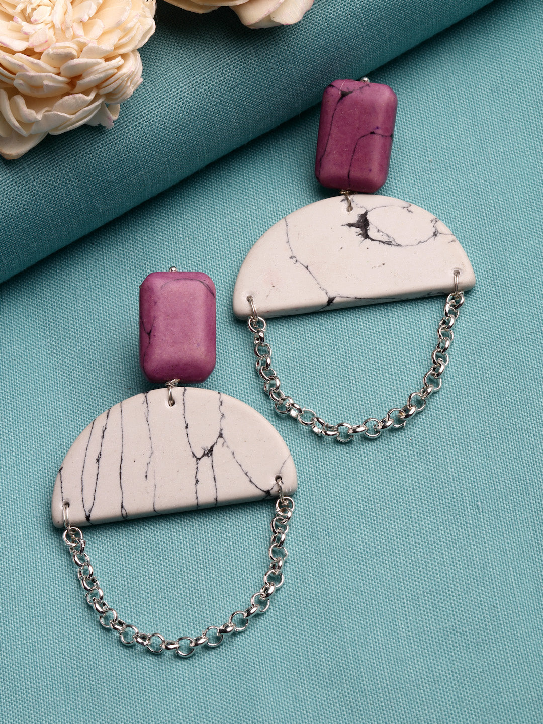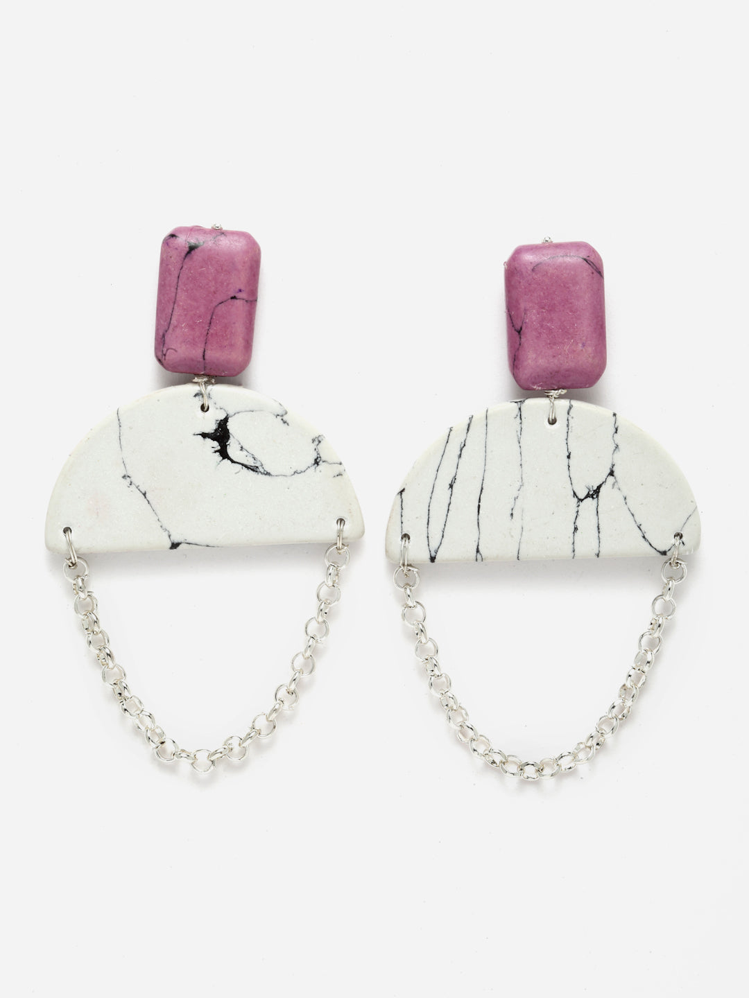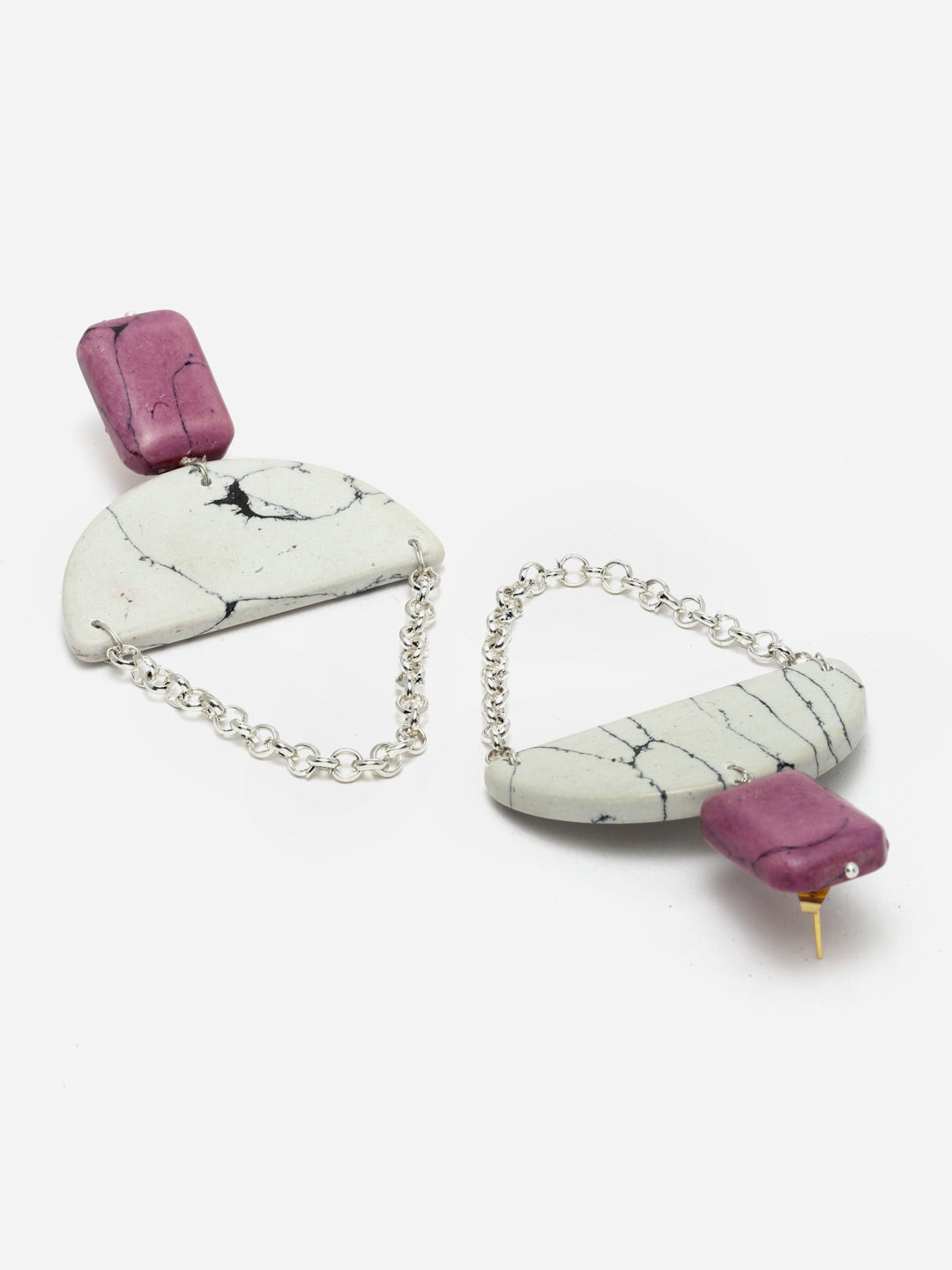 Silver Chained With Creamic Handmade Moon Shaped Stone With Tinch Of Pink As A Top States The Peace And Suttleness Of The Caracter Which Chooses This.; Category Of Jewellery Is Earring; Sub Category Is Drop; Ideal For Women; Color Is Pink, White, Gold; Gemstones Used - Kundan, Pearls, Natural Stones; Plating Is Silver-Plated; Base Metal Is Alloy; Other Material Used - Closure Stopper And Kanchain; Size Is Freesize; Adjustable - No; Weight Is 29 Gms; Mesaurements - Length Of Earring= 9 Cm; Width Of Earring =5 Cm; Adjustable - No; Content 1 Pair Earring