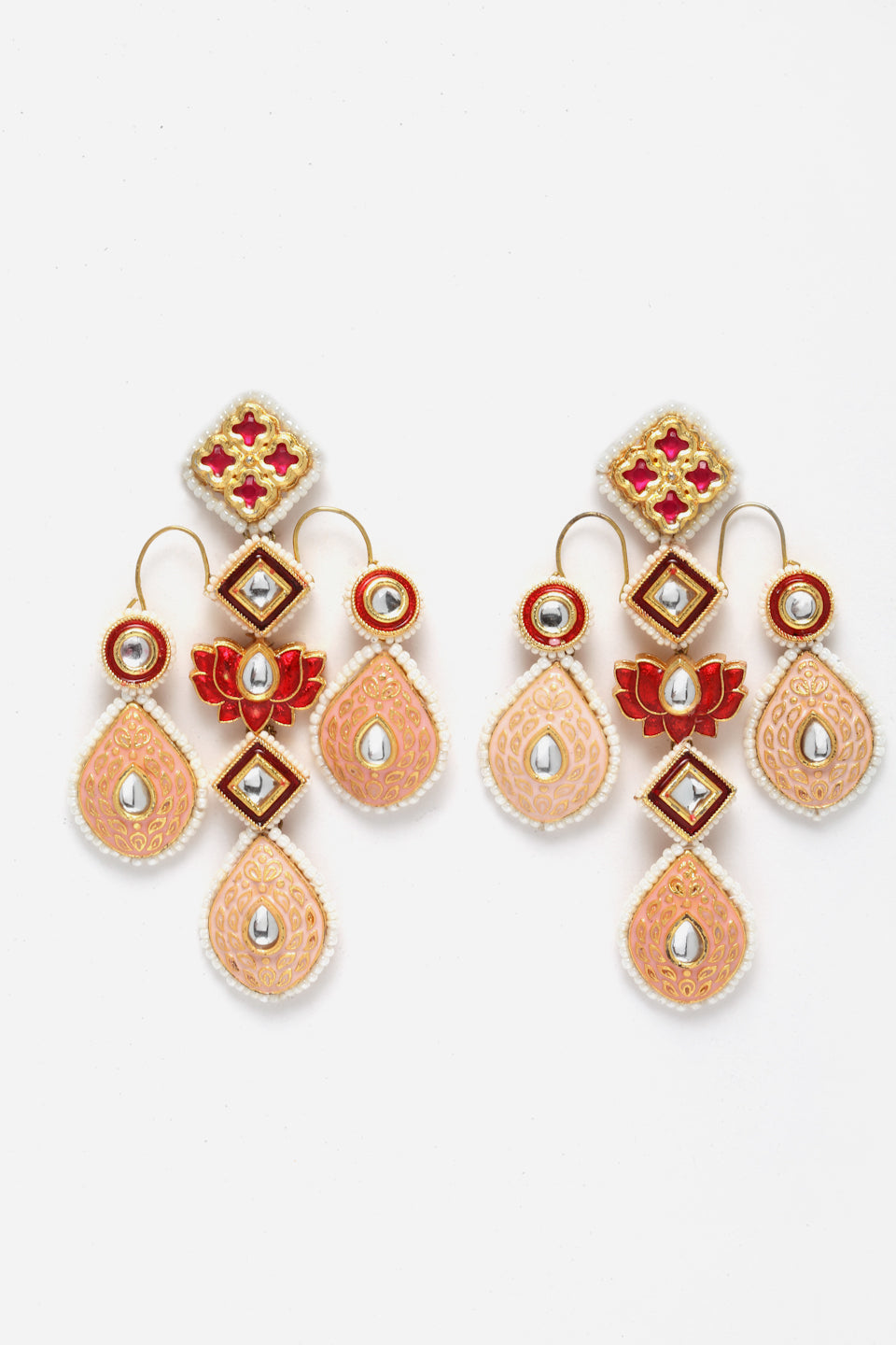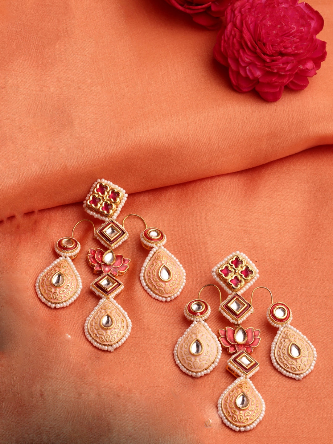 Deepika Padocone Inspired Cannes Look 2022 Earring Super Light And Elegace Of Color Choosen Is The Must Have Pc For Any One Who Is Earring Lover.; Category Of Jewellery Is Earring; Sub Category Is Drop; Ideal For Women; Color Is Pink, Red, White, Gold; Gemstones Used - Kundan, Pearls, Natural Stones; Plating Is Gold-Plated; Base Metal Is Alloy; Other Material Used - Closure Stopper And Kanchain; Size Is Freesize; Adjustable - No; Weight Is 38 Gms; Mesaurements - Length Of Earring= 9 Cm; Width Of Earring =6 Cm; Adjustable - No; Content 1 Pair Earring