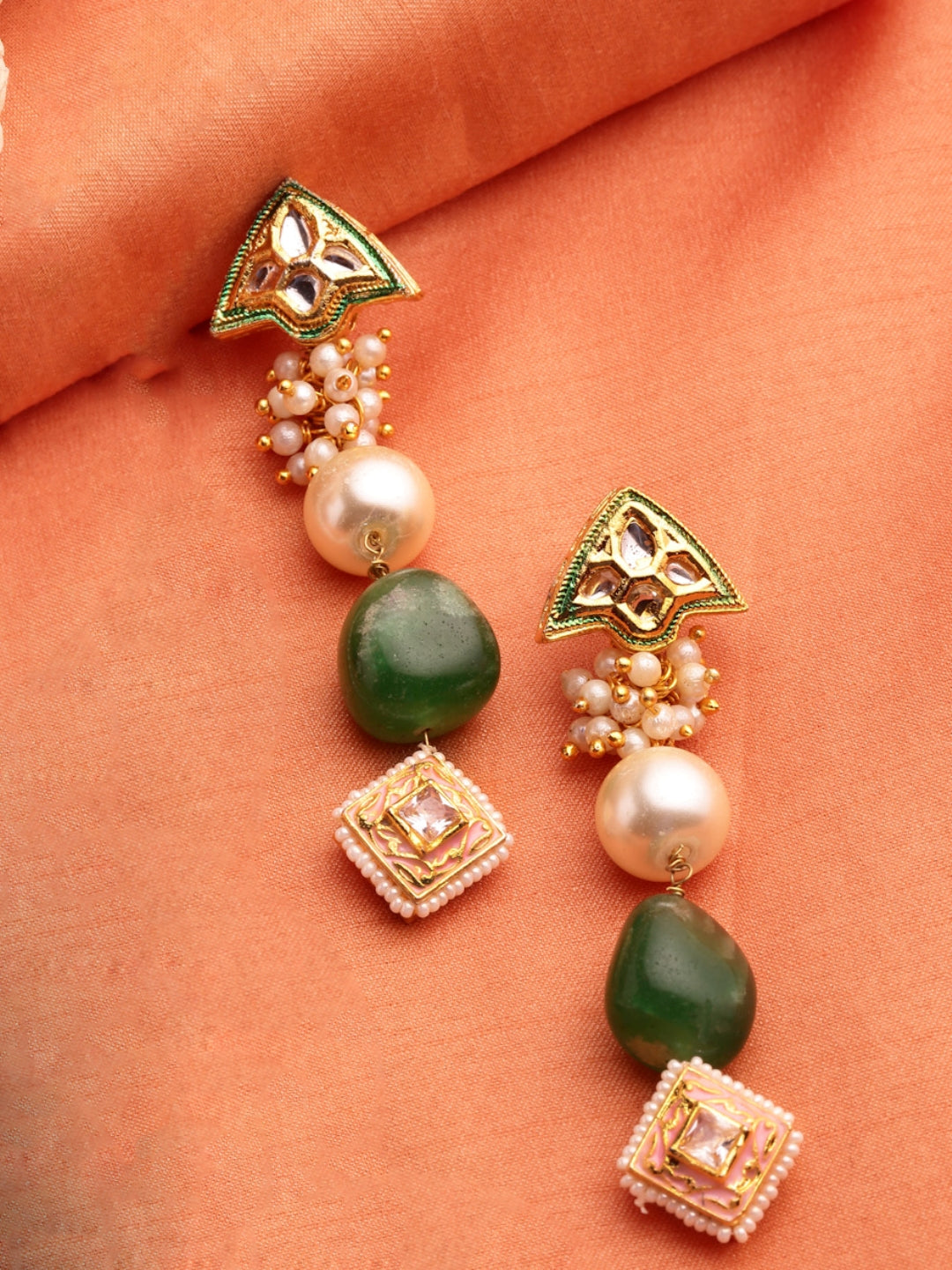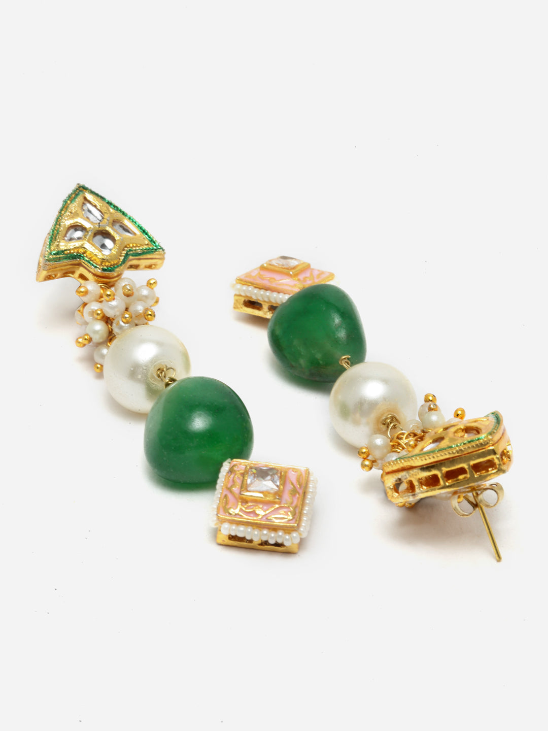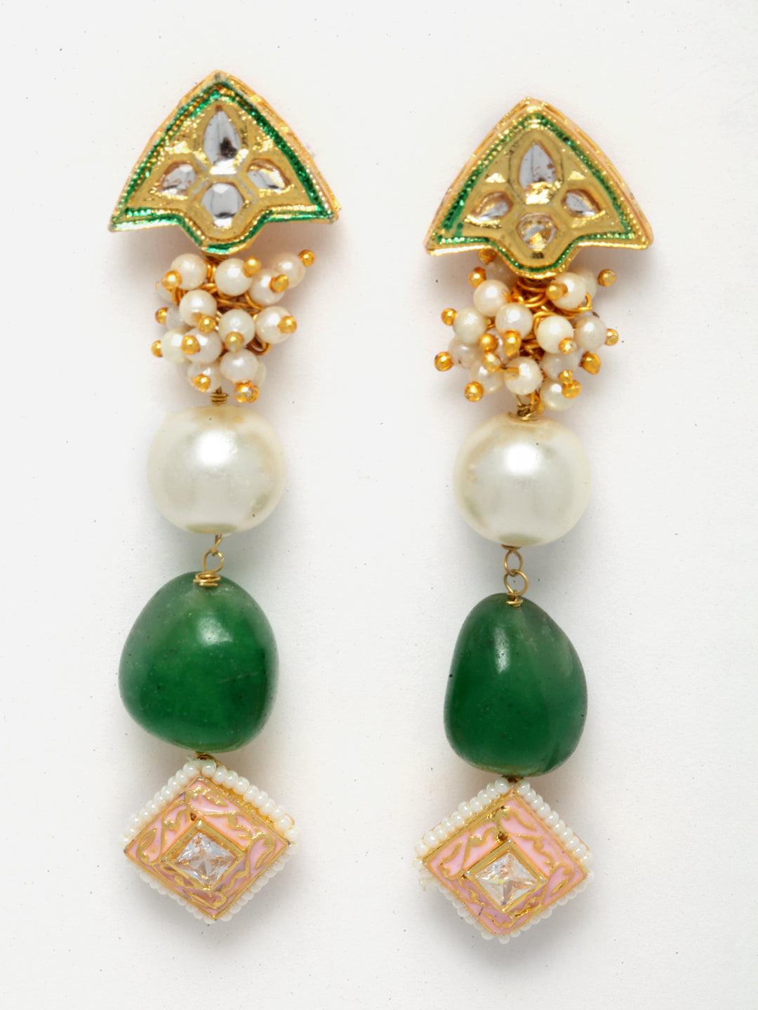 Handcrafted Super Light And Elegant Good To Go Earring Is Every Day Choiceof Any Jewellery Lover.; Category Of Jewellery Is Earring; Sub Category Is Drop; Ideal For Women; Color Is Green, Pink, Gold, White; Gemstones Used - Kundan, Pearls, Natural Stones; Plating Is Gold-Plated; Base Metal Is Alloy; Other Material Used - Closure Stopper And Kanchain; Size Is Freesize; Adjustable - No; Weight Is 25 Gms; Mesaurements - Length Of Earring= 8.5 Cm; Width Of Earring =2.5 Cm; Adjustable - No; Content 1 Pair Earring