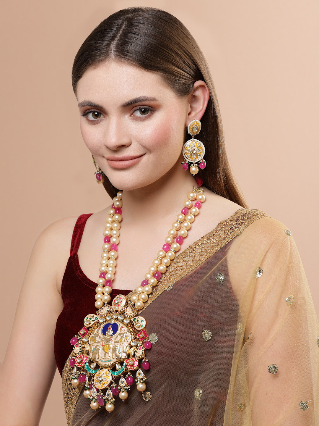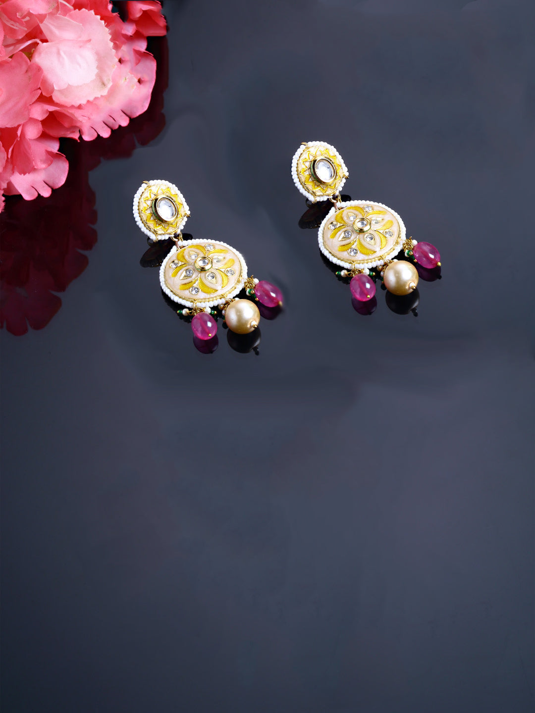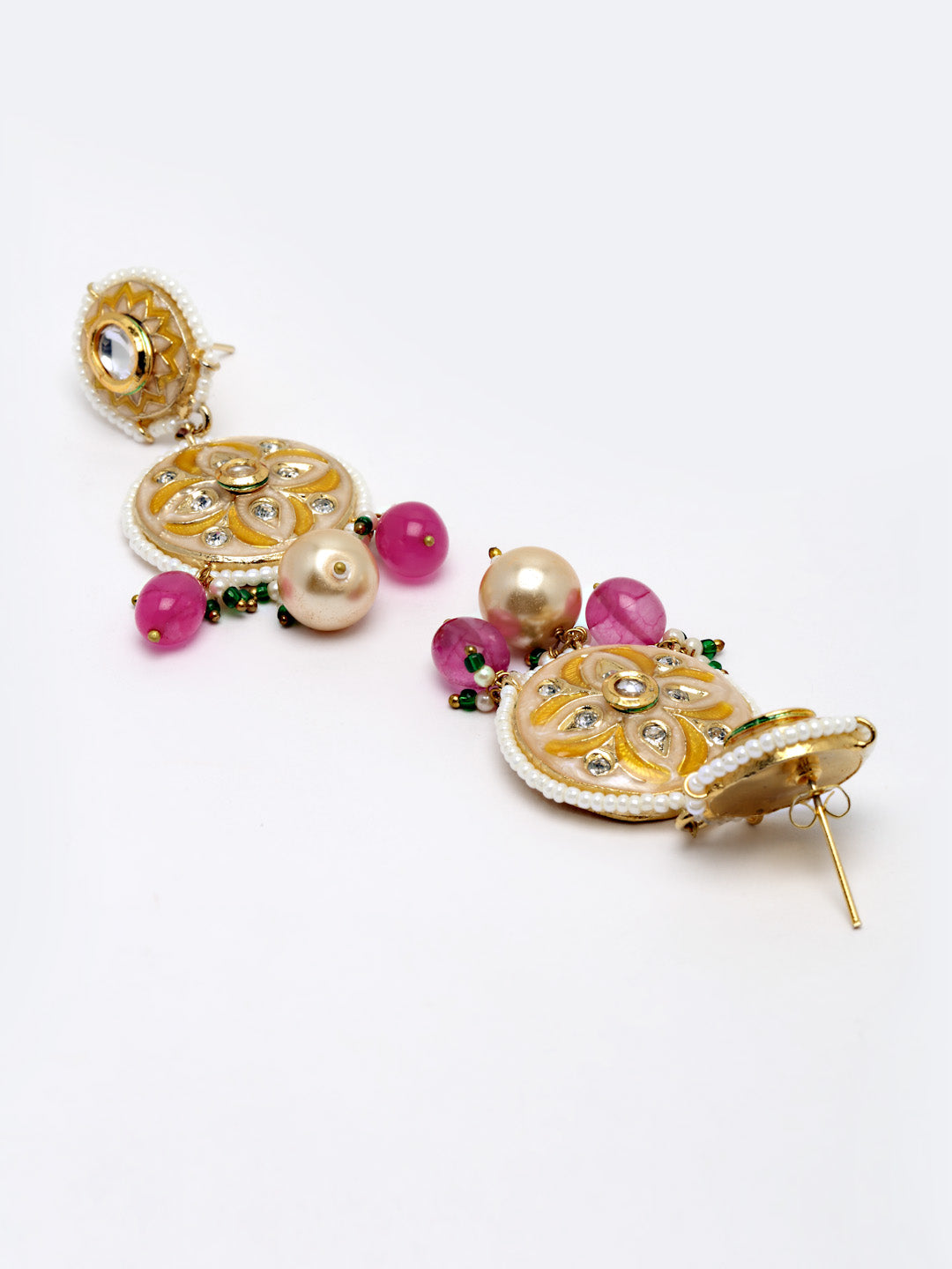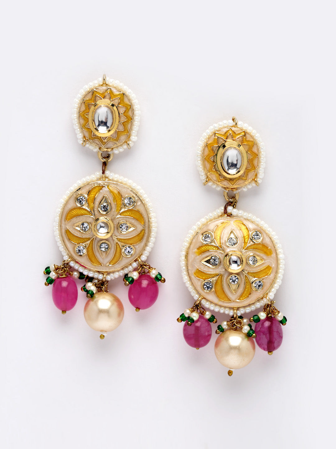 Ivory Kundan Meenakari Handmade Pc Highlighted With Ruby (Precious) Stone And Pearls Is What Makes This Color And Style Unique.; Category Of Jewellery Is Earring; Sub Category Is Drop; Ideal For Women; Color Is Pink, Cream, Gold, White, Green; Gemstones Used - Kundan, Pearls, Natural Stones; Plating Is Gold-Plated; Base Metal Is Alloy; Other Material Used - Closure Stopper And Kanchain; Size Is Freesize; Adjustable - No; Weight Is 10 Gms; Mesaurements - Length Of Earring= 5 Cm; Width Of Earring =3.5 Cm; Adjustable - No; Content 1 Pair Earring