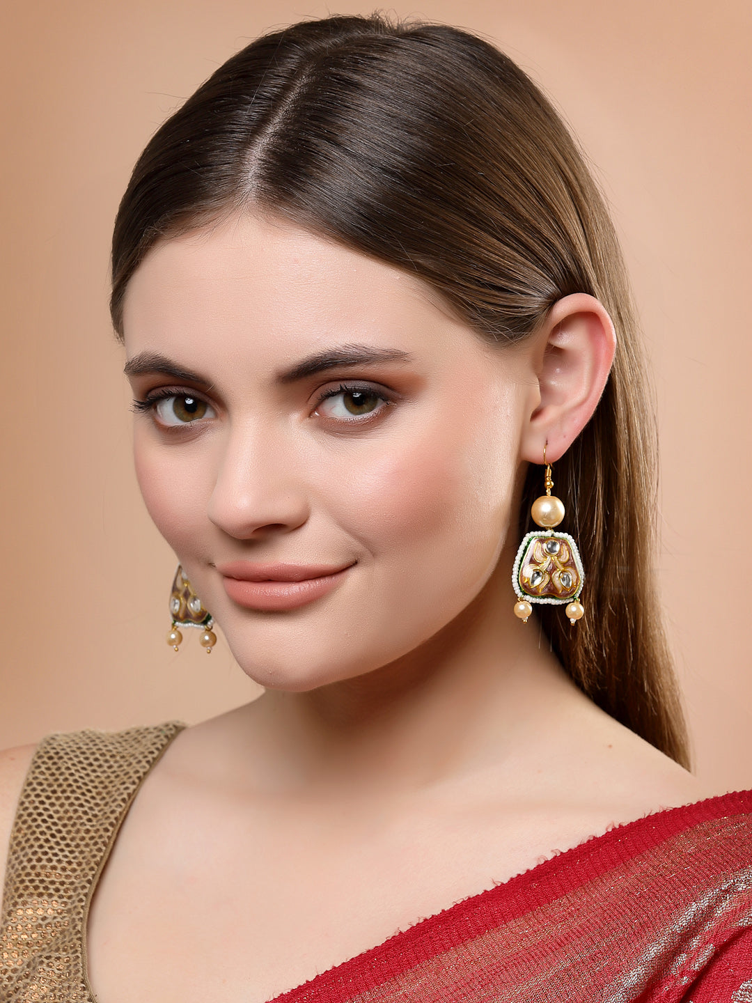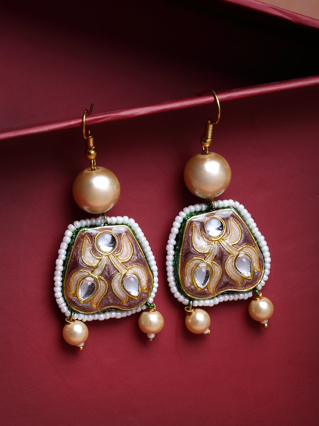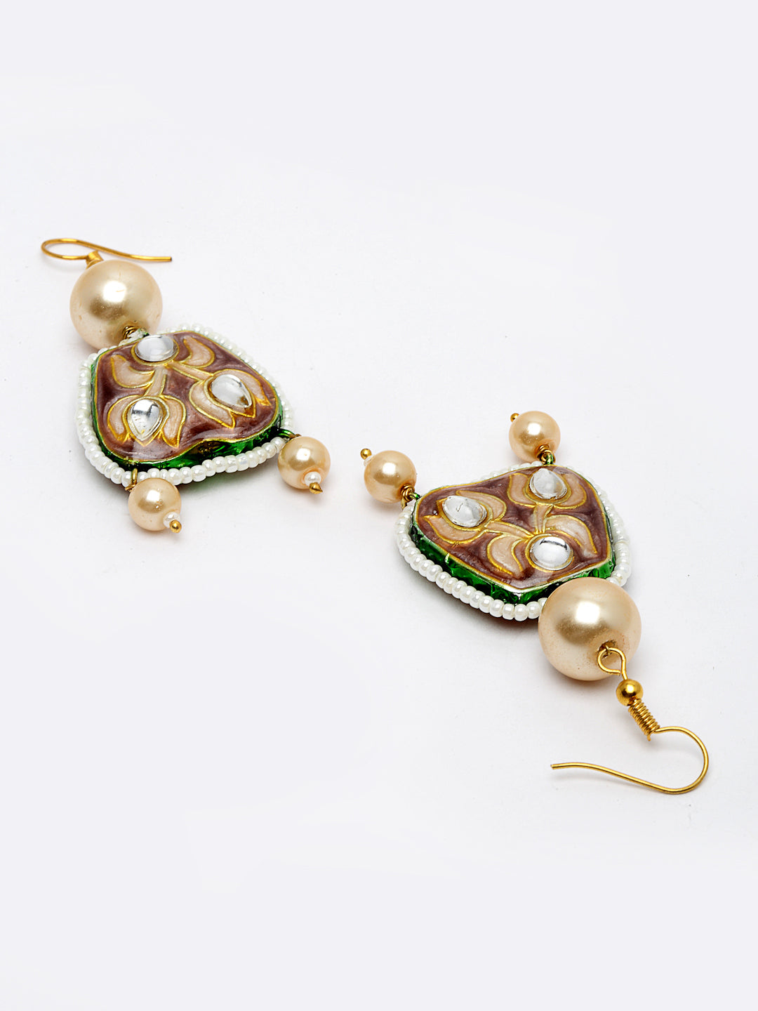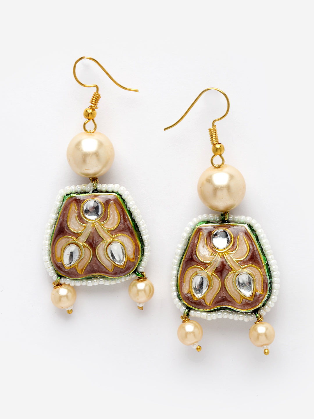 Lotus Shaped Brown Meenakari And Pearl Is Classic And Most Depicted Combo Of Earriung; Category Of Jewellery Is Earring; Sub Category Is Drop; Ideal For Women; Color Is Brown, Cream, Gold, White; Gemstones Used - Kundan, Pearls, Natural Stones; Plating Is Gold-Plated; Base Metal Is Alloy; Other Material Used - None; Size Is Freesize; Adjustable - No; Weight Is 16 Gms; Mesaurements - Length Of Earring= 7.5 Cm; Width Of Earring =3 Cm; Adjustable - No; Content 1 Pair Earring