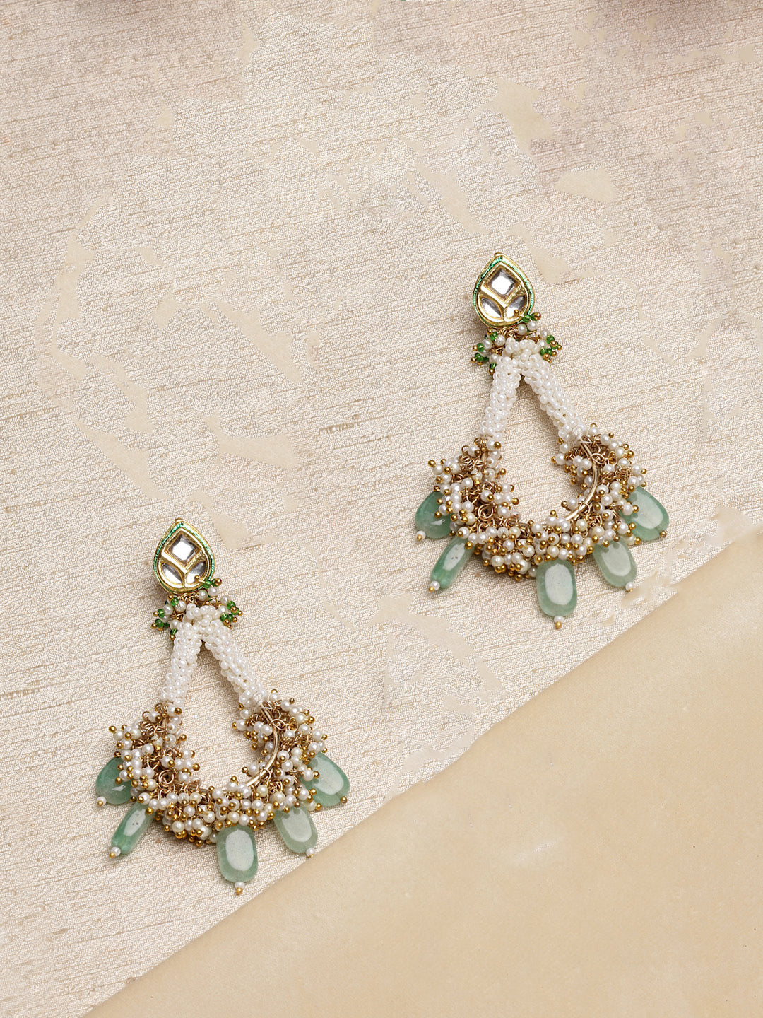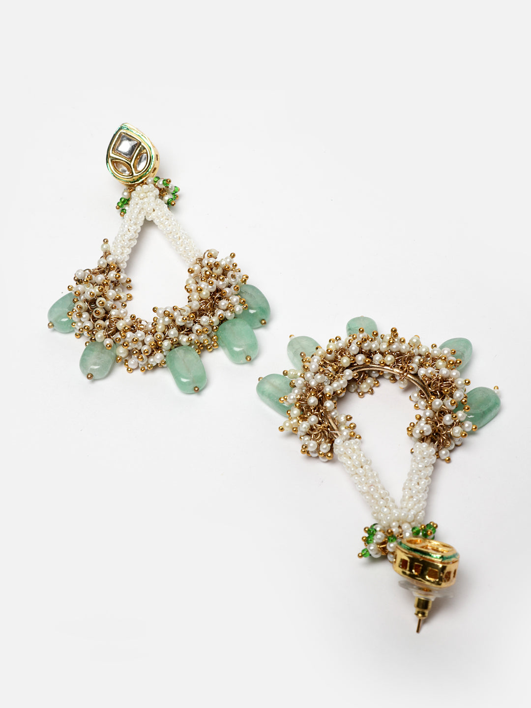 Wraped With Pearls This Design Is Done Entirely By Hand To Give U Elegance And Effect Of Handmade Jewellery With Tinch Of Light Green Stone.; Category Of Jewellery Is Earring; Sub Category Is Drop; Ideal For Women; Color Is Green, Gold, White, Cream; Gemstones Used - Kundan, Pearls, Natural Stones, Faux Emerald; Plating Is Gold-Plated; Base Metal Is Alloy; Other Material Used - Closure Stopper And Kanchain; Size Is Freesize; Adjustable - No; Weight Is 53 Gms; Mesaurements - Length Of Earring= 10.1 Cm; Width Of Earring =5.5 Cm; Adjustable - No; Content 1 Pair Earring