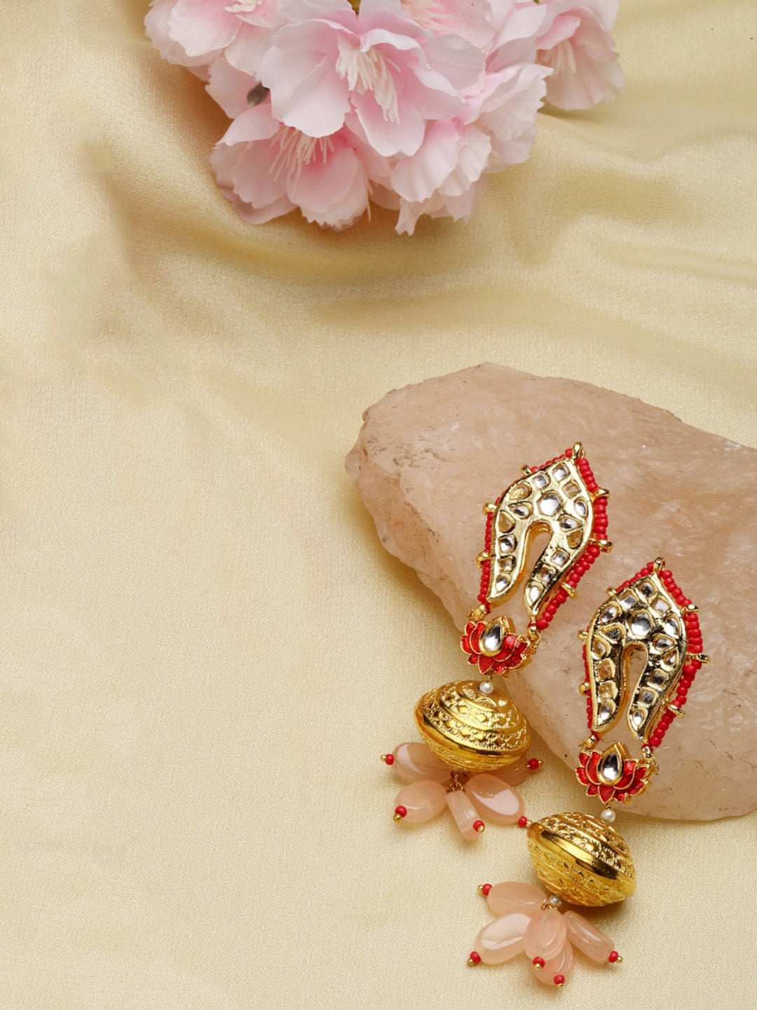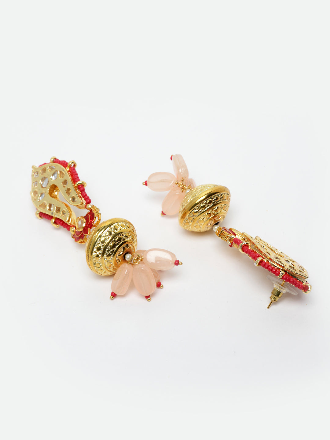 Pink Andcoral Color Poped In Boadla Earring With Ball Of Gold Plating With Kundan.; Category Of Jewellery Is Earring; Sub Category Is Drop; Ideal For Women; Color Is Pink, Red, Orange, Gold, White; Gemstones Used - Kundan, Pearls, Natural Stones, Faux Pink Sapphire; Plating Is Gold-Plated; Base Metal Is Alloy; Other Material Used - Closure Stopper And Kanchain; Size Is Freesize; Adjustable - No; Weight Is 30 Gms; Mesaurements - Length Of Earring= 8 Cm; Width Of Earring =2.5 Cm; Adjustable - No; Content 1 Pair Earring