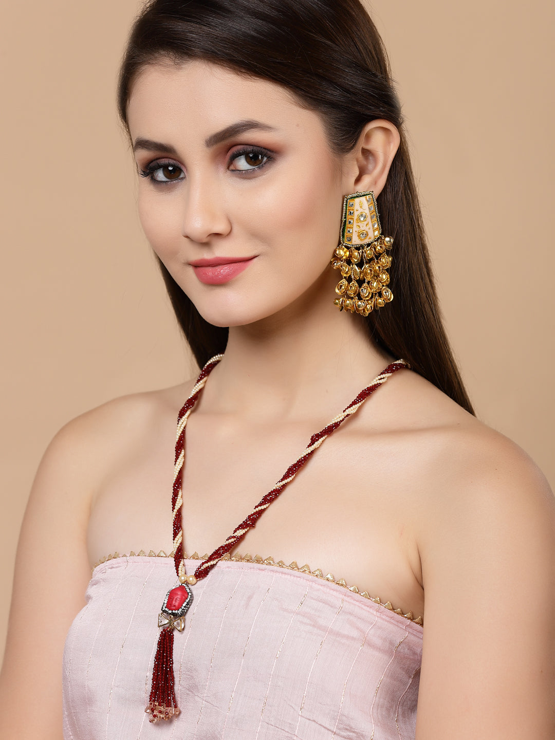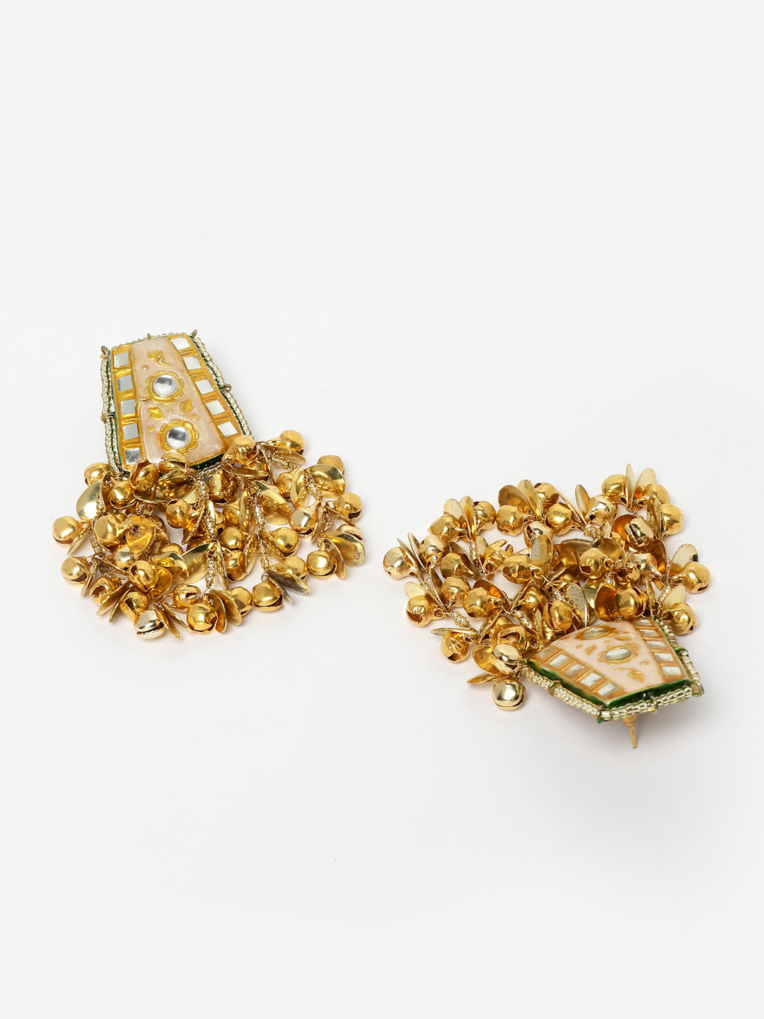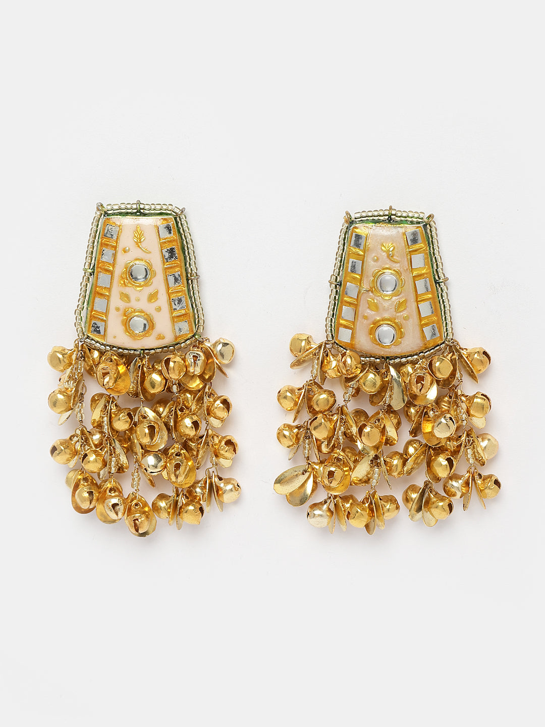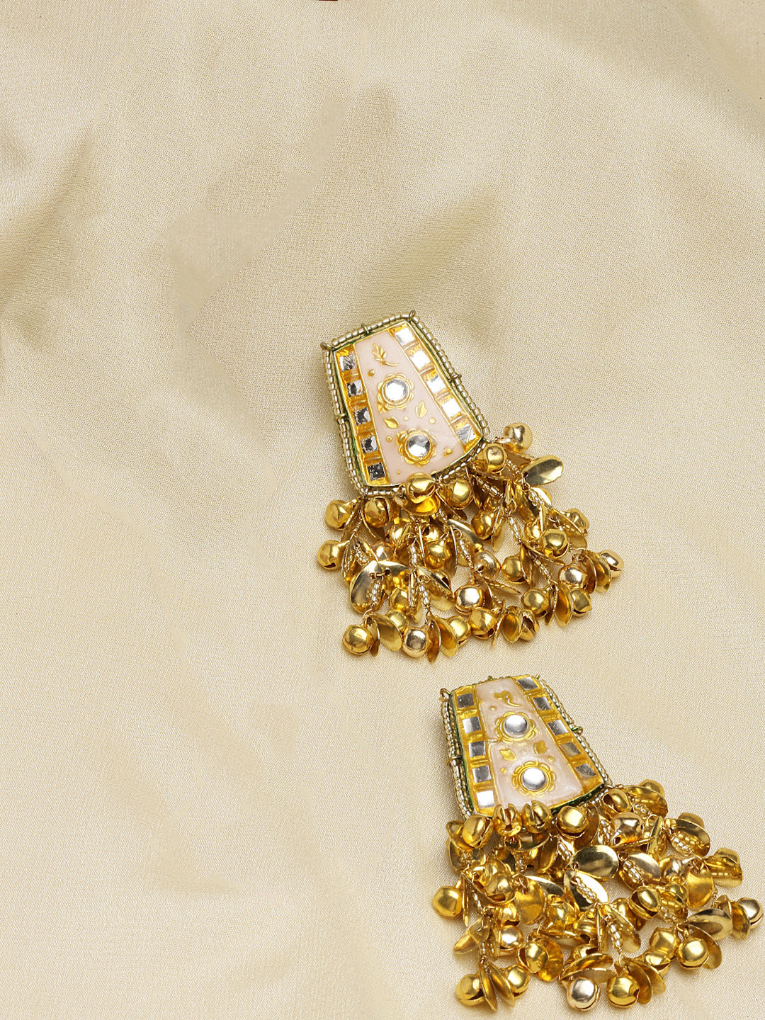 Gold Ghunghru And Meenakari Earring To Give U Another Option Of Boho Look Earring.; Category Of Jewellery Is Earring; Sub Category Is Drop; Ideal For Women; Color Is Pink, Gold, White; Gemstones Used - Kundan, Pearls, Natural Stones; Plating Is Gold-Plated; Base Metal Is Alloy; Other Material Used - Closure Stopper And Kanchain; Size Is Freesize; Adjustable - No; Weight Is 55 Gms; Mesaurements - Length Of Earring= 8.2 Cm; Width Of Earring =4.2 Cm; Adjustable - No; Content 1 Pair Earring