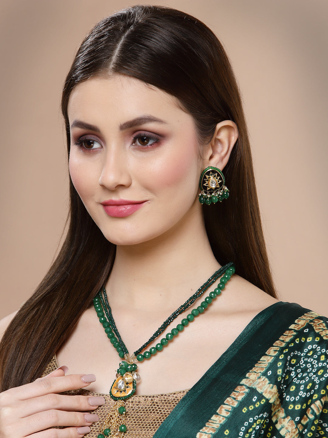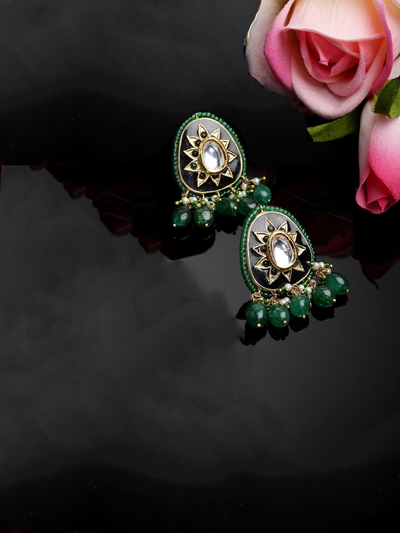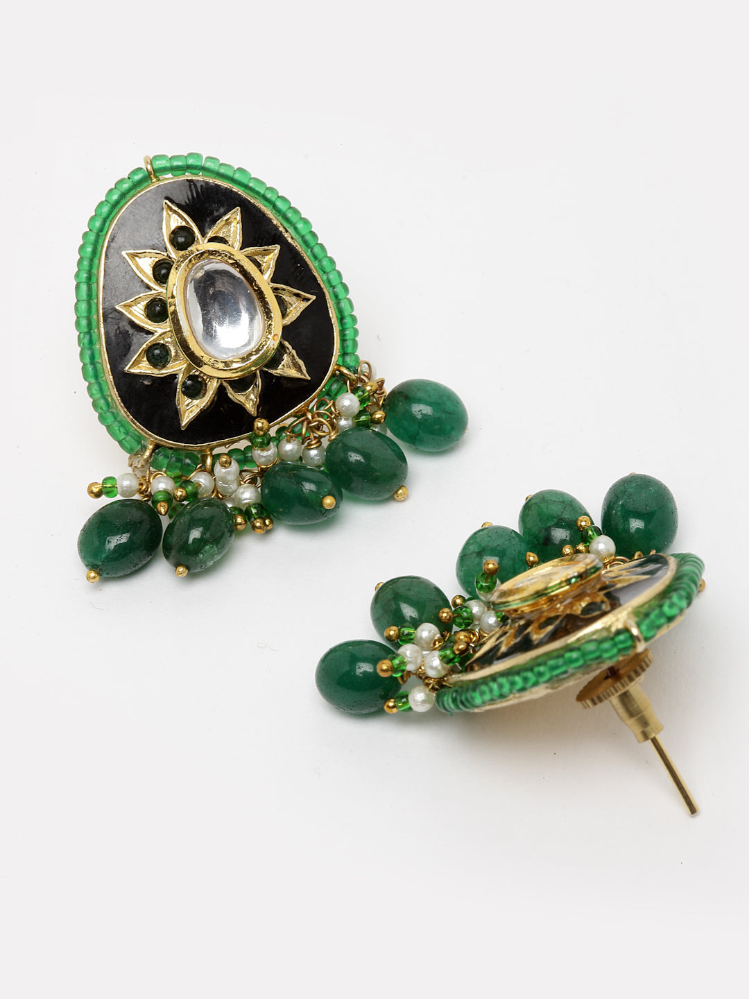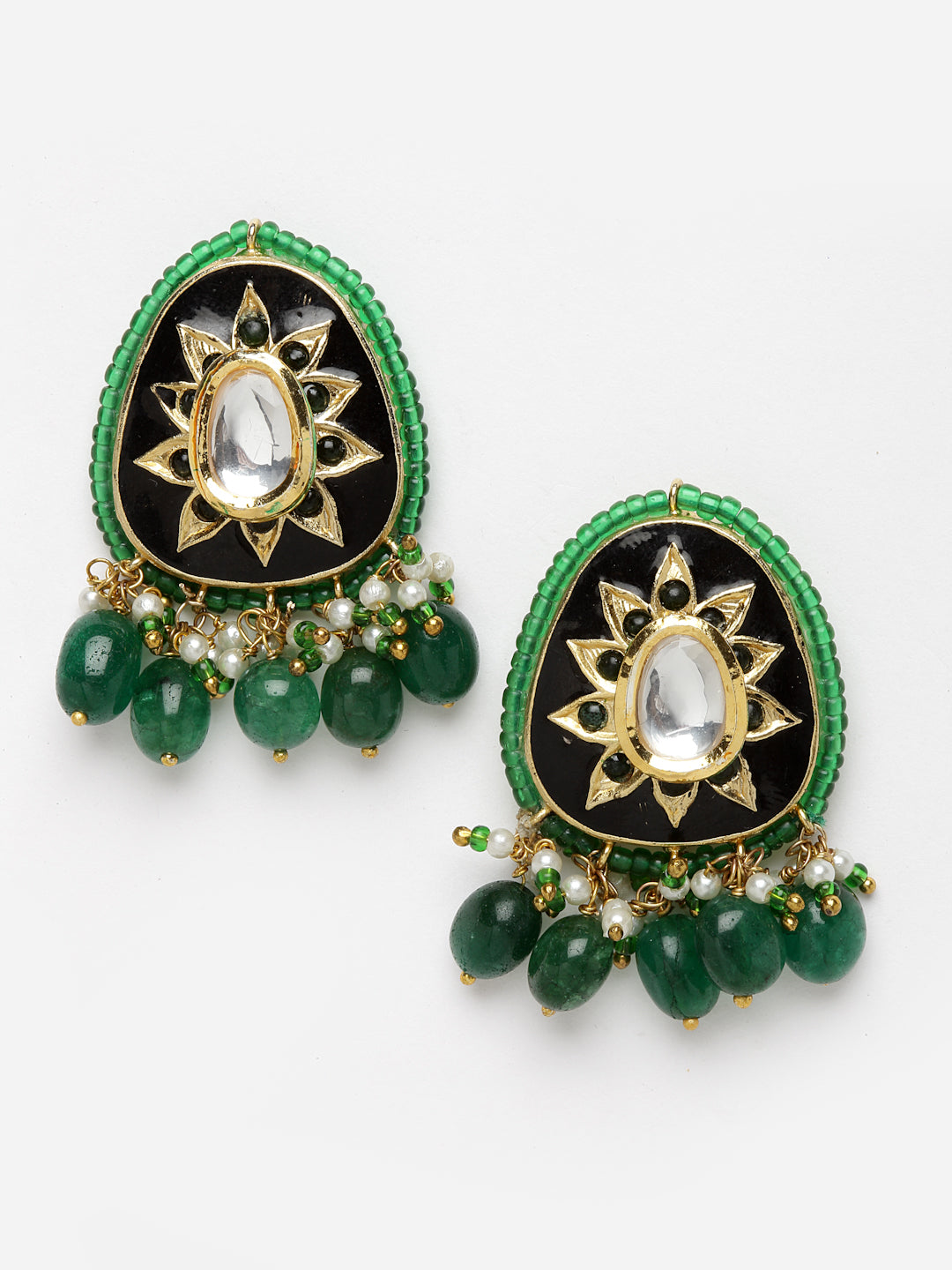 Black Meenakari With Kundan Amalgamation Highlighted With Emerlad; Category Of Jewellery Is Earring; Sub Category Is Drop; Ideal For Women; Color Is Black, Green, White, Gold ; Gemstones Used - Kundan, Pearls, Natural Stones, Faux Emerald; Plating Is Gold-Plated; Base Metal Is Alloy; Other Material Used - Closure Stopper And Kanchain; Size Is Freesize; Adjustable - No; Weight Is 22 Gms; Mesaurements - Length Of Earring= 5 Cm; Width Of Earring =3.2 Cm; Adjustable - No; Content 1 Pair Earring