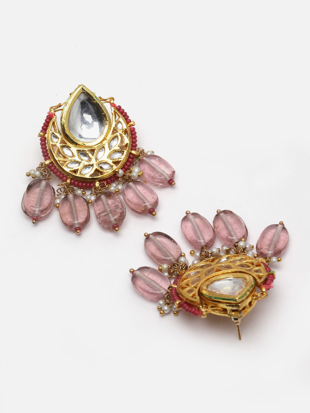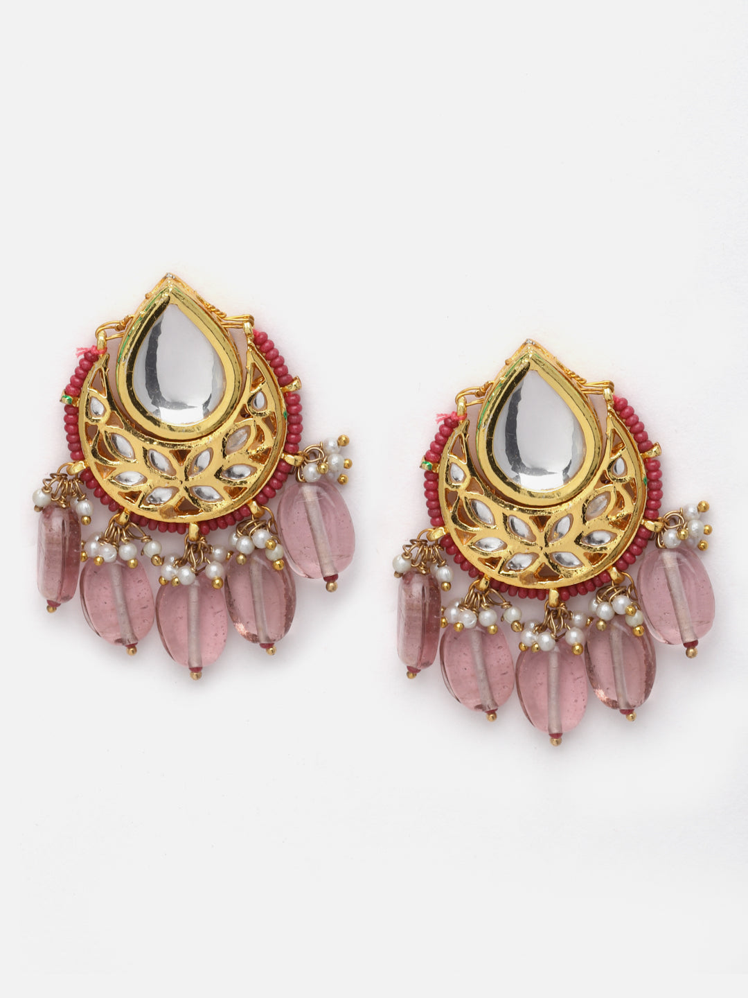 Stud Earring With Round And Drop; Category Of Jewellery Is Earring; Sub Category Is Drop; Ideal For Women; Color Is Pink, Gold, White; Gemstones Used - Kundan, Pearls, Natural Stones; Plating Is Gold-Plated; Base Metal Is Alloy; Other Material Used - Closure Stopper; Size Is Freesize; Adjustable - No; Weight Is 35 Gms; Mesaurements - Length Of Earring= 5.5 Cm; Width Of Earring =3.4 Cm; Adjustable - No; Content 1 Pair Earring