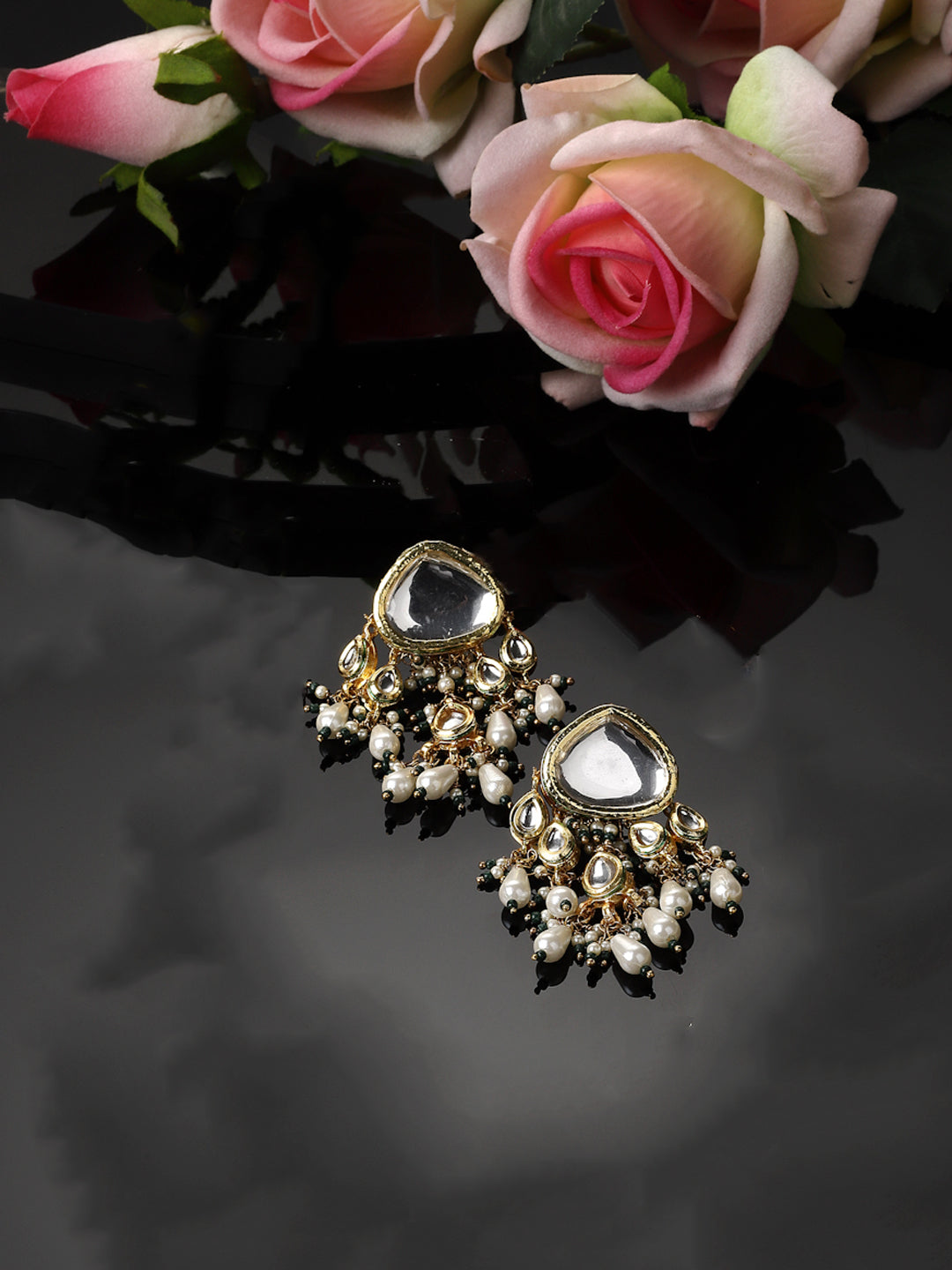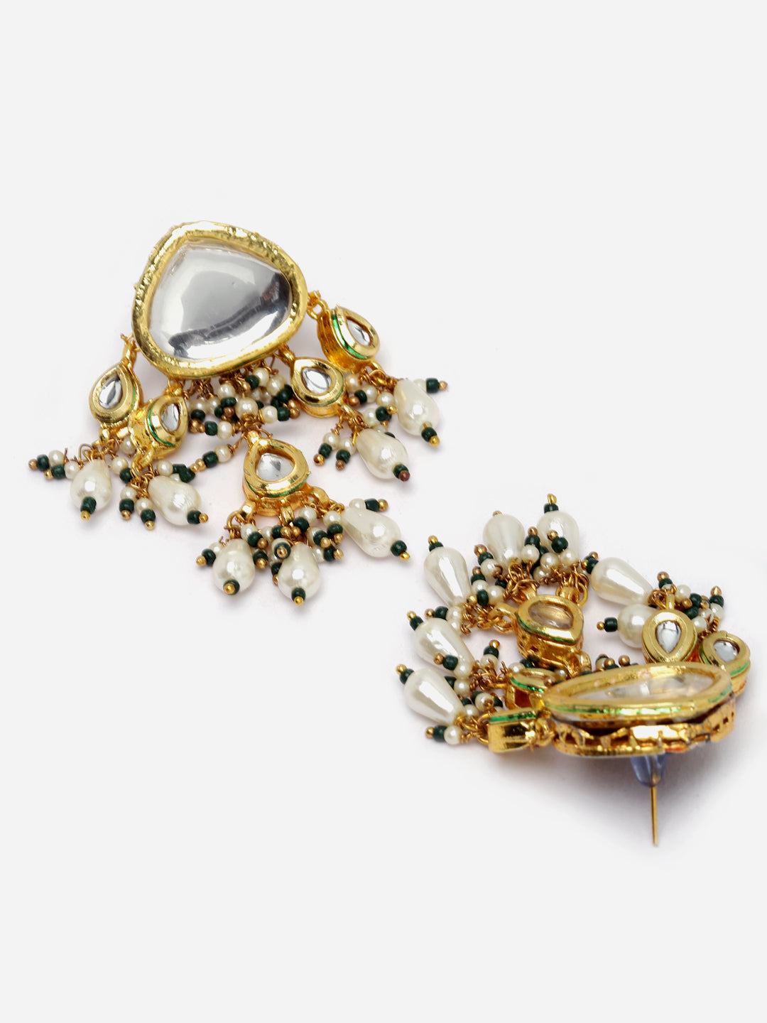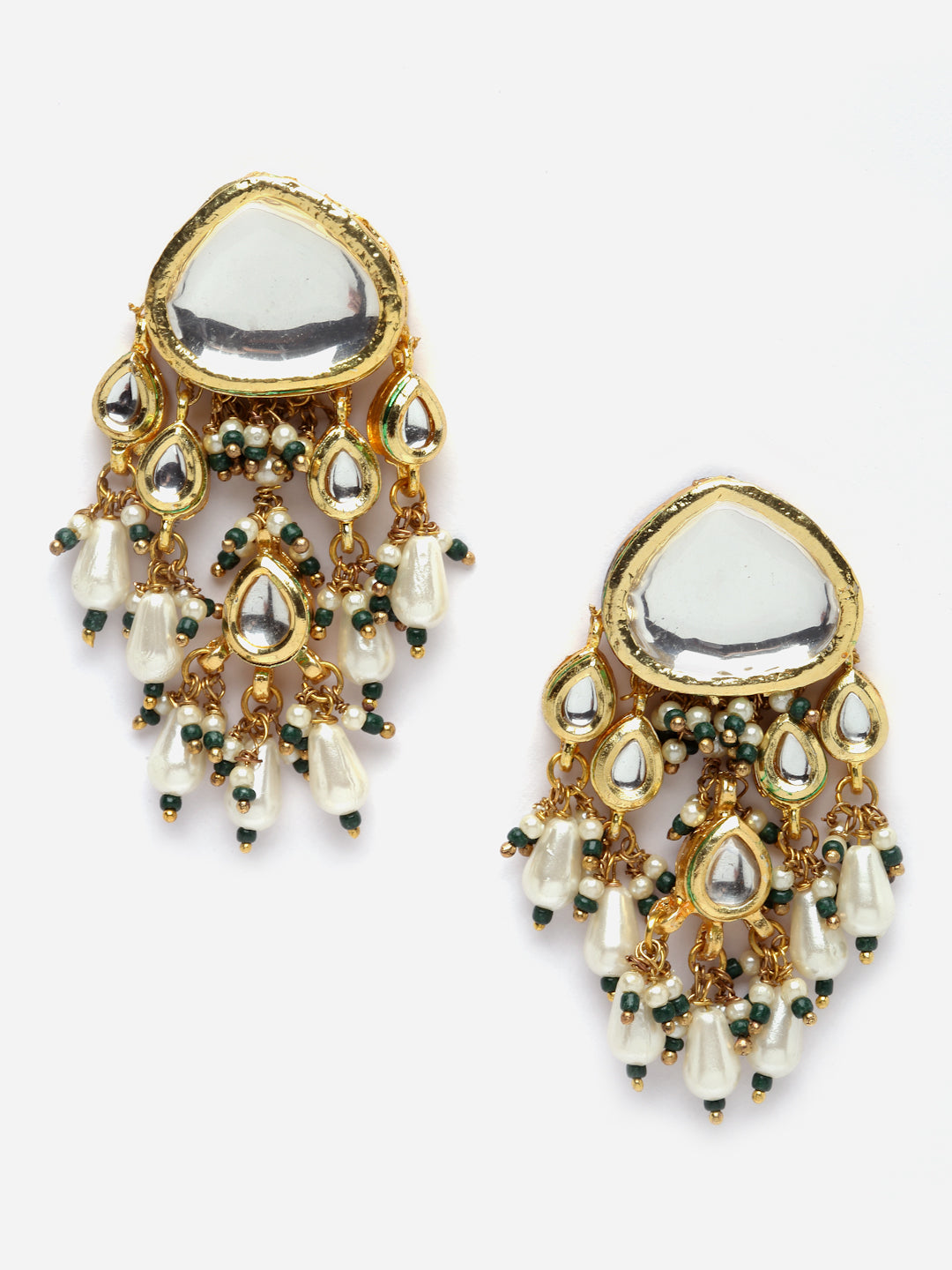 Kundan Ki Mogra Simple And Elegant Earring; Category Of Jewellery Is Earring; Sub Category Is Drop; Ideal For Women; Color Is Green, Gold, White; Gemstones Used - Kundan, Pearls, Natural Stones, Faux Emerald; Plating Is Gold-Plated; Base Metal Is Alloy; Other Material Used - Closure Stopper; Size Is Freesize; Adjustable - No; Weight Is 31 Gms; Mesaurements - Length Of Earring= 7 Cm; Width Of Earring =3.2 Cm; Adjustable - No; Content 1 Pair Earring