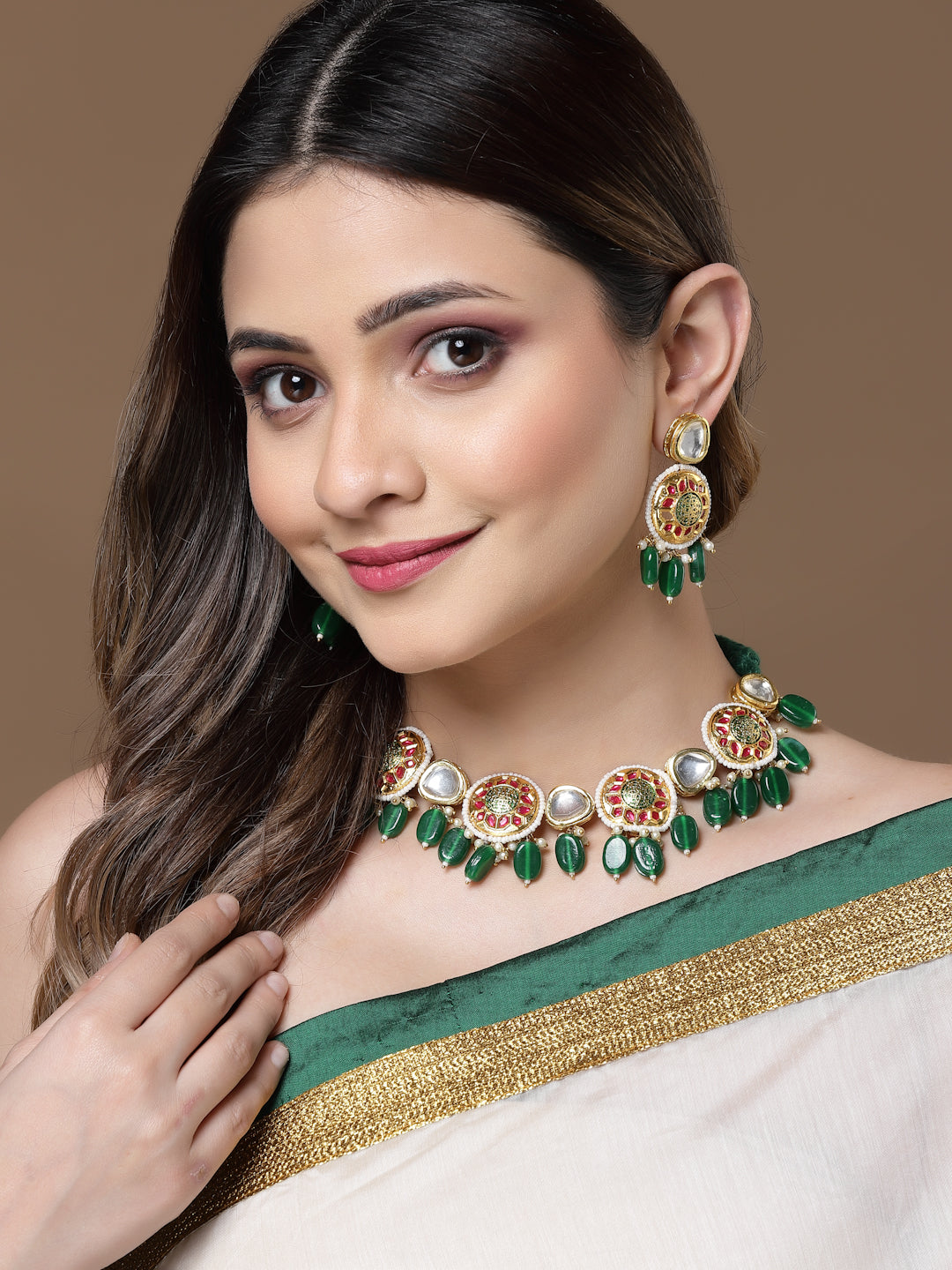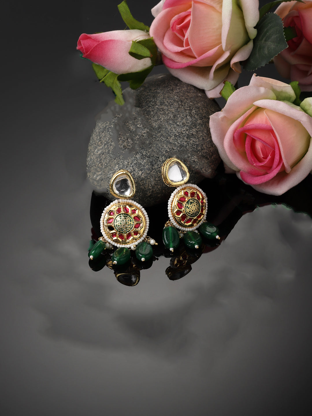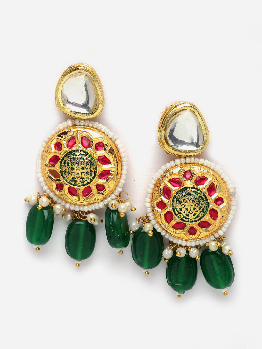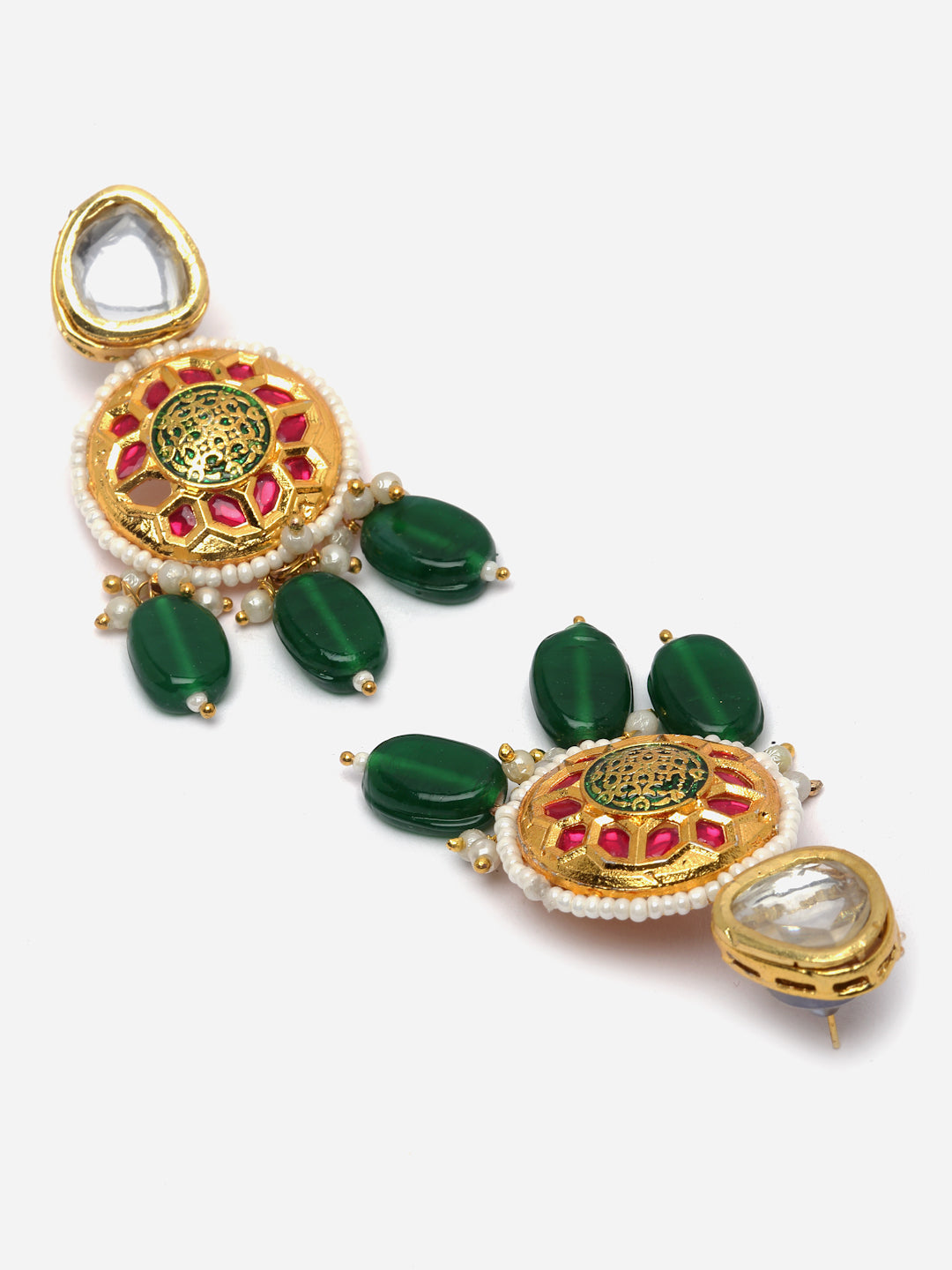 Meena Of Green And Pink Kndan; Category Of Jewellery Is Earring; Sub Category Is Drop; Ideal For Women; Color Is Green, Pink, Gold, White; Gemstones Used - Kundan, Pearls, Natural Stones; Plating Is Gold-Plated; Base Metal Is Alloy; Other Material Used - Closure Stopper; Size Is Freesize; Adjustable - No; Weight Is 28 Gms; Mesaurements - Length Of Earring= 8 Cm; Width Of Earring =3 Cm; Adjustable - No; Content 1 Pair Earring
