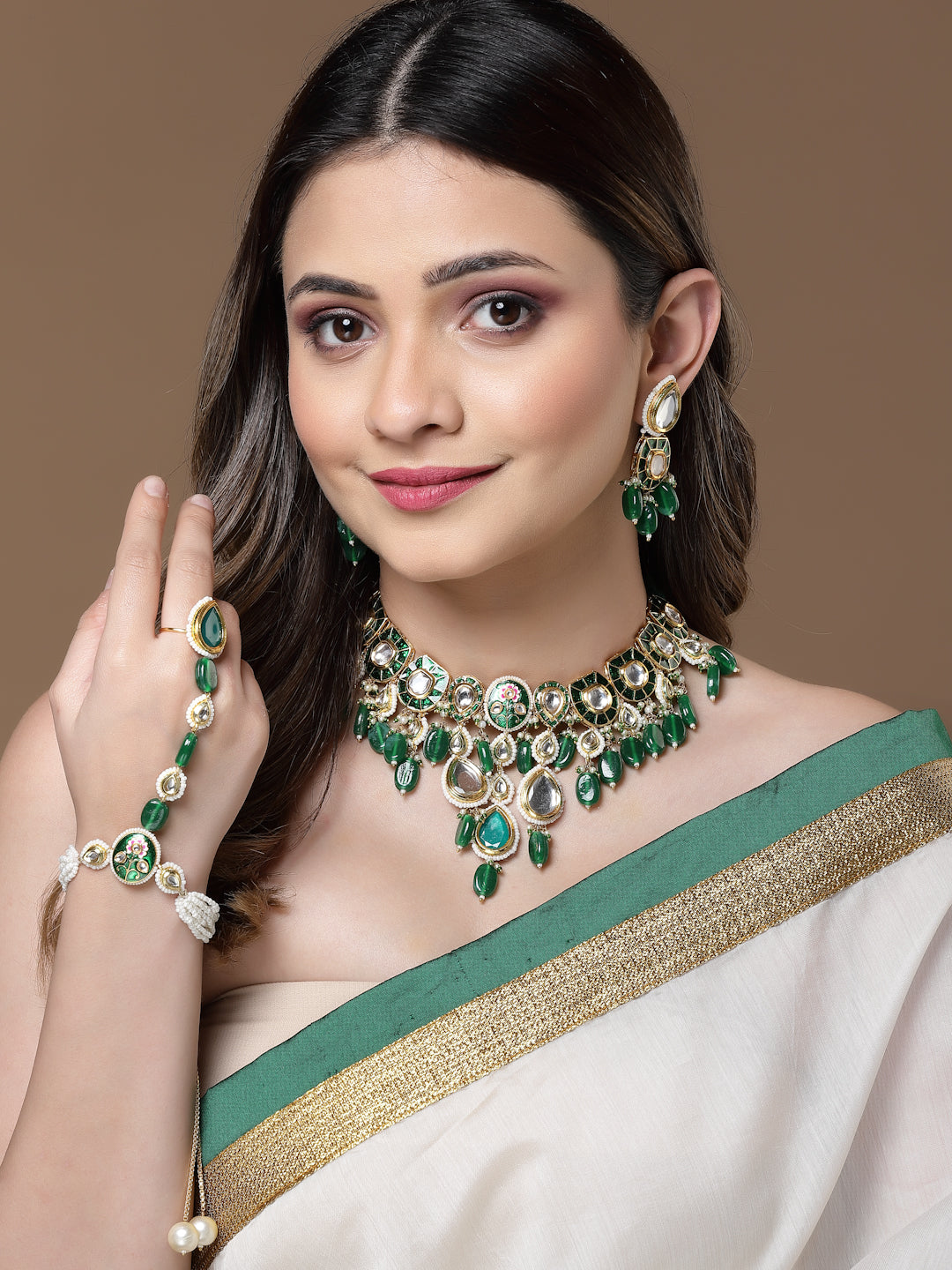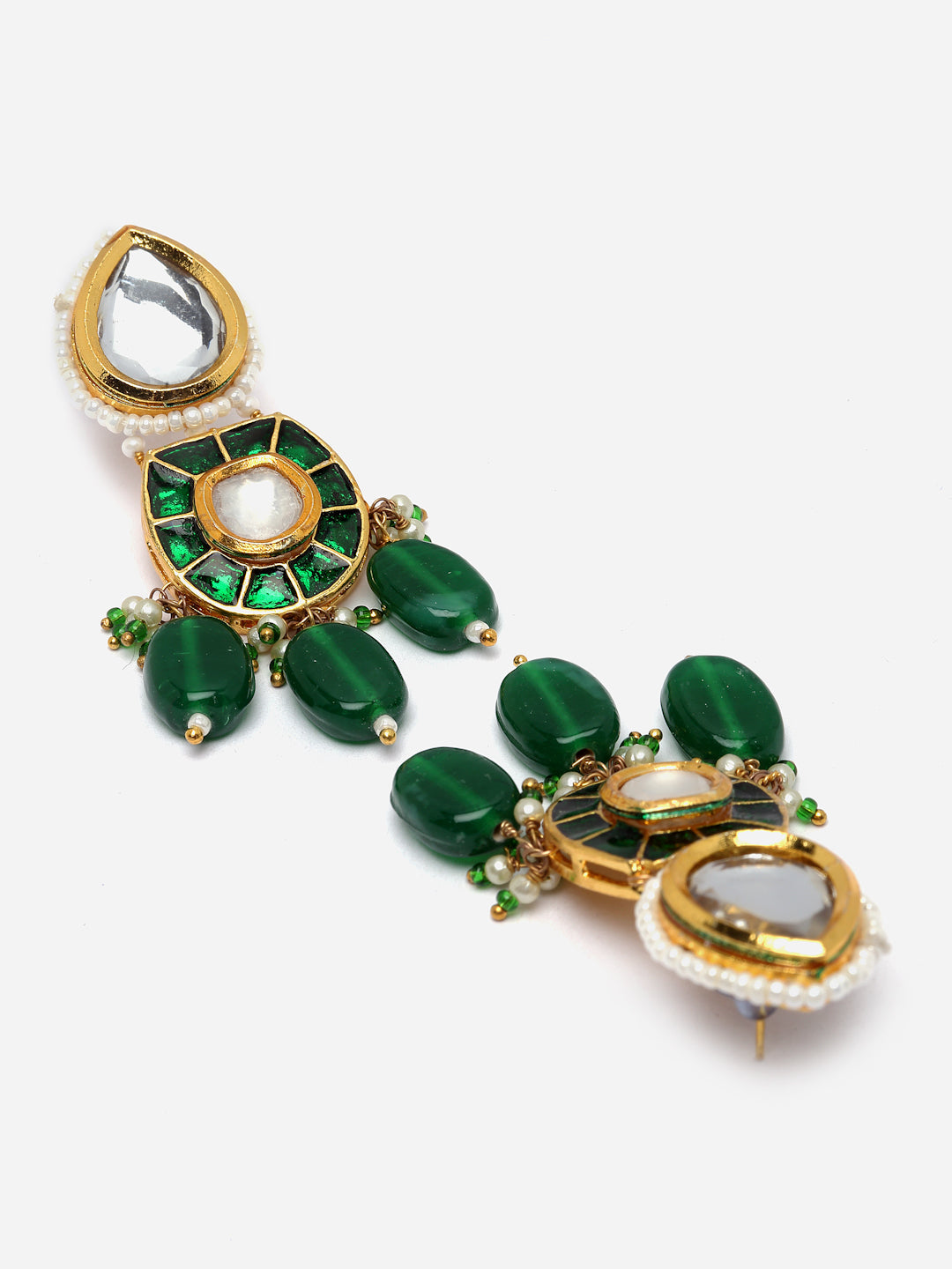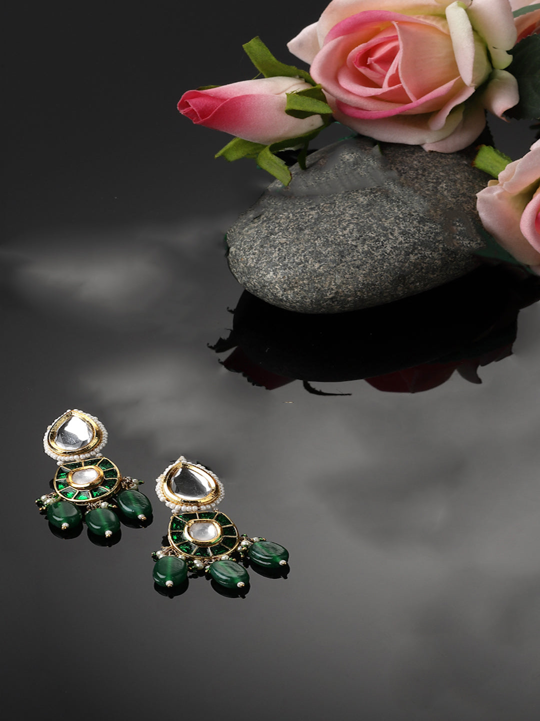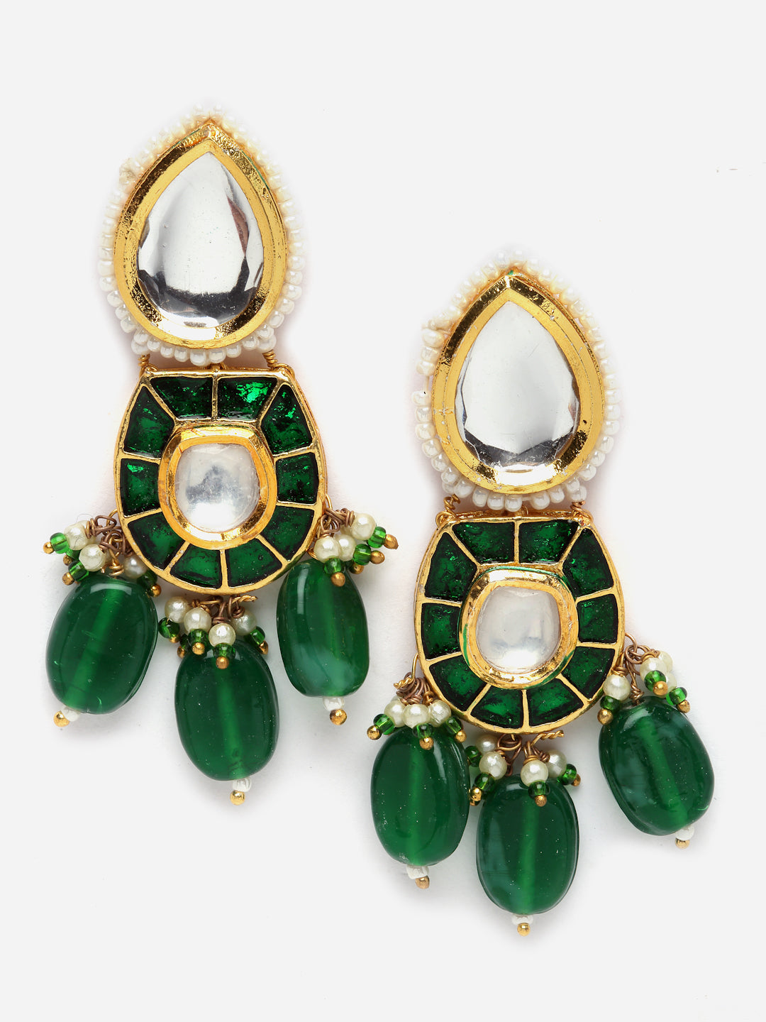 Kundan And Meena With Drop Of Green Emerald; Category Of Jewellery Is Earring; Sub Category Is Drop; Ideal For Women; Color Is Green, Gold, White; Gemstones Used - Kundan, Pearls, Natural Stones, Faux Emerald; Plating Is Gold-Plated; Base Metal Is Alloy; Other Material Used - Closure Stopper; Size Is Freesize; Adjustable - No; Weight Is 24 Gms; Mesaurements - Length Of Earring= 6.5 Cm; Width Of Earring =2.3 Cm; Adjustable - No; Content 1 Pair Earring
