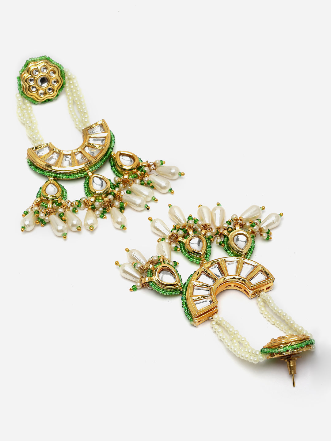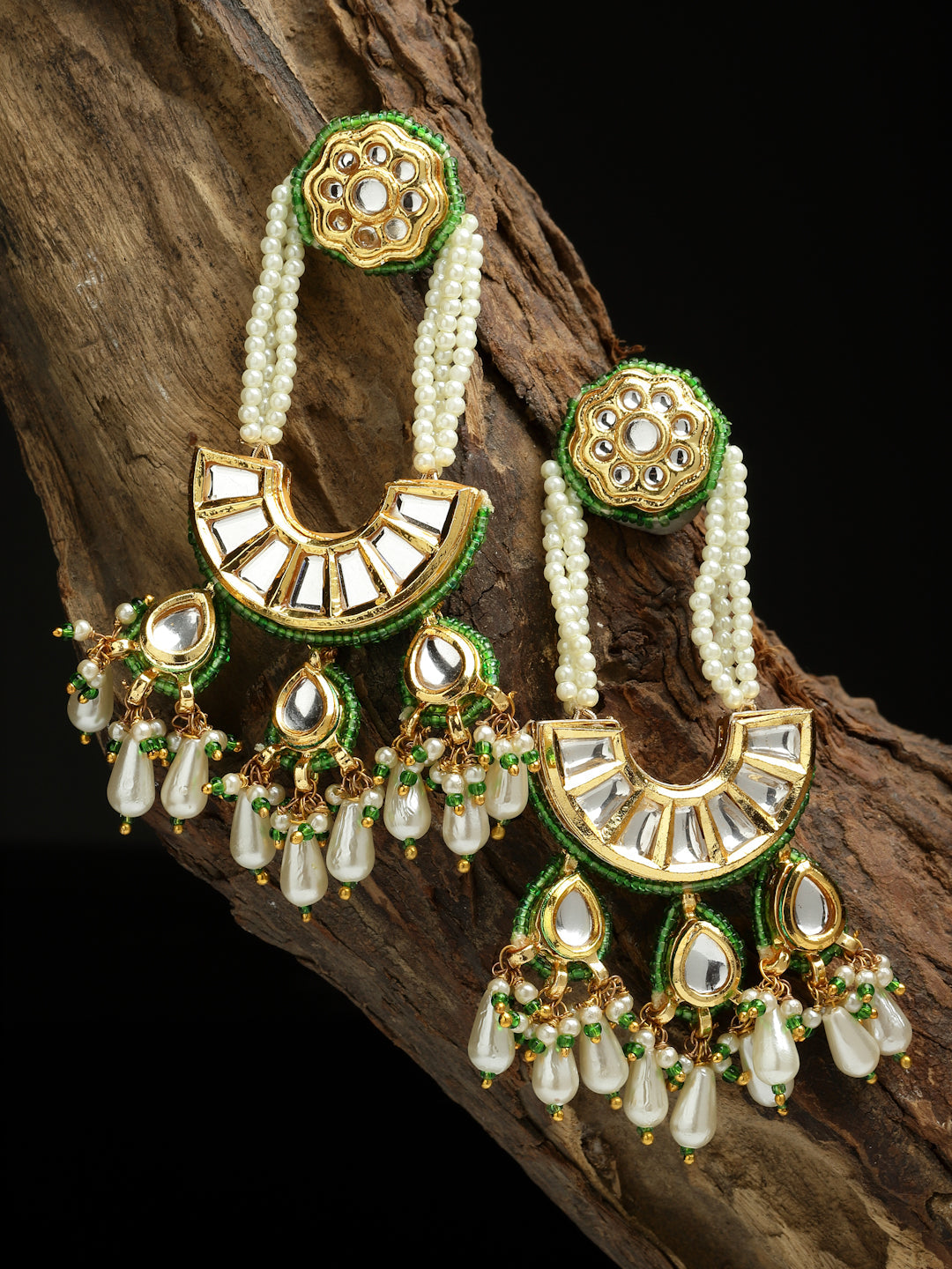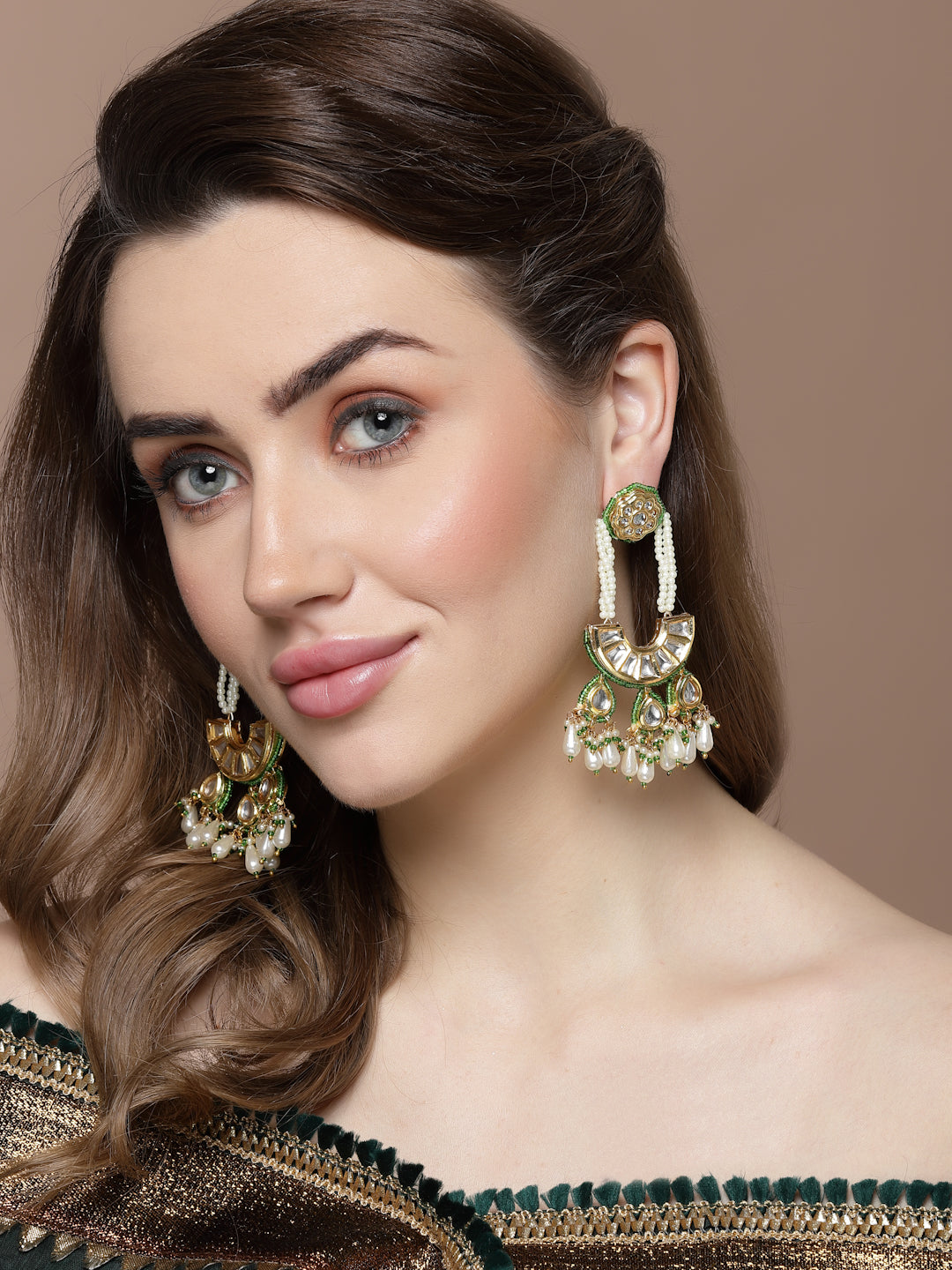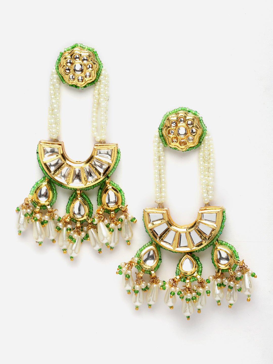 Green And White Kundan Drop Earring; Category Of Jewellery Is Earring; Sub Category Is Drop; Ideal For Women; Color Is Green, Gold, White, Cream; Gemstones Used - Kundan, Pearls, Natural Stones, Faux Emerald; Plating Is Gold-Plated; Base Metal Is Alloy; Other Material Used - Closure Stopper; Size Is Freesize; Adjustable - No; Weight Is 45 Gms; Mesaurements - Length Of Earring= 9 Cm; Width Of Earring =4 Cm; Adjustable - No; Content 1 Pair Earring