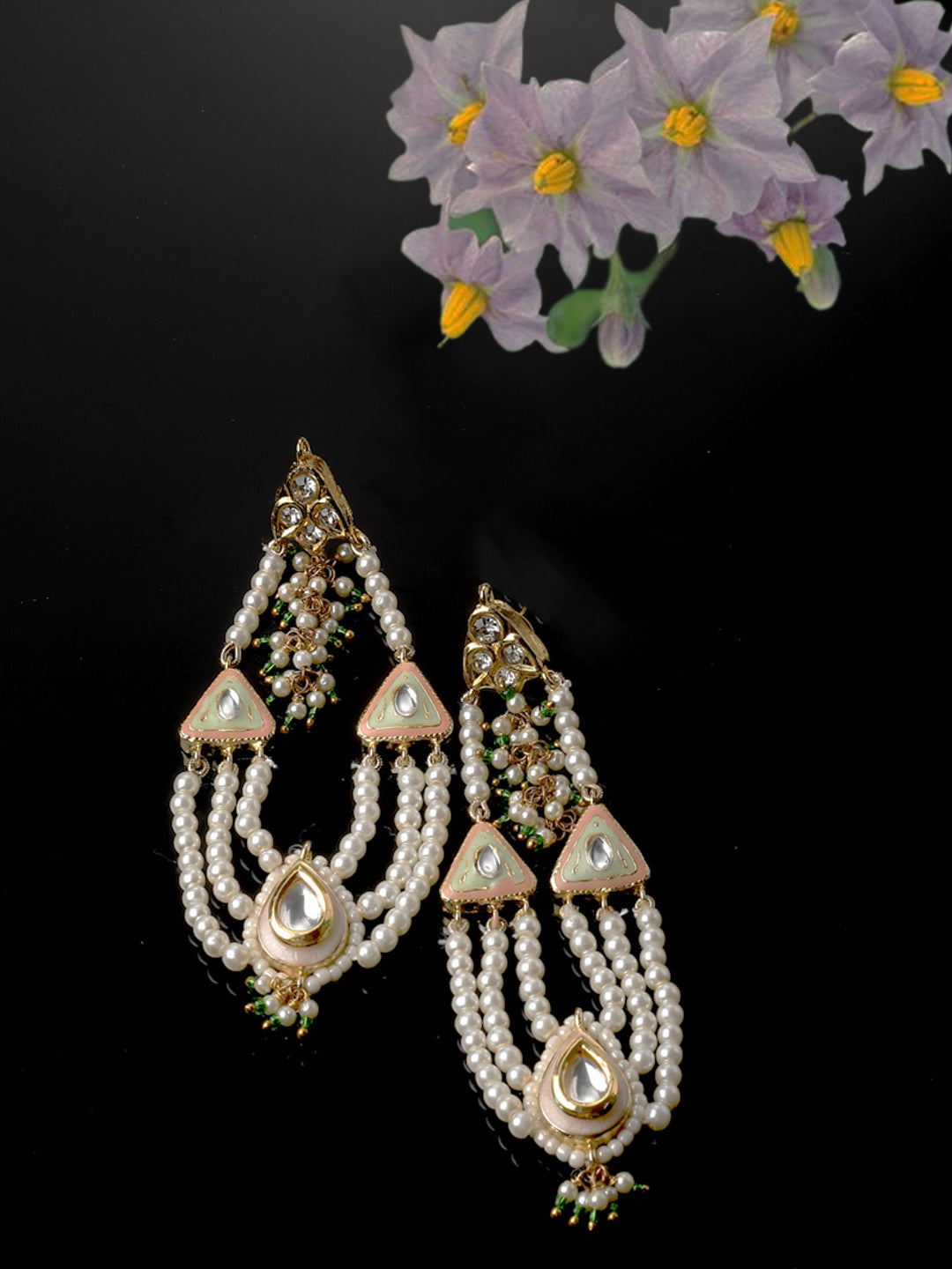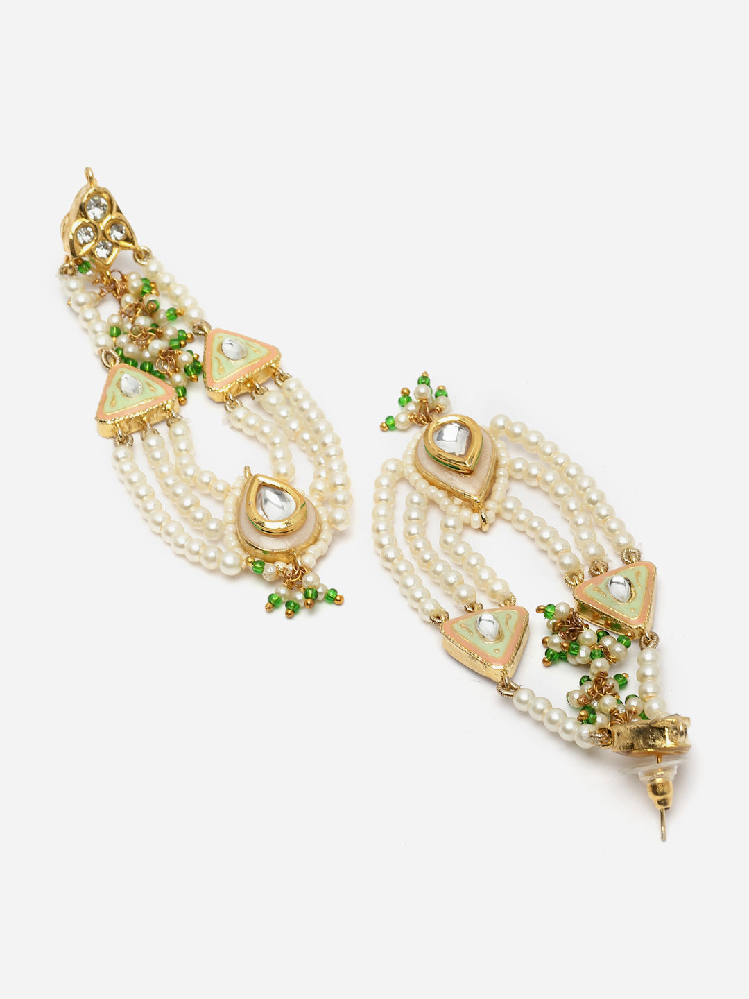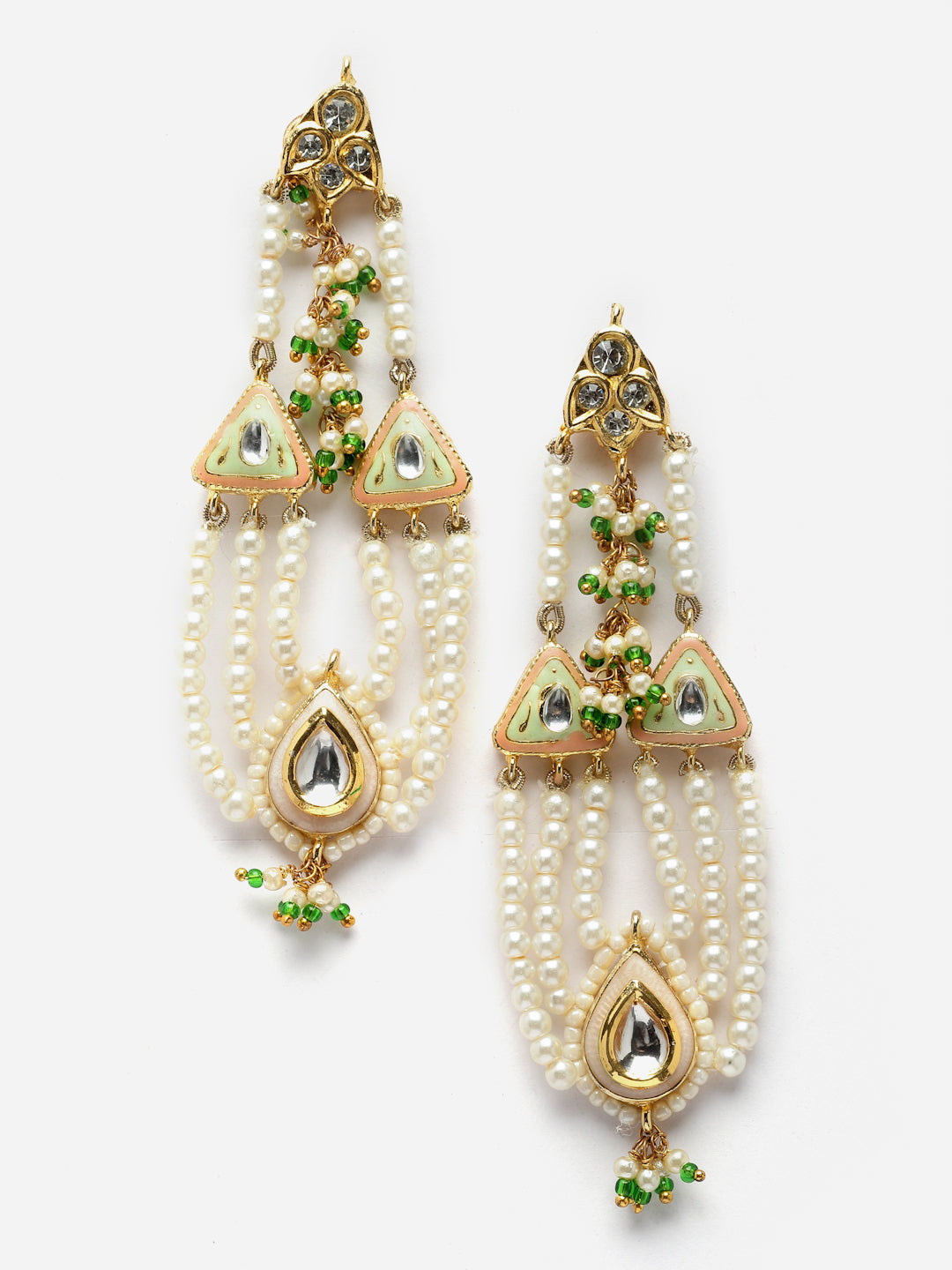 Waterfall Effect Earring Withmeenakari; Category Of Jewellery Is Earring; Sub Category Is Drop; Ideal For Women; Color Is Green, Peach, Gold, White, Cream; Gemstones Used - Kundan, American Diamond, Pearls, Natural Stones, Faux Emerald; Plating Is Gold-Plated; Base Metal Is Alloy; Other Material Used - Closure Stopper; Size Is Freesize; Adjustable - No; Weight Is 20 Gms; Mesaurements - Length Of Earring= 9 Cm; Width Of Earring =2.8 Cm; Adjustable - No; Content 1 Pair Earring