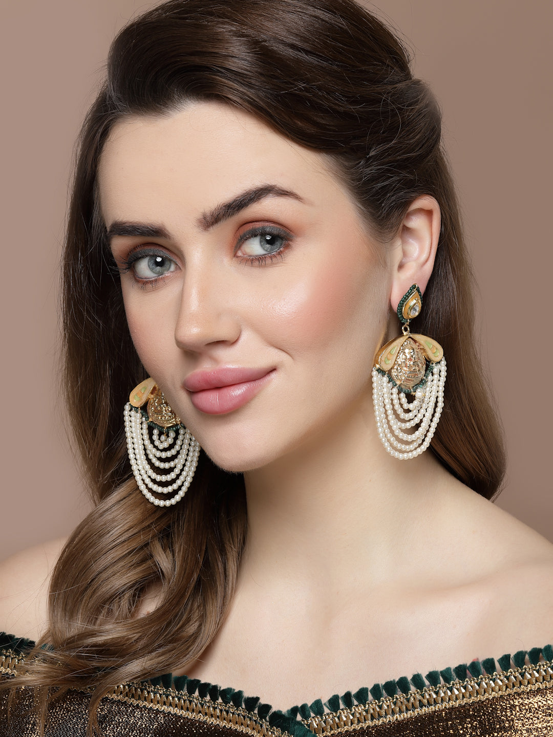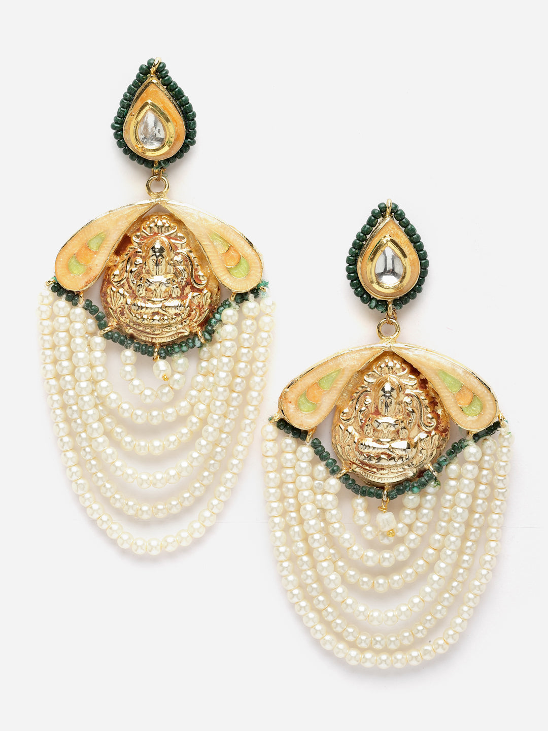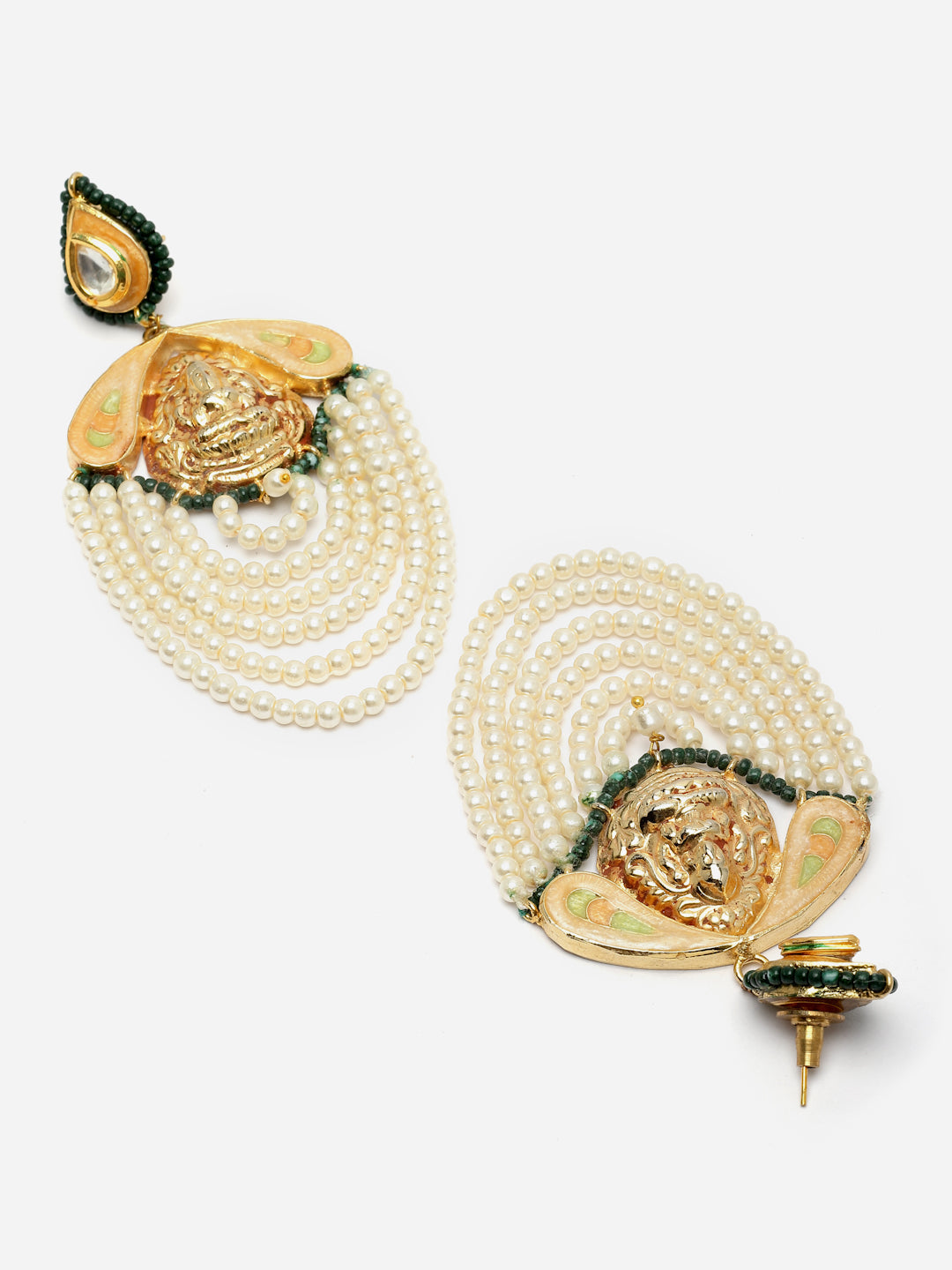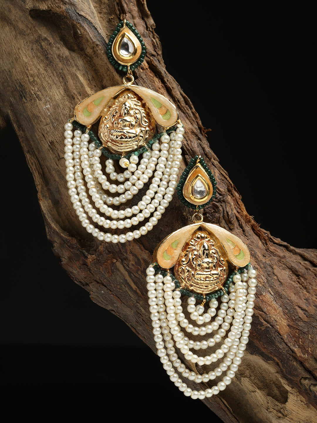 Temple And Meenakari Amalgamated Earring; Category Of Jewellery Is Earring; Sub Category Is Drop; Ideal For Women; Color Is Peach, Cream, Green, White, Gold; Gemstones Used - Kundan, Pearls, Natural Stones, Faux Emerald,; Plating Is Gold-Plated; Base Metal Is Alloy; Other Material Used - Closure Stopper; Size Is Freesize; Adjustable - No; Weight Is 30 Gms; Mesaurements - Length Of Earring= 8.5 Cm; Width Of Earring =5 Cm; Adjustable - No; Content 1 Pair Earring