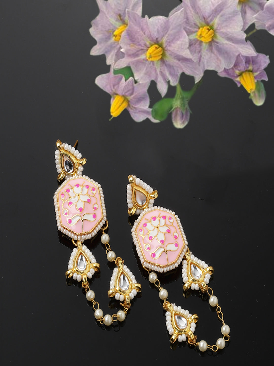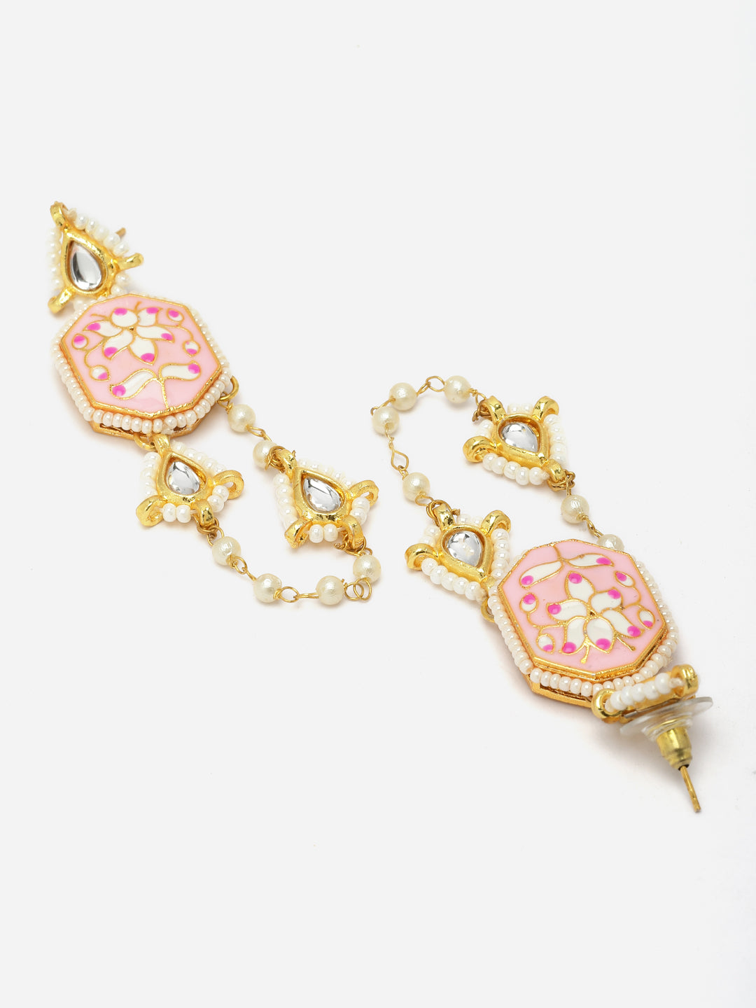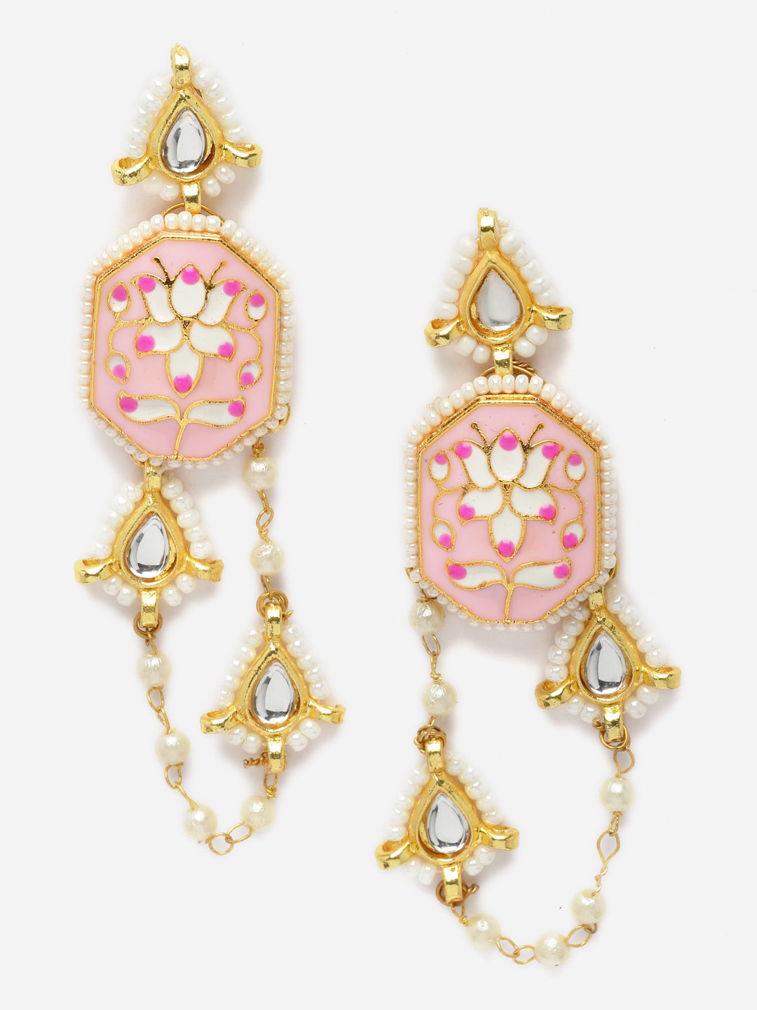 Diya Style Meenakari Earring; Category Of Jewellery Is Earring; Sub Category Is Drop; Ideal For Women; Color Is Pink, Gold, Cream, White; Gemstones Used - Kundan, Pearls, Natural Stones; Plating Is Gold-Plated; Base Metal Is Alloy; Other Material Used - Closure Stopper; Size Is Freesize; Adjustable - No; Weight Is 18 Gms; Mesaurements - Length Of Earring= 6.5 Cm; Width Of Earring =2 Cm; Adjustable - No; Content 1 Pair Earring