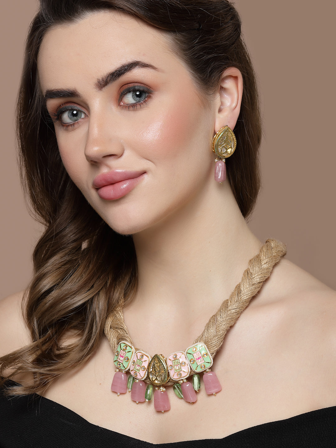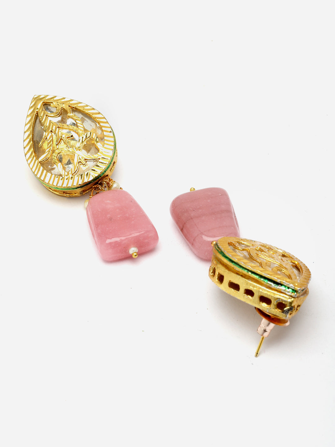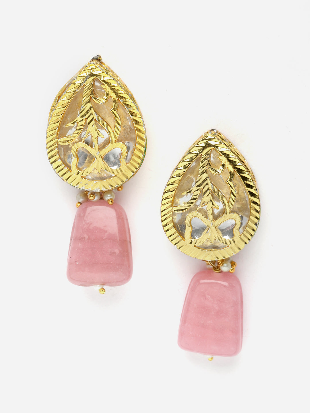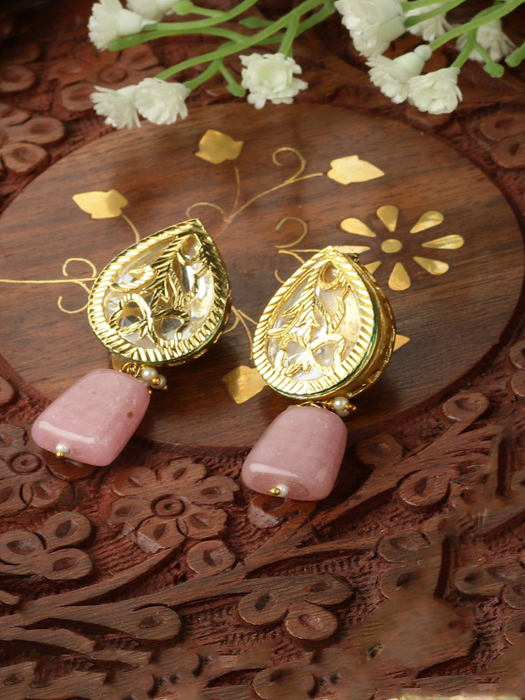 Nakashi Kundan With Pink Earring; Category Of Jewellery Is Earring; Sub Category Is Drop; Ideal For Women; Color Is Pink, Gold, White; Gemstones Used - Kundan, Natural Stones; Plating Is Gold-Plated; Base Metal Is Alloy; Other Material Used - Closure Stopper; Size Is Freesize; Adjustable - No; Weight Is 19 Gms; Mesaurements - Length Of Earring= 3 Cm; Width Of Earring =1.5 Cm; Adjustable - No; Content 1 Pair Earring