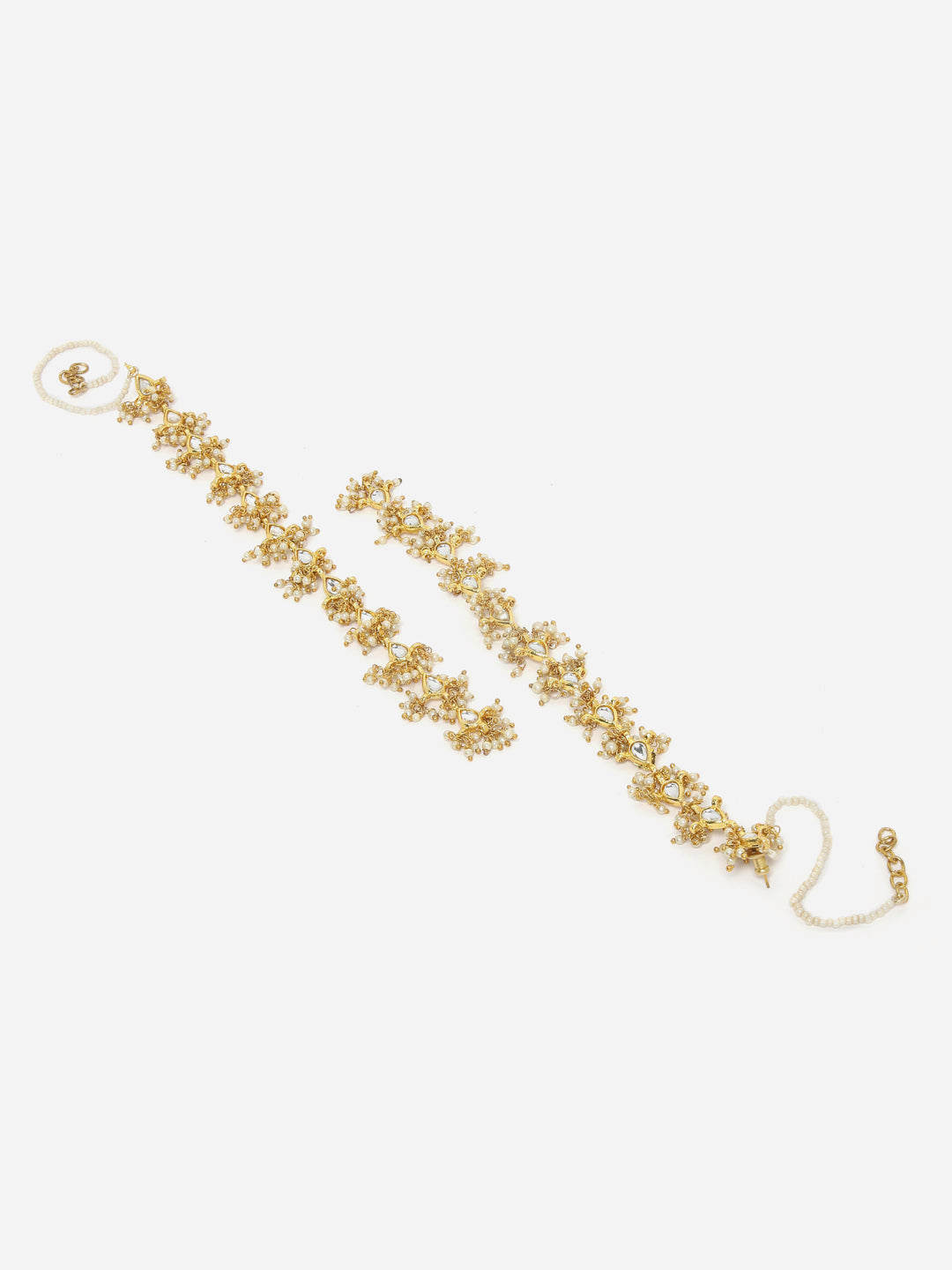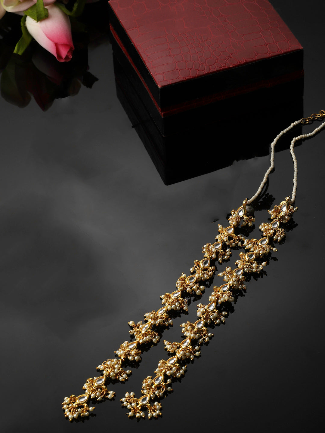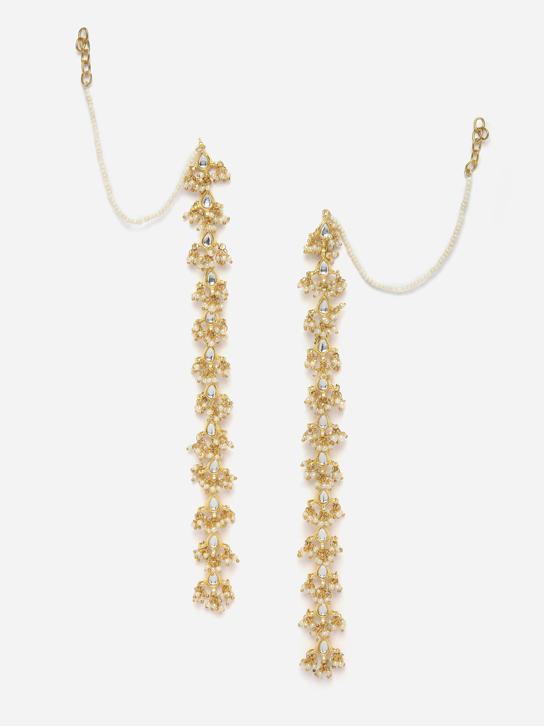 Drops Of Kundan In Long Chain With Kanuti To Gve Extra Effect And Super Light; Category Of Jewellery Is Earring; Sub Category Is Drop; Ideal For Women; Color Is Gold, White, Cream; Gemstones Used - Kundan, Pearls, Natural Stones; Plating Is Gold-Plated; Base Metal Is Alloy; Other Material Used - Closure Stopper; Size Is Freesize; Adjustable - No; Weight Is 38 Gms; Mesaurements - Length Of Earring= 10 Cm; Width Of Earring =1.2 Cm; Length Of Kanchain =11.5 Cm; Width Of Kanchain = 1 Cm; Adjustable - No; Content 1 Pair Earring With Kanchain