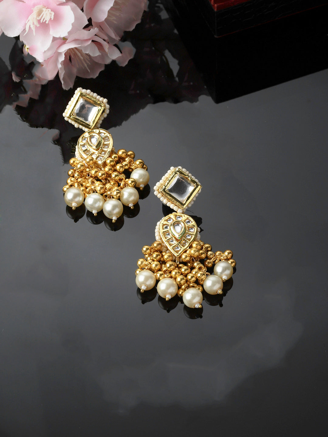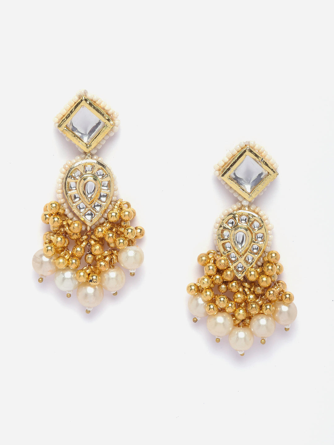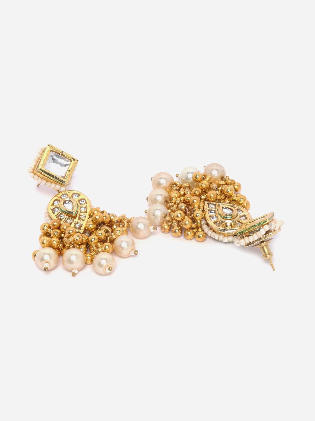 Kundan And Ghungreu Gold( No Voice) With Pearl Effect; Category Of Jewellery Is Earring; Sub Category Is Drop; Ideal For Women; Color Is Gold, White, Cream; Gemstones Used - Kundan, Pearls, Natural Stones; Plating Is Gold-Plated; Base Metal Is Alloy; Other Material Used - Closure Stopper; Size Is Freesize; Adjustable - No; Weight Is 27 Gms; Mesaurements - Length Of Earring= 7.5 Cm; Width Of Earring =2.1 Cm; Adjustable - No; Content 1 Pair Earring