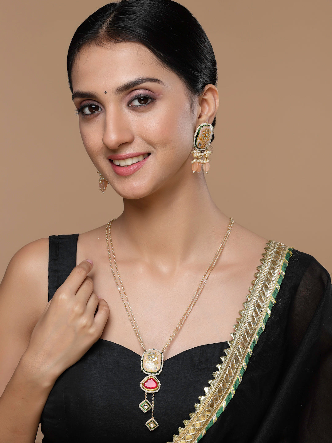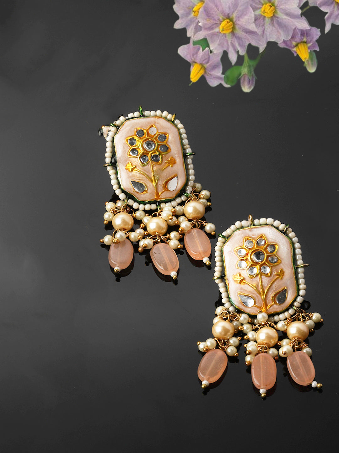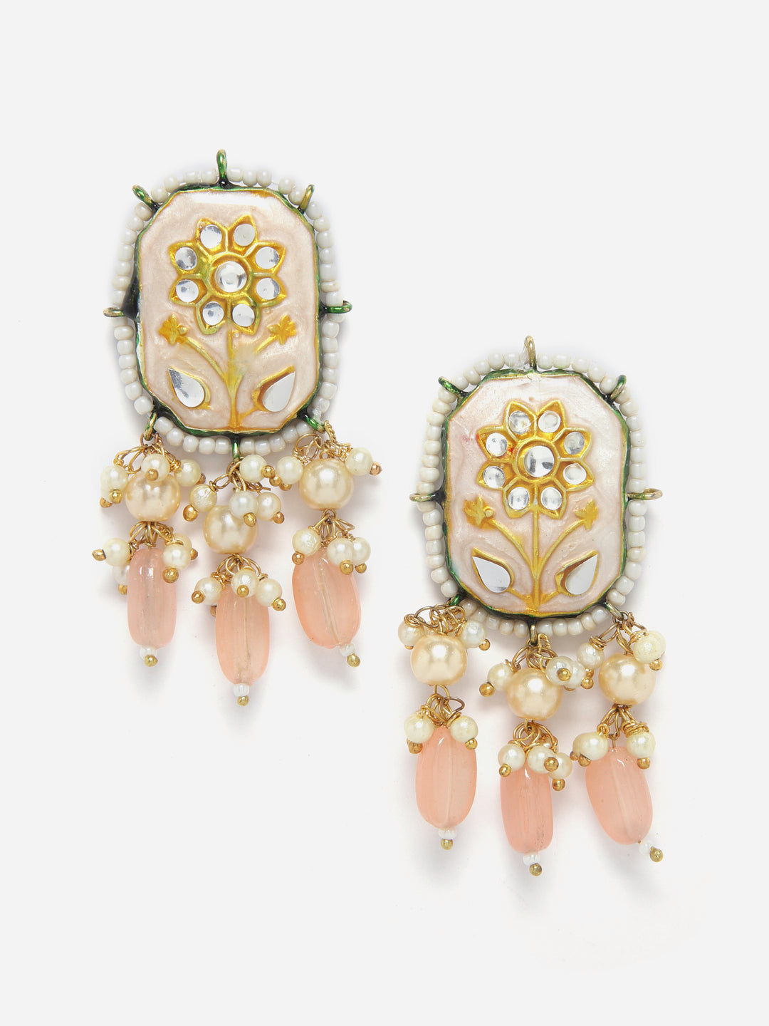 Cream Meenakari With Pink Dropplet Of Earring; Category Of Jewellery Is Earring; Sub Category Is Drop; Ideal For Women; Color Is Peach, Pink, Gold, Cream, White; Gemstones Used - Pearls, Natural Stones; Plating Is Gold-Plated; Base Metal Is Alloy; Other Material Used - Closure Stopper; Size Is Freesize; Adjustable - No; Weight Is 19 Gms; Mesaurements - Length Of Earring= 6.1 Cm; Width Of Earring =3.6 Cm; Adjustable - No; Content 1 Pair Earring