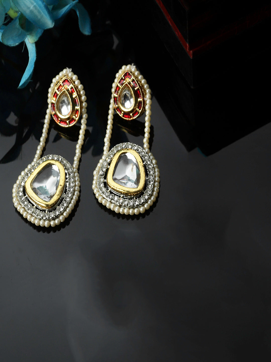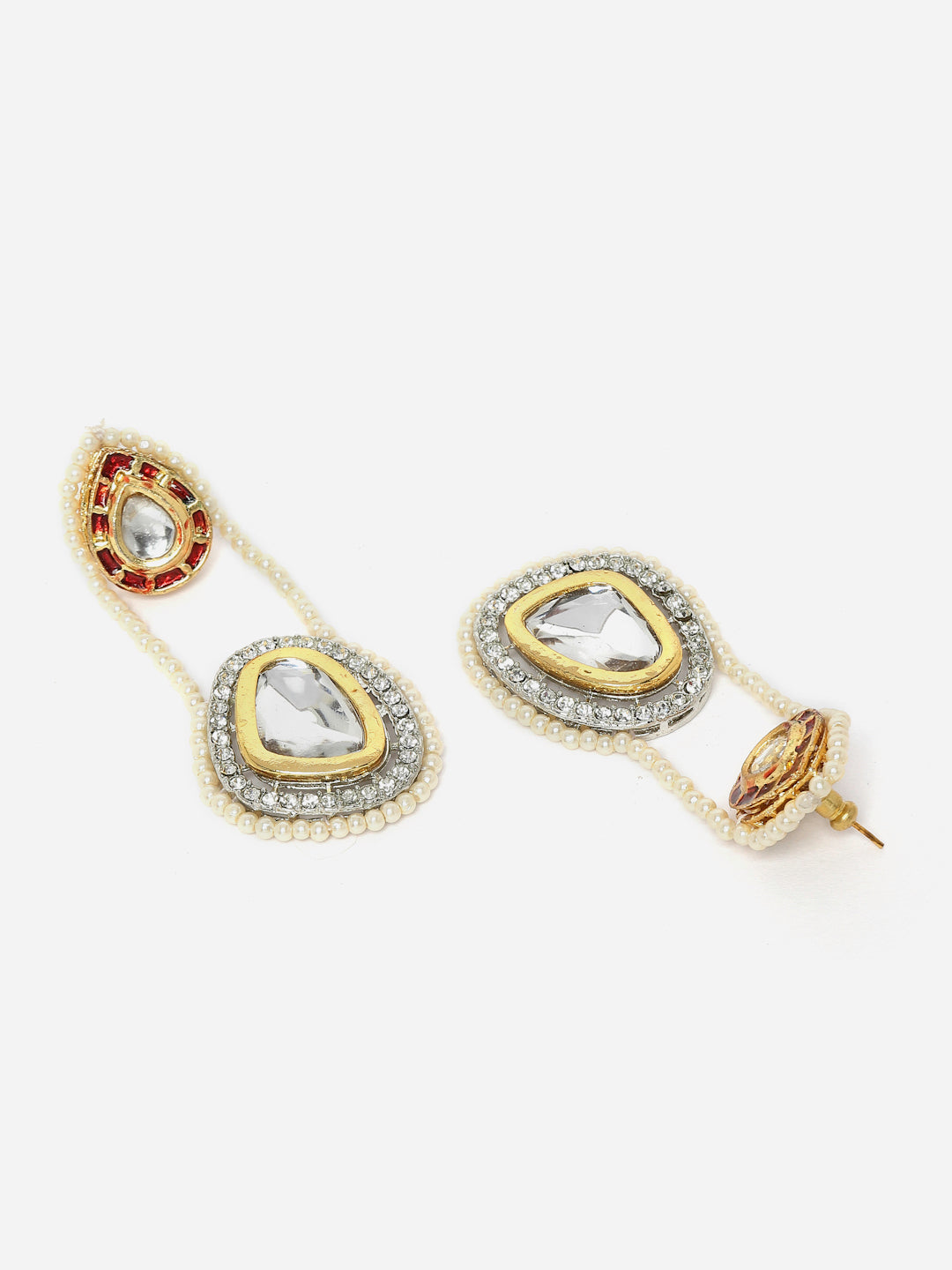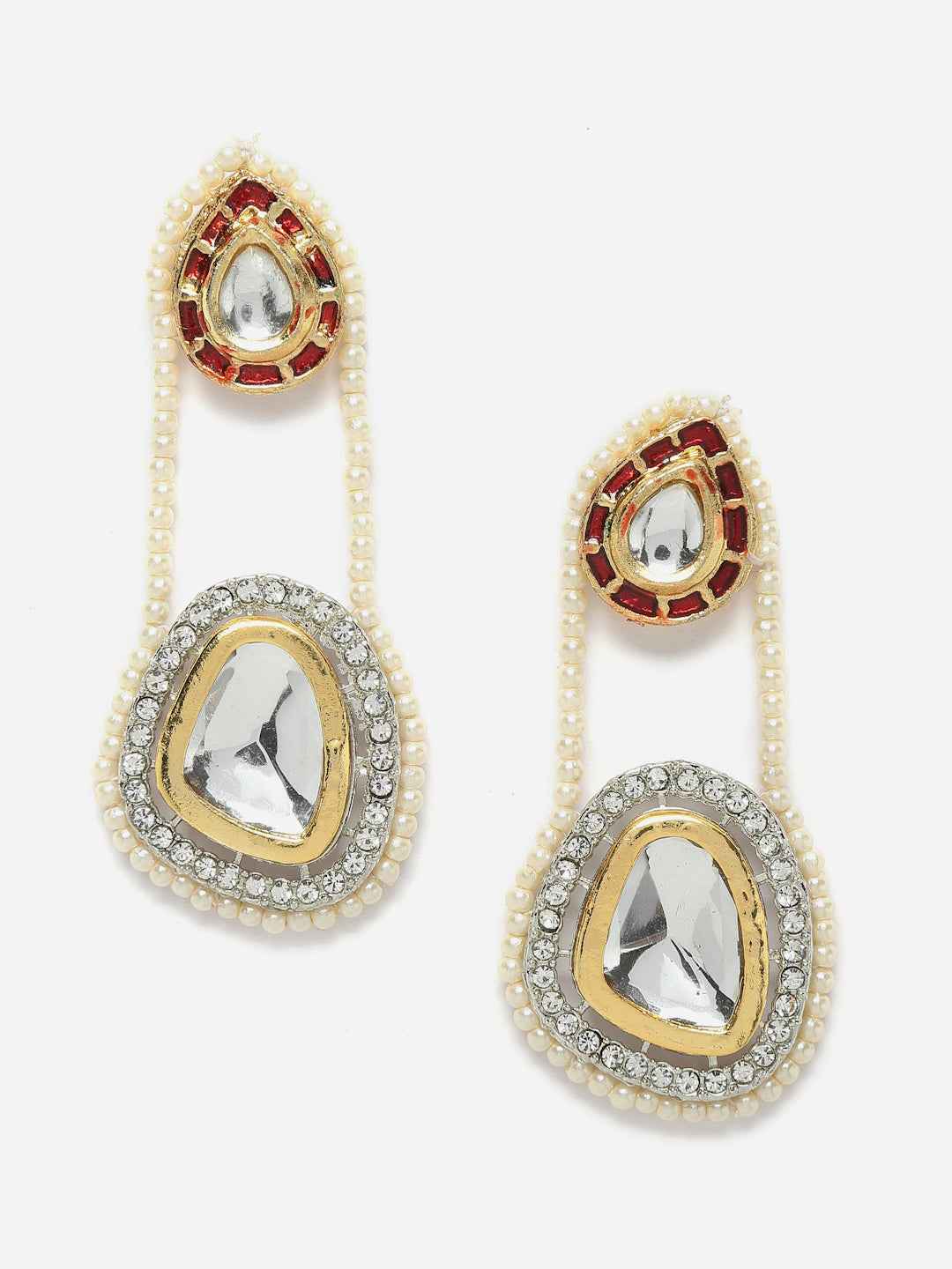 Red Cut Of Meena In Artificial Diamond Droplet Of Cocktail Stoned Styled Earring; Category Of Jewellery Is Earring; Sub Category Is Drop; Ideal For Women; Color Is Red, Gold, Cream, White ; Gemstones Used - Kundan, American Diamonds, Pearls, Natural Stones; Plating Is Gold-Plated; Base Metal Is Alloy; Other Material Used - Closure Stopper; Size Is Freesize; Adjustable - No; Weight Is 19 Gms; Mesaurements - Length Of Earring= 6.2 Cm; Width Of Earring =2.5 Cm; Adjustable - No; Content 1 Pair Earring
