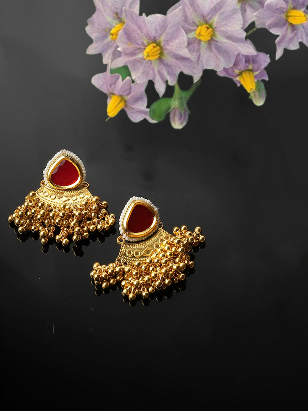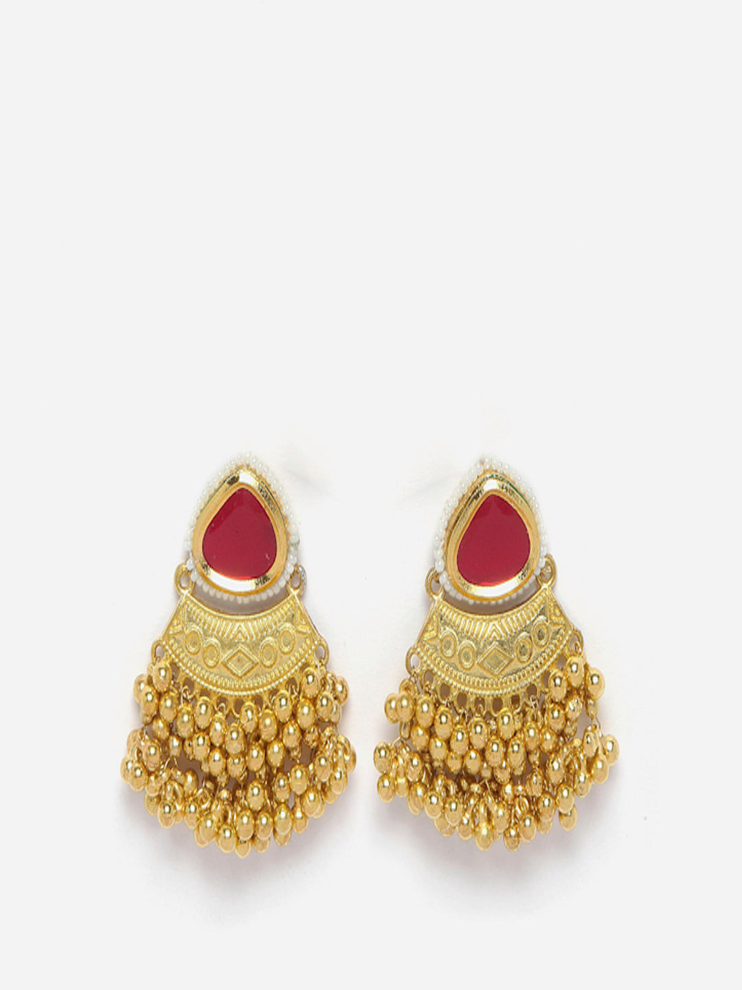 Kundan And Gold Droplets Earring; Category Of Jewellery Is Earring; Sub Category Is Drop; Ideal For Women; Color Is Red, Gold , White; Gemstones Used - Kundan, Pearls, Faux Emerald; Plating Is Gold-Plated; Base Metal Is Alloy; Other Material Used - Closure Stopper; Size Is Freesize; Adjustable - No; Weight Is 21 Gms; Mesaurements - Length Of Earring= 5 Cm; Width Of Earring =3.9 Cm; Adjustable - No; Content 1 Pair Earring