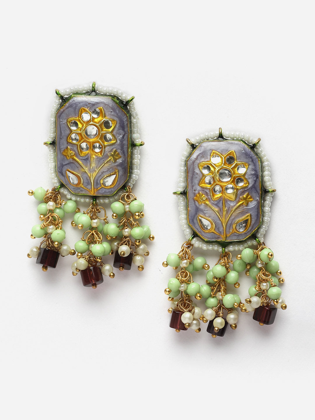 Purple Mina Kari With Green Mint And Latkan Earring Stud Styled Dangler Effect To Give Chiq Look; Category Of Jewellery Is Earring; Sub Category Is Drop; Ideal For Women; Color Is Blue, Green, Brown, White, Gold, ; Gemstones Used - Kundan, Pearls, Natural Stones; Plating Is Gold-Plated; Base Metal Is Alloy; Other Material Used - Closure Stopper; Size Is Freesize; Adjustable - No; Weight Is 23 Gms; Mesaurements - Length Of Earring= 4.5 Cm; Width Of Earring =3.3 Cm; Adjustable - No; Content 1 Pair Earring