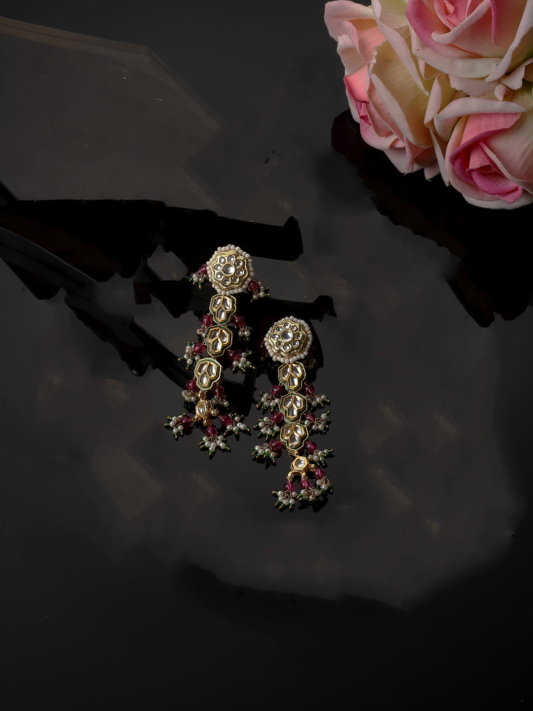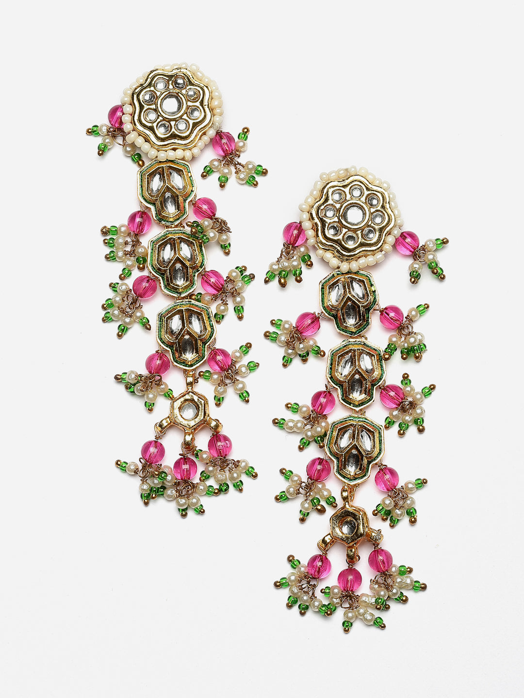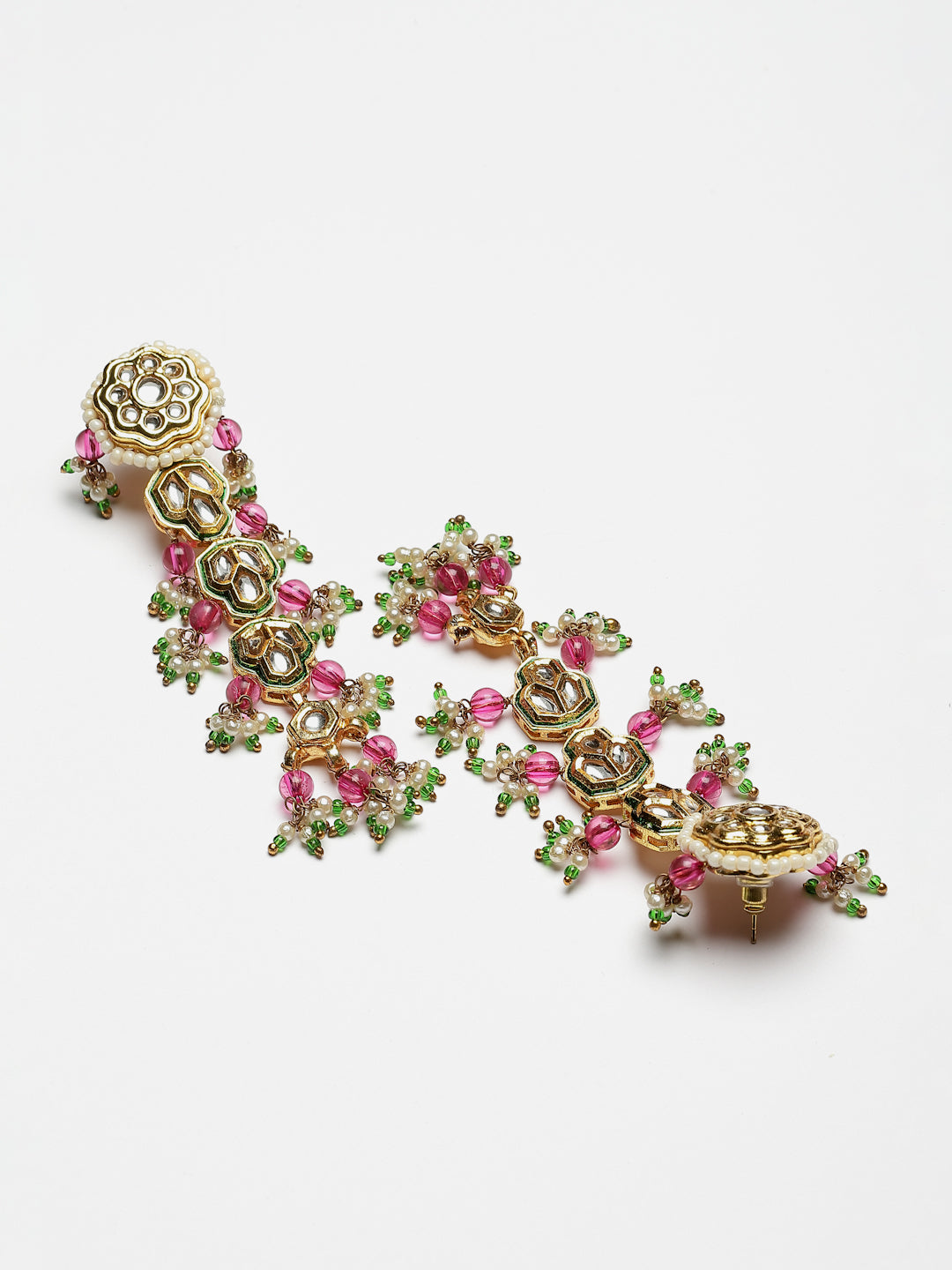 Kundan With Pink Dropllets And Hanging Green Looping As Good As Real Stone Earring; Category Of Jewellery Is Earring; Sub Category Is Drop; Ideal For Women; Color Is Pink, Green, Gold, White, Cream; Gemstones Used - Kundan, Pearls, Natural Stones; Plating Is Gold-Plated; Base Metal Is Alloy; Other Material Used - Closure Stopper; Size Is Freesize; Adjustable - No; Weight Is 25 Gms; Mesaurements - Length Of Earring= 9.5 Cm; Width Of Earring =3 Cm; Adjustable - No; Content 1 Pair Earring