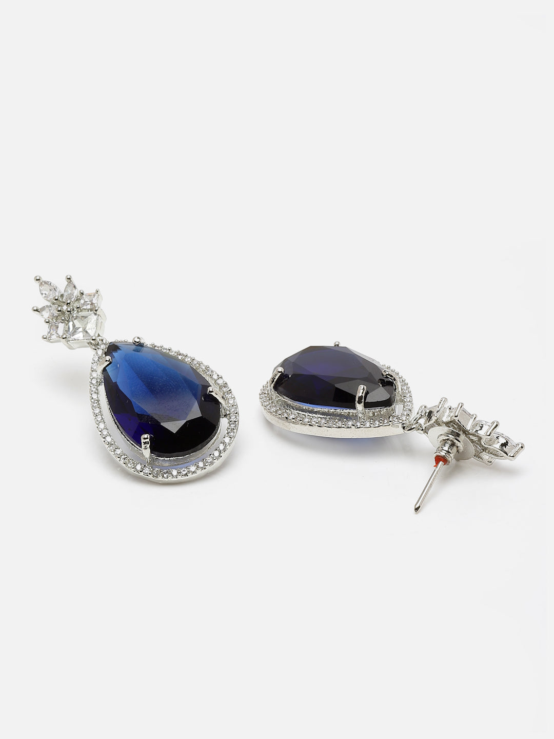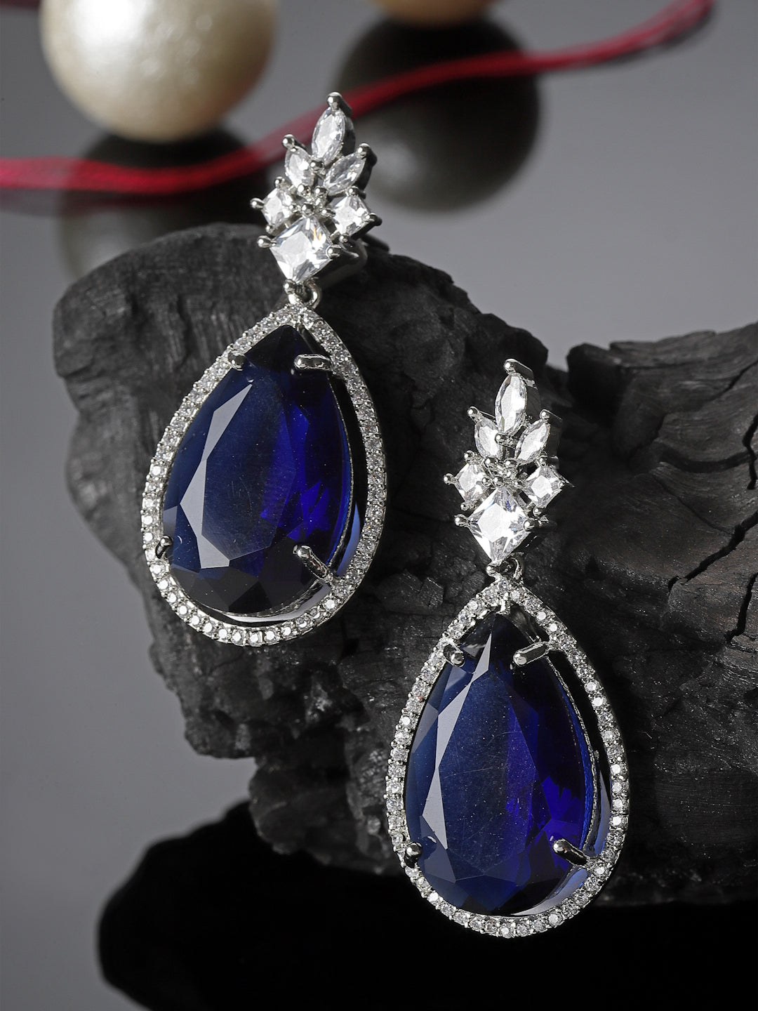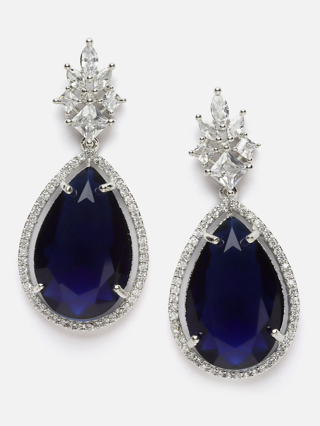 Blue Artificial Diamond Look Earring In Silver Tone ; Category Of Jewellery Is Earring; Sub Category Is Drop; Ideal For Women; Color Is Blue, Silver, White; Gemstones Used - American Diamond, Natural Stones; Plating Is Silver-Plated; Base Metal Is Alloy; Other Material Used - Closure Stopper; Size Is Freesize; Adjustable - No; Weight Is 18 Gms; Mesaurements - Length Of Earring= 5.3 Cm; Width Of Earring =2 Cm; Adjustable - No; Content 1 Pair Earring