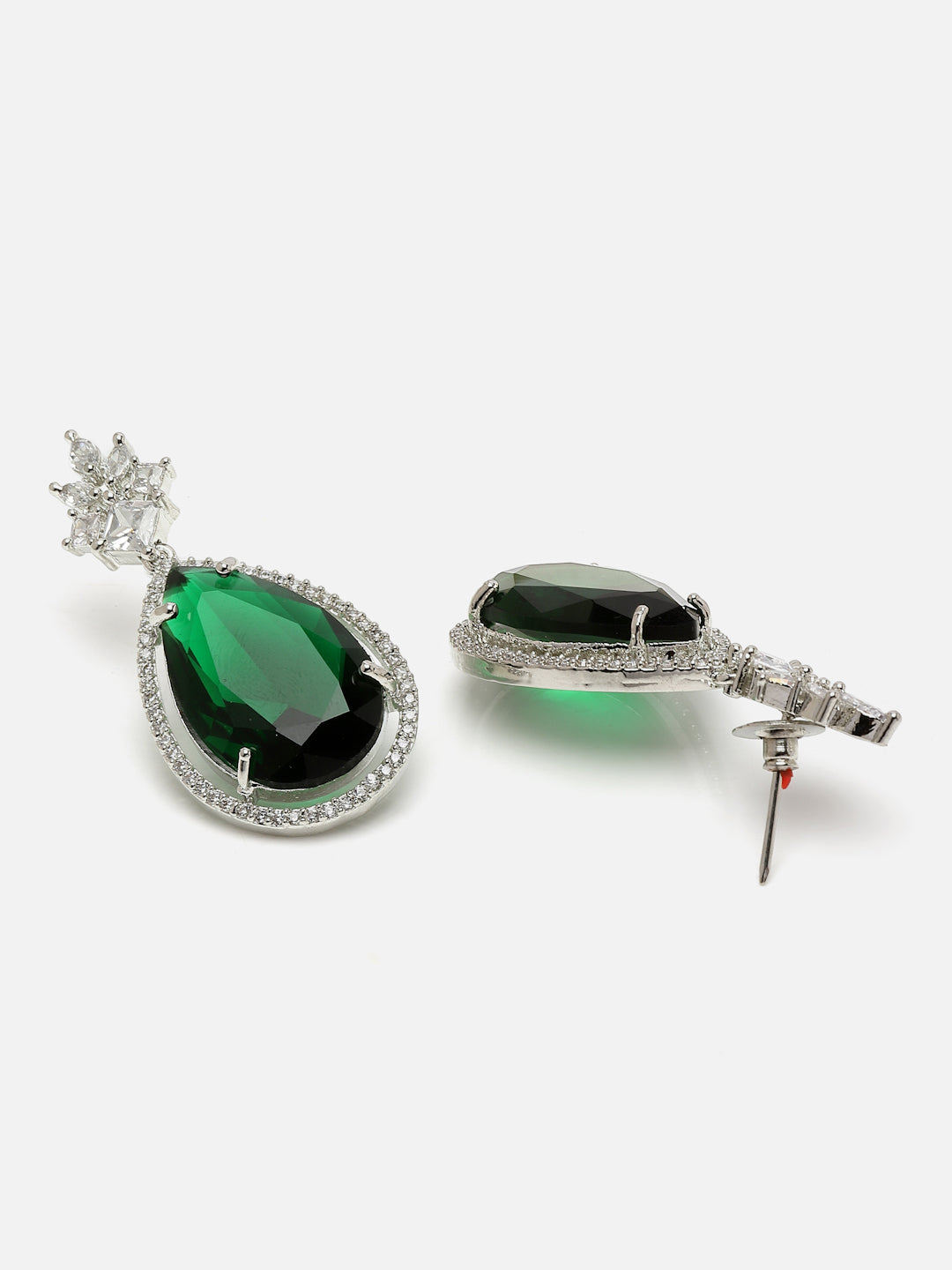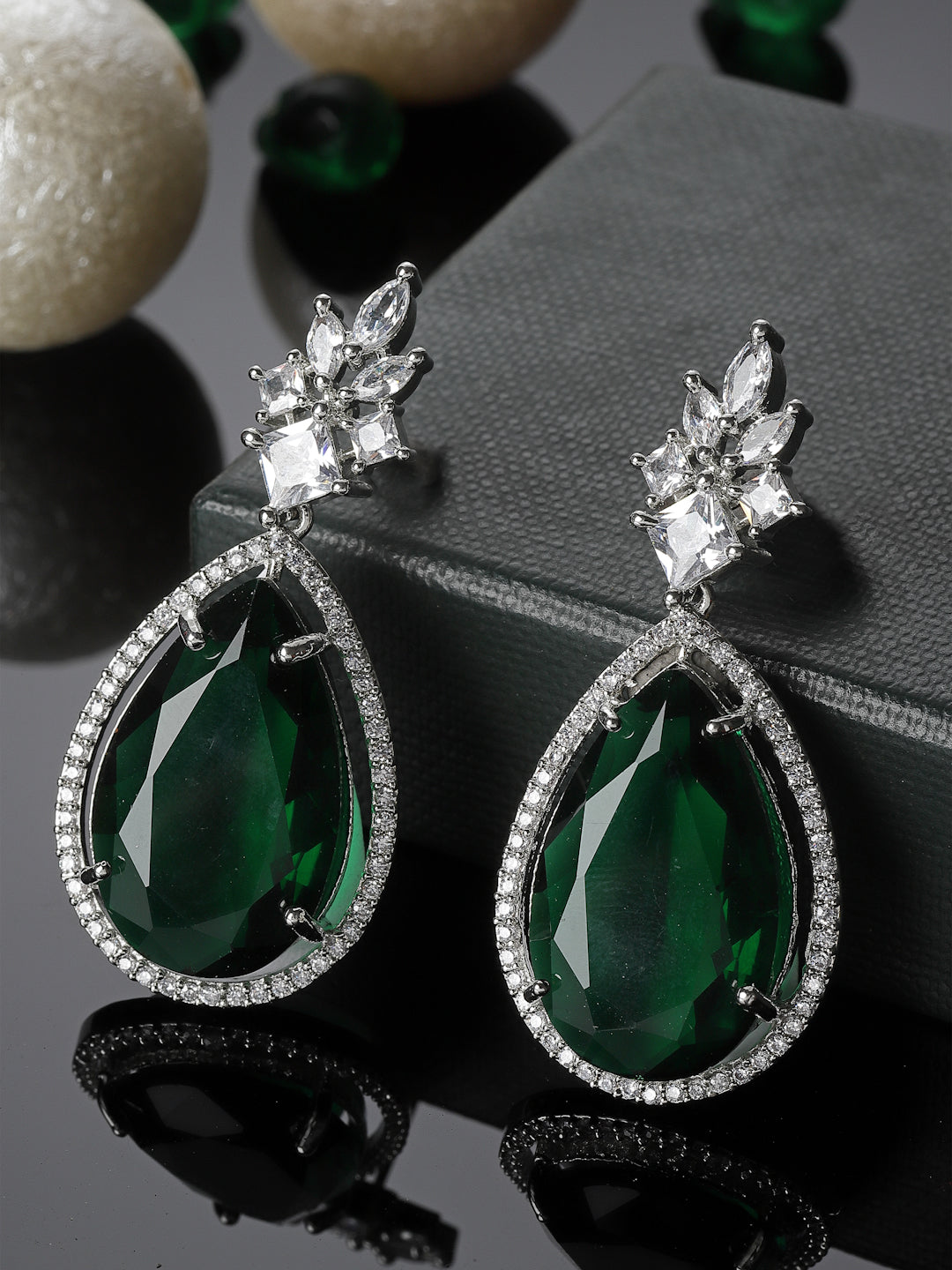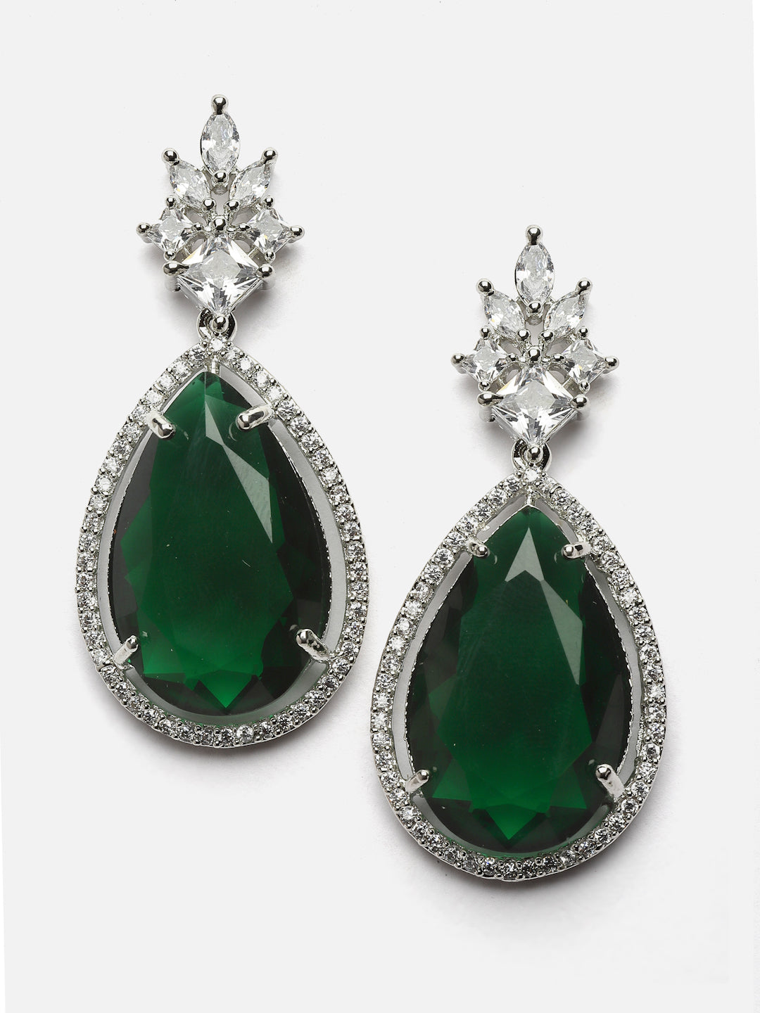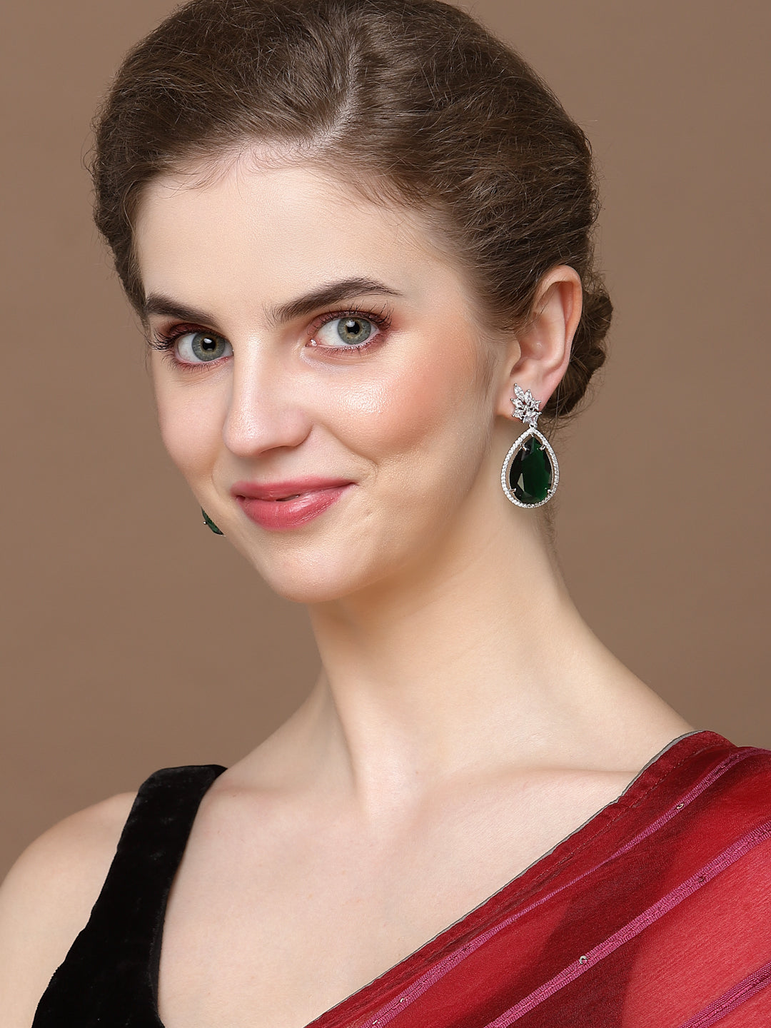 Emerld Earring With Artificial Diamond Look; Category Of Jewellery Is Earring; Sub Category Is Drop; Ideal For Women; Color Is Green, Silver, White; Gemstones Used - American Diamond, Natural Stones; Plating Is Silver-Plated; Base Metal Is Alloy; Other Material Used - Closure Stopper; Size Is Freesize; Adjustable - No; Weight Is 18 Gms; Mesaurements - Length Of Earring= 5.3 Cm; Width Of Earring =2 Cm; Adjustable - No; Content 1 Pair Earring