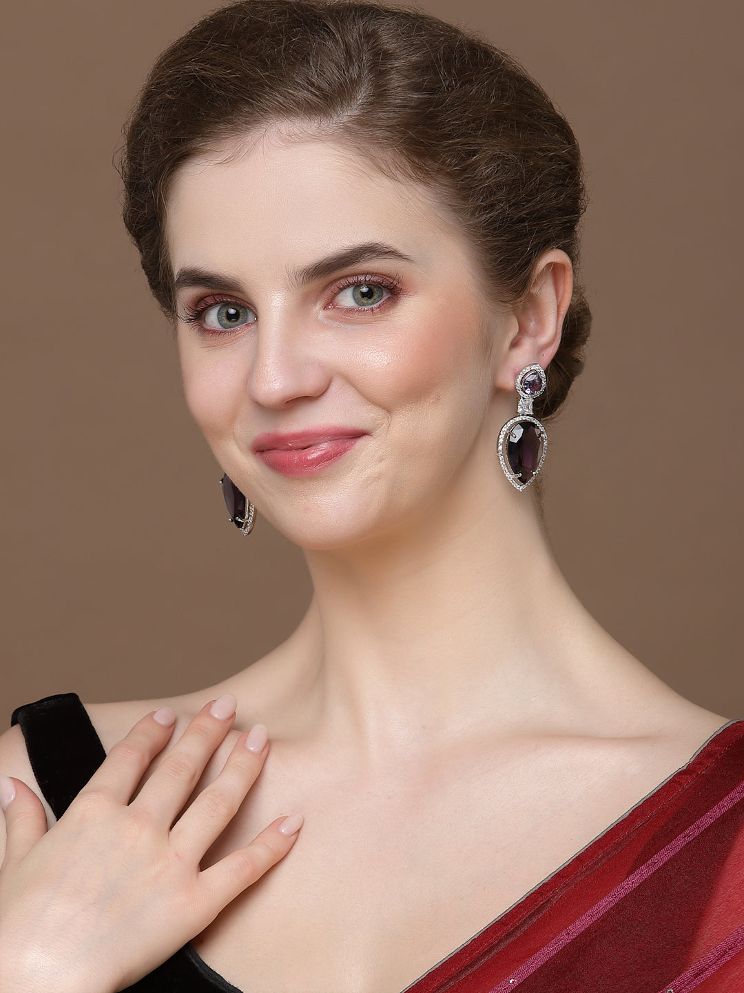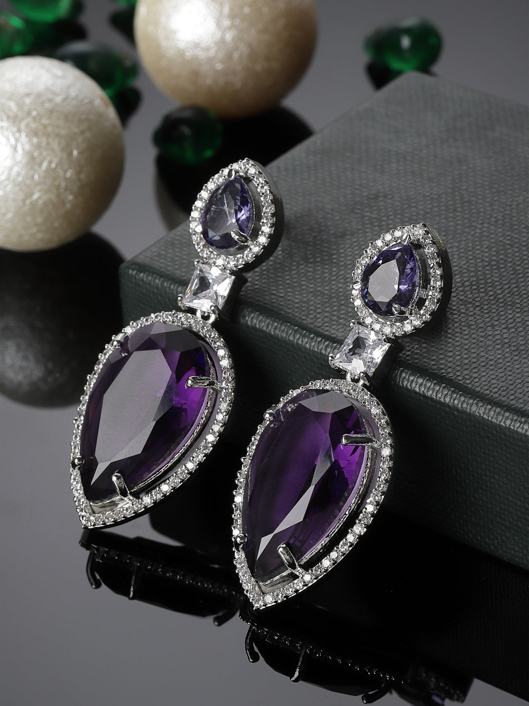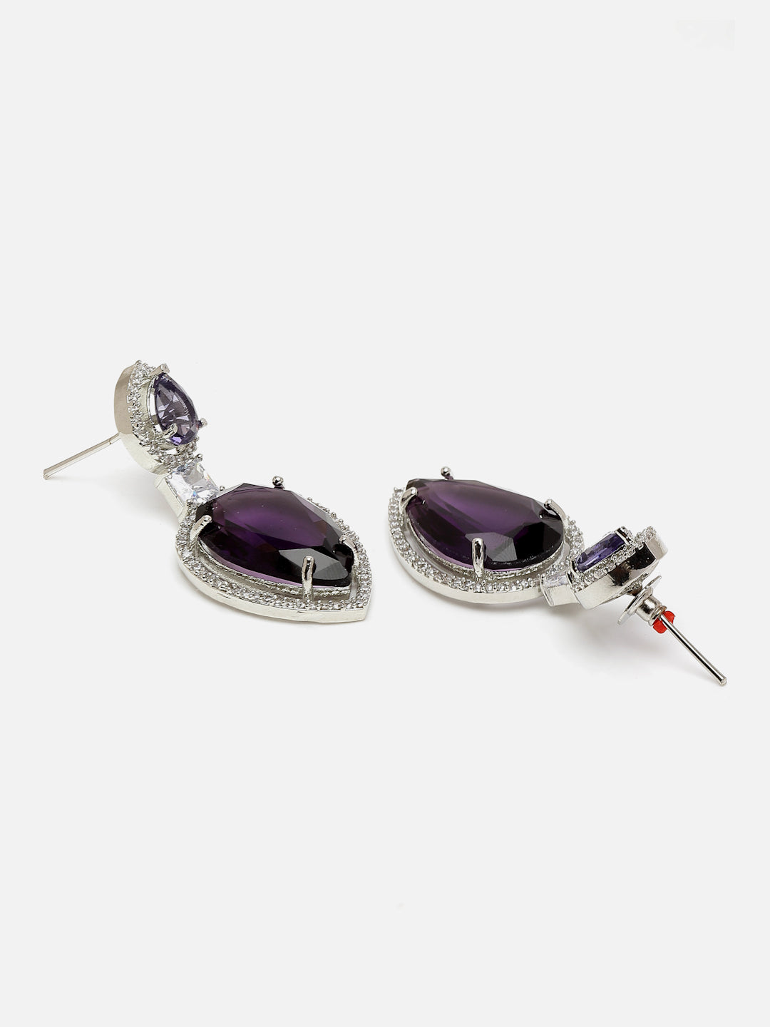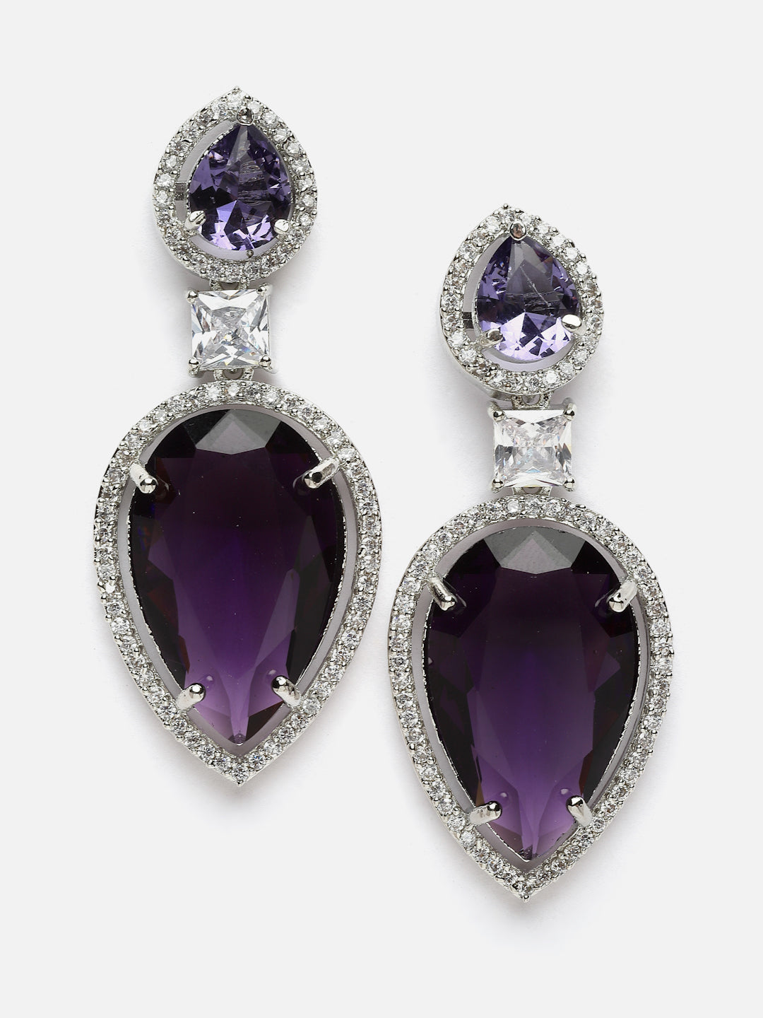 Purple Sapphire Artificial Diamond Look; Category Of Jewellery Is Earring; Sub Category Is Drop; Ideal For Women; Color Is Purple, Silver, White; Gemstones Used - American Diamond, Natural Stones; Plating Is Silver-Plated; Base Metal Is Alloy; Other Material Used - Closure Stopper; Size Is Freesize; Adjustable - No; Weight Is 19 Gms; Mesaurements - Length Of Earring= 5.3 Cm; Width Of Earring =2 Cm; Adjustable - No; Content 1 Pair Earring