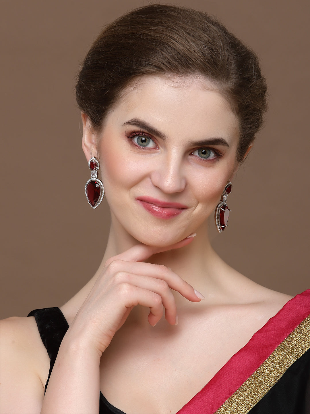Ruby Red Double Layered Earring; Category Of Jewellery Is Earring; Sub Category Is Drop; Ideal For Women; Color Is Red, Silver, White; Gemstones Used - American Diamond, Natural Stones; Plating Is Silver-Plated; Base Metal Is Alloy; Other Material Used - Closure Stopper; Size Is Freesize; Adjustable - No; Weight Is 19 Gms; Mesaurements - Length Of Earring= 5.3 Cm; Width Of Earring =2 Cm; Adjustable - No; Content 1 Pair Earring