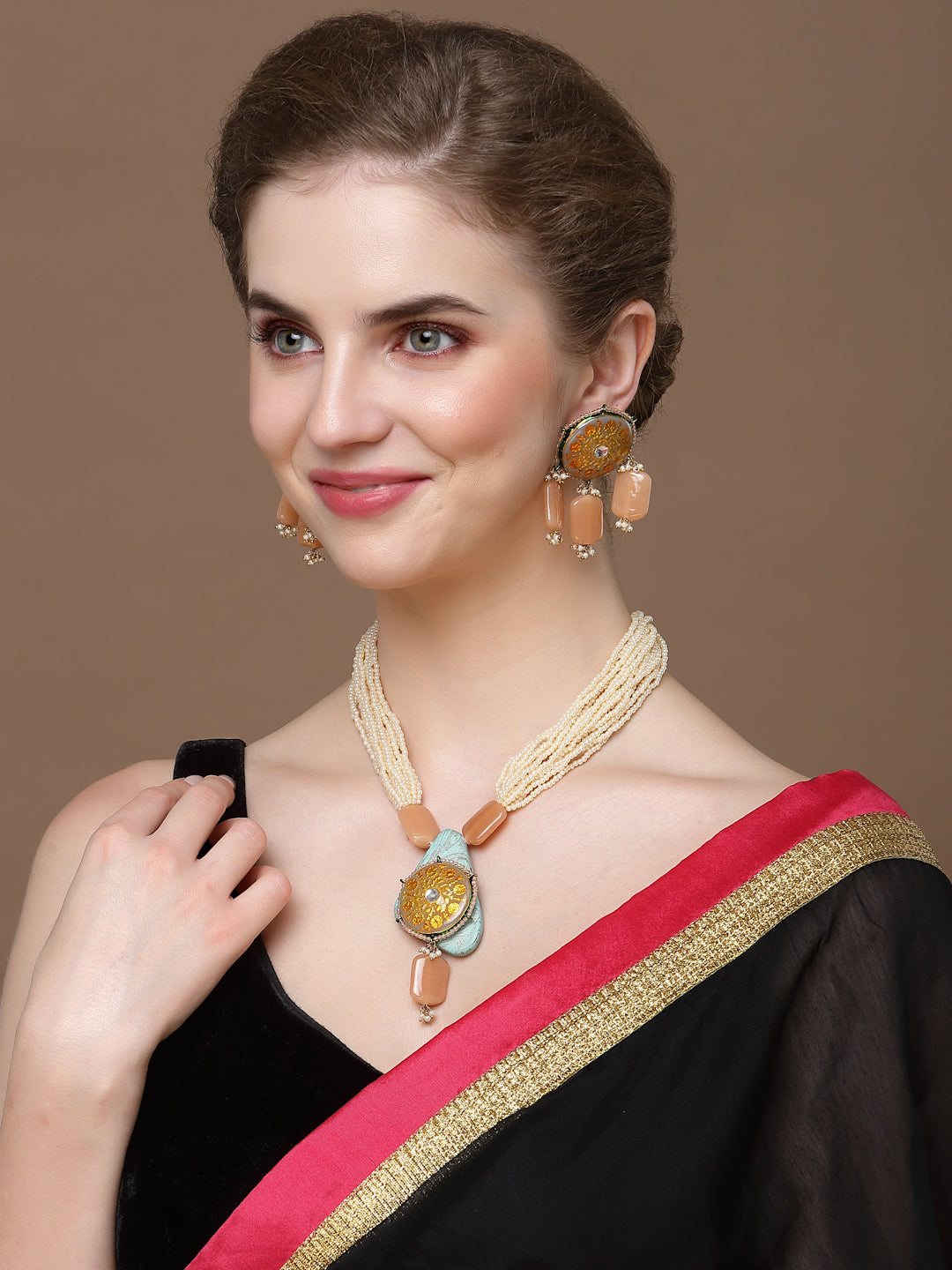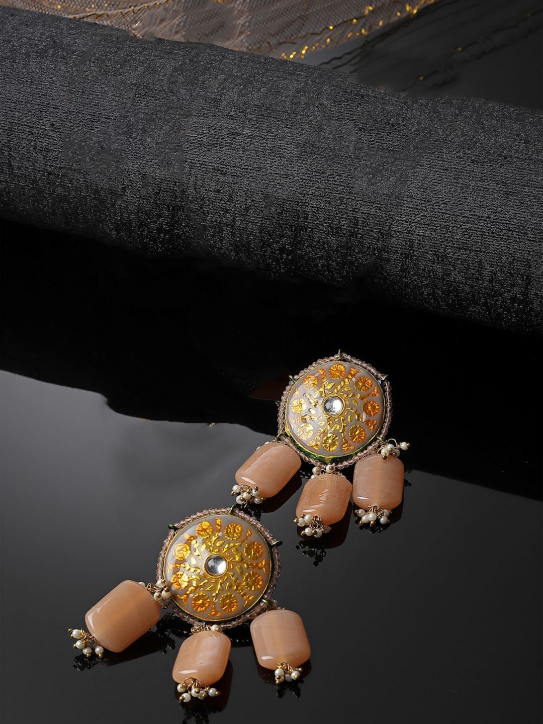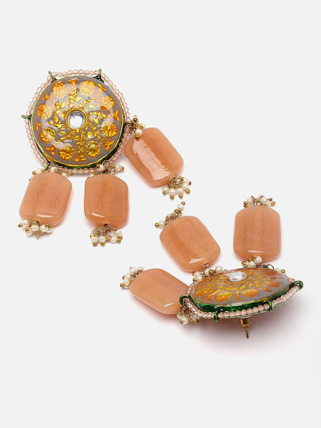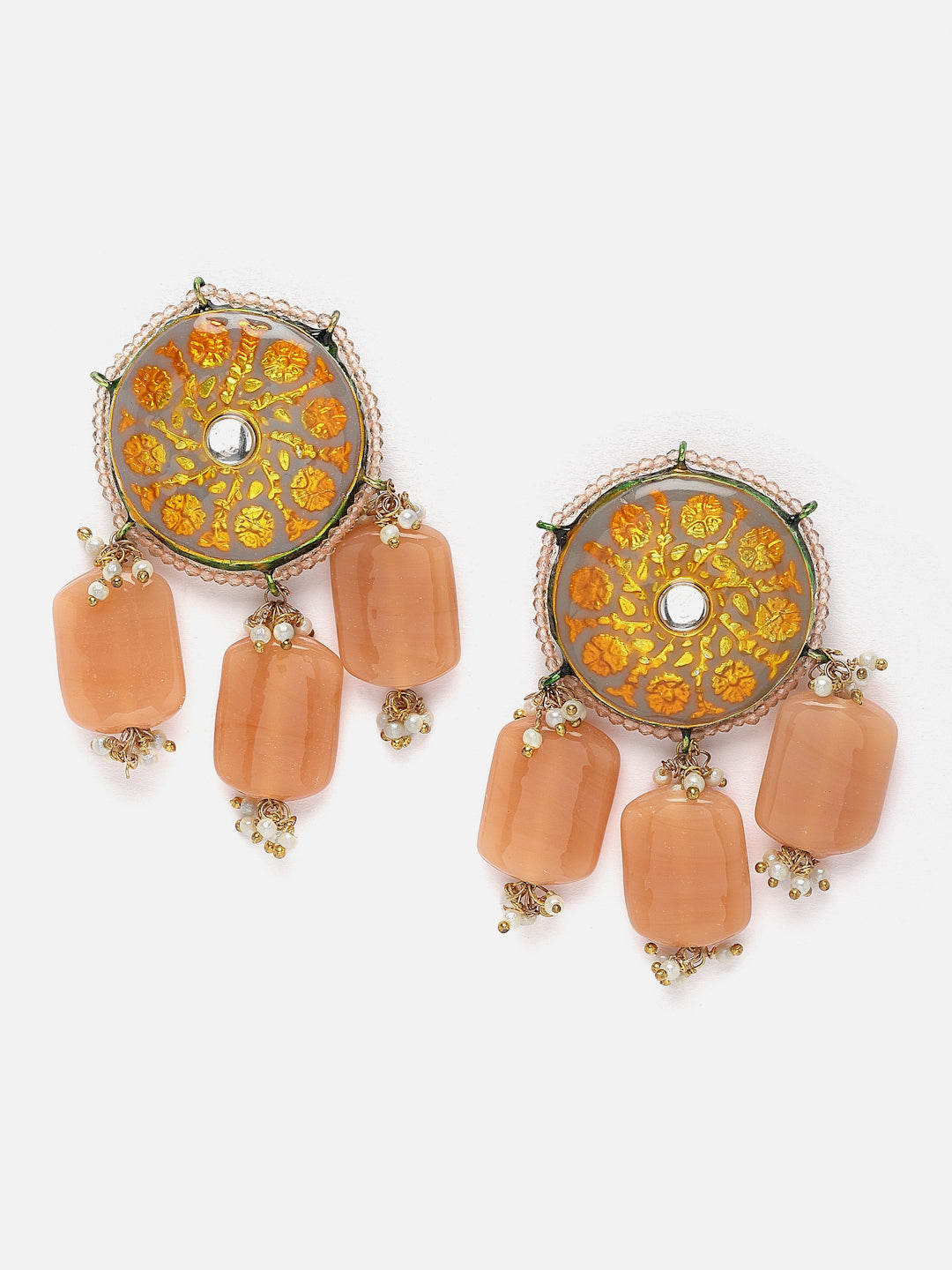 Pink And Peach Grey Earring And Peach Hangings; Category Of Jewellery Is Earring; Sub Category Is Drop; Ideal For Women; Color Is Grey, Orange, Green, Yellow, White, Gold ; Gemstones Used - Kundan, Pearls, Natural Stones; Plating Is Gold-Plated; Base Metal Is Alloy; Other Material Used - Closure Stopper; Size Is Freesize; Adjustable - No; Weight Is 50 Gms; Mesaurements - Length Of Earring= 7 Cm; Width Of Earring =5 Cm; Adjustable - No; Content 1 Pair Earring