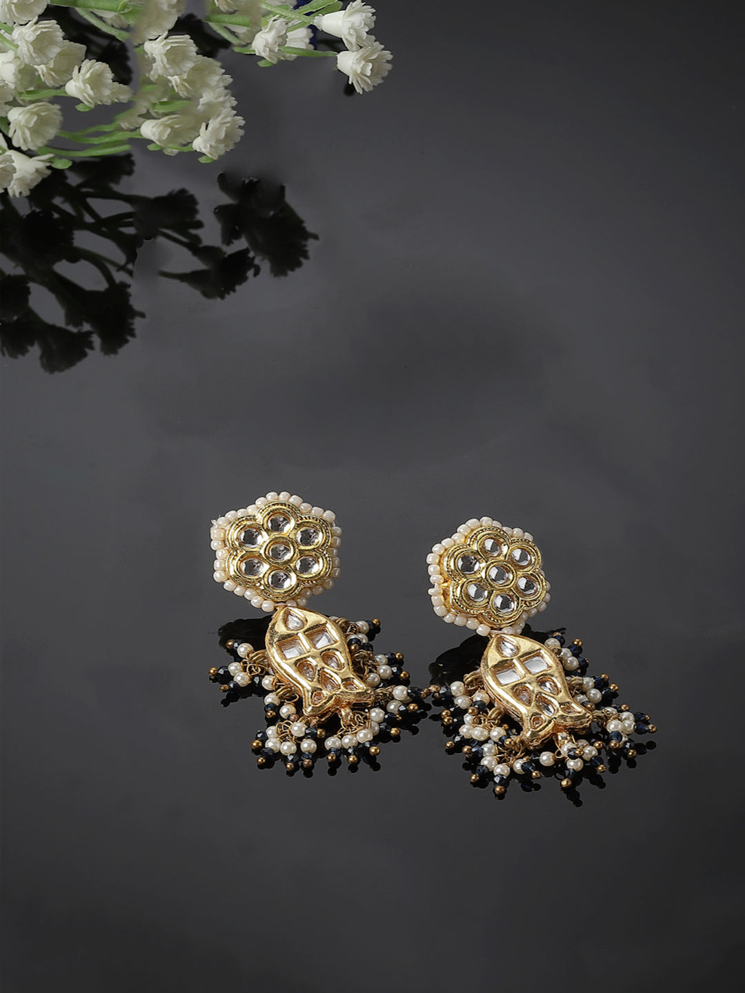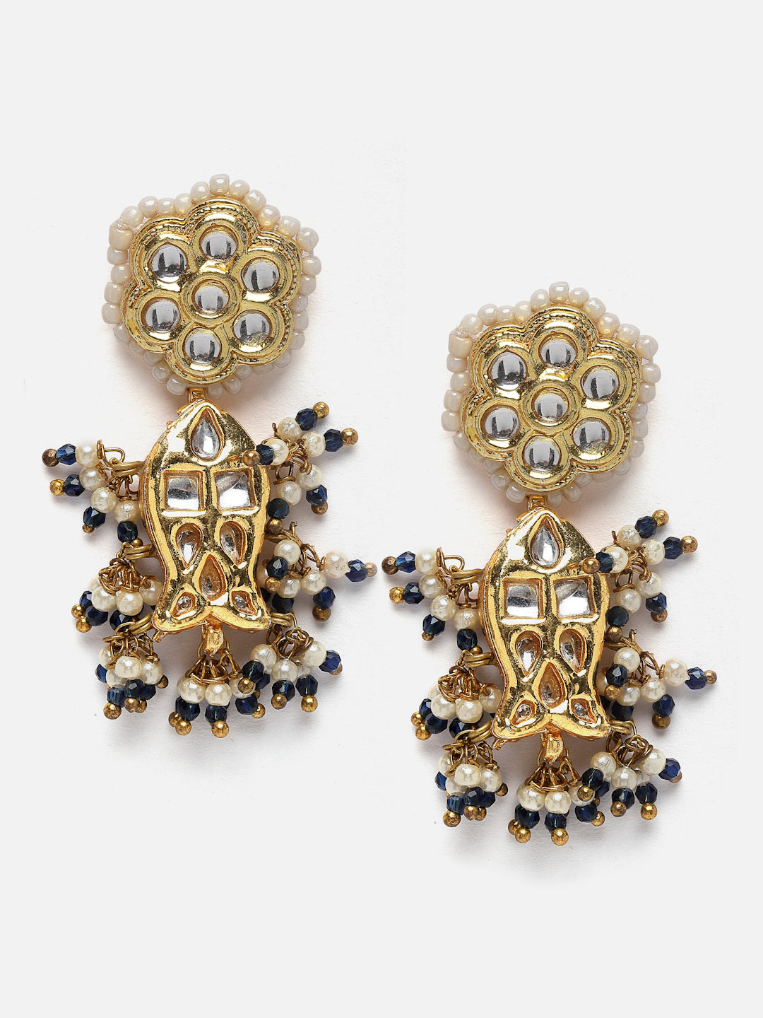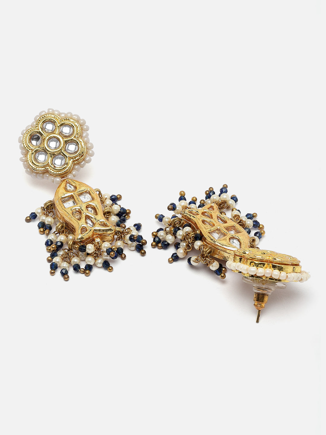 Fish And Flower Blue Hand Made Latkan Earrings; Category Of Jewellery Is Earring; Sub Category Is Drop; Ideal For Women; Color Is Green, Gold, White; Gemstones Used - Kundan, Pearls, Natural Stones, Faux Emerald ; Plating Is Gold-Plated; Base Metal Is Alloy; Other Material Used - Closure Stopper; Size Is Freesize; Adjustable - No; Weight Is 19 Gms; Mesaurements - Length Of Earring= 5.8 Cm; Width Of Earring =3 Cm; Adjustable - No; Content 1 Pair Earring