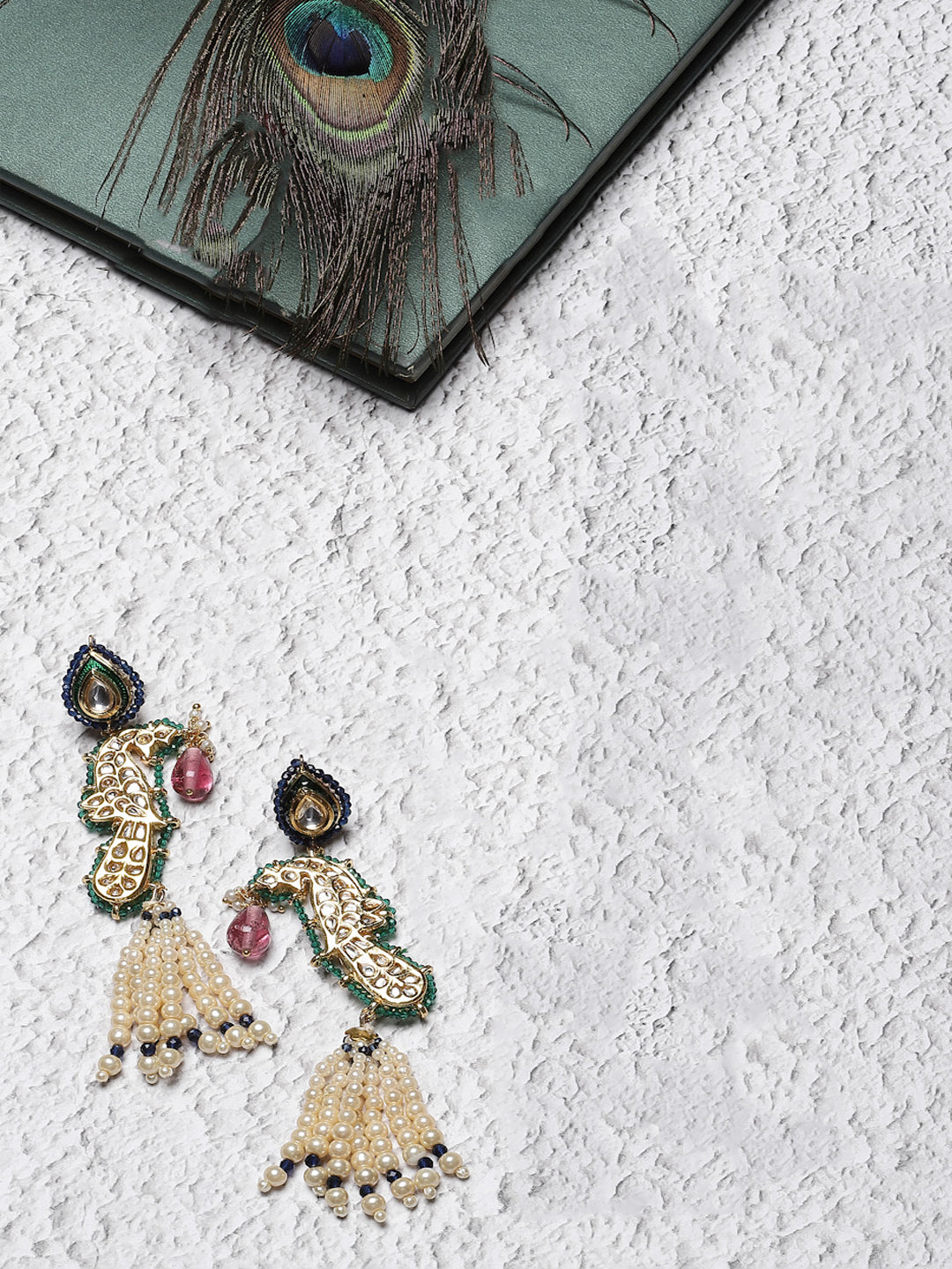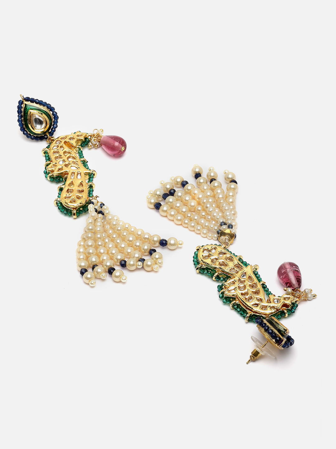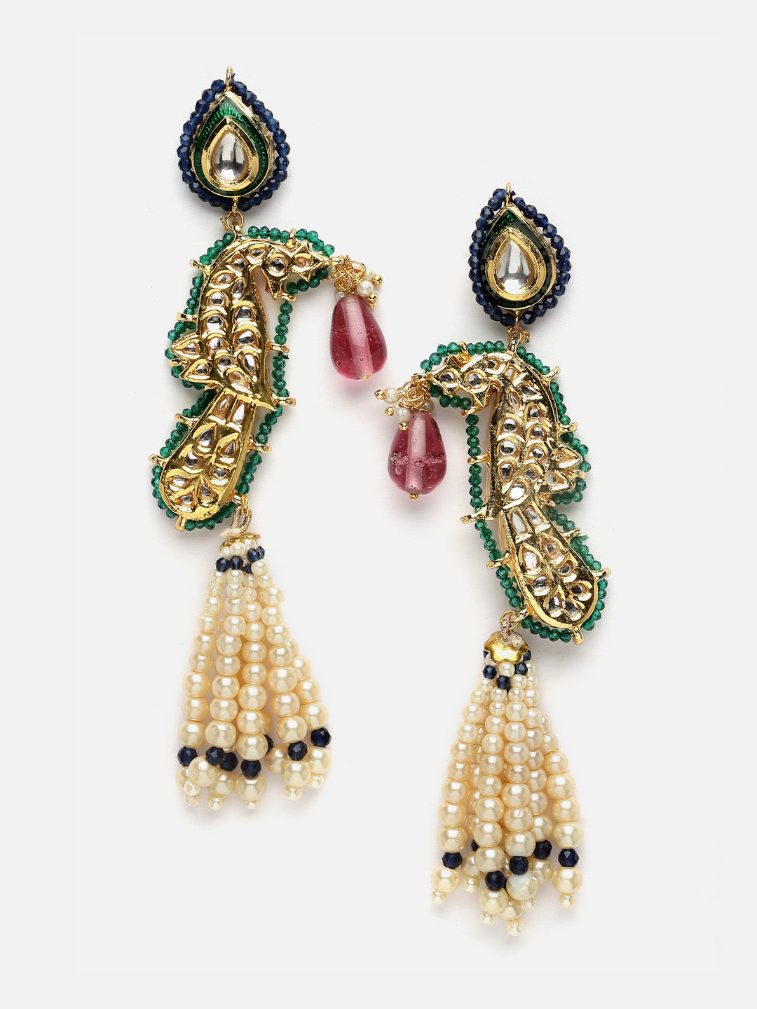Peacock Collection Premium Earring With Tassels And Styled Earring; Category Of Jewellery Is Earring; Sub Category Is Drop; Ideal For Women; Color Is Green, Blue, Pink, Gold, Cream, White; Gemstones Used - Kundan, Pearls, Natural Stones ; Plating Is Gold-Plated; Base Metal Is Alloy; Other Material Used - Closure Stopper; Size Is Freesize; Adjustable - No; Weight Is 36 Gms; Mesaurements - Length Of Earring= 10 Cm; Width Of Earring =3 Cm; Adjustable - No; Content 1 Pair Earring
