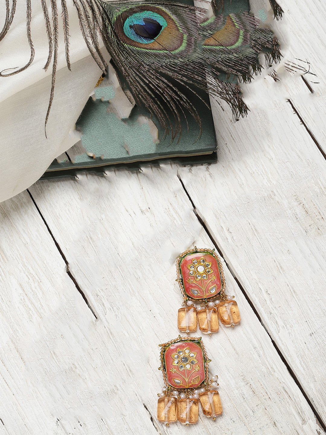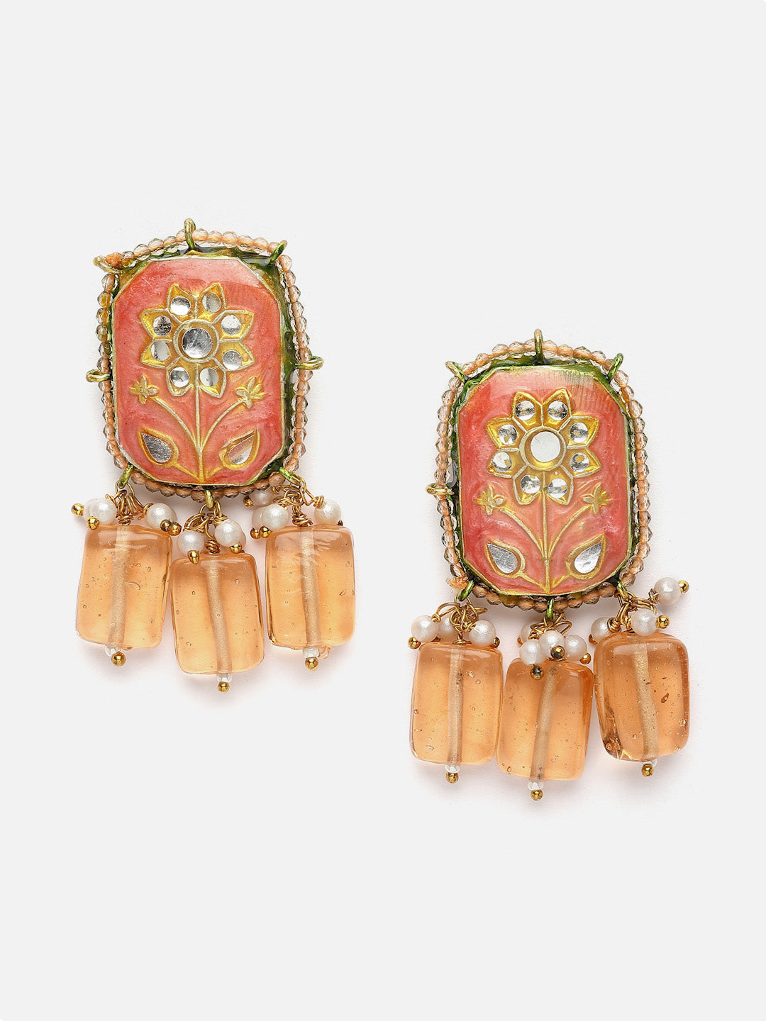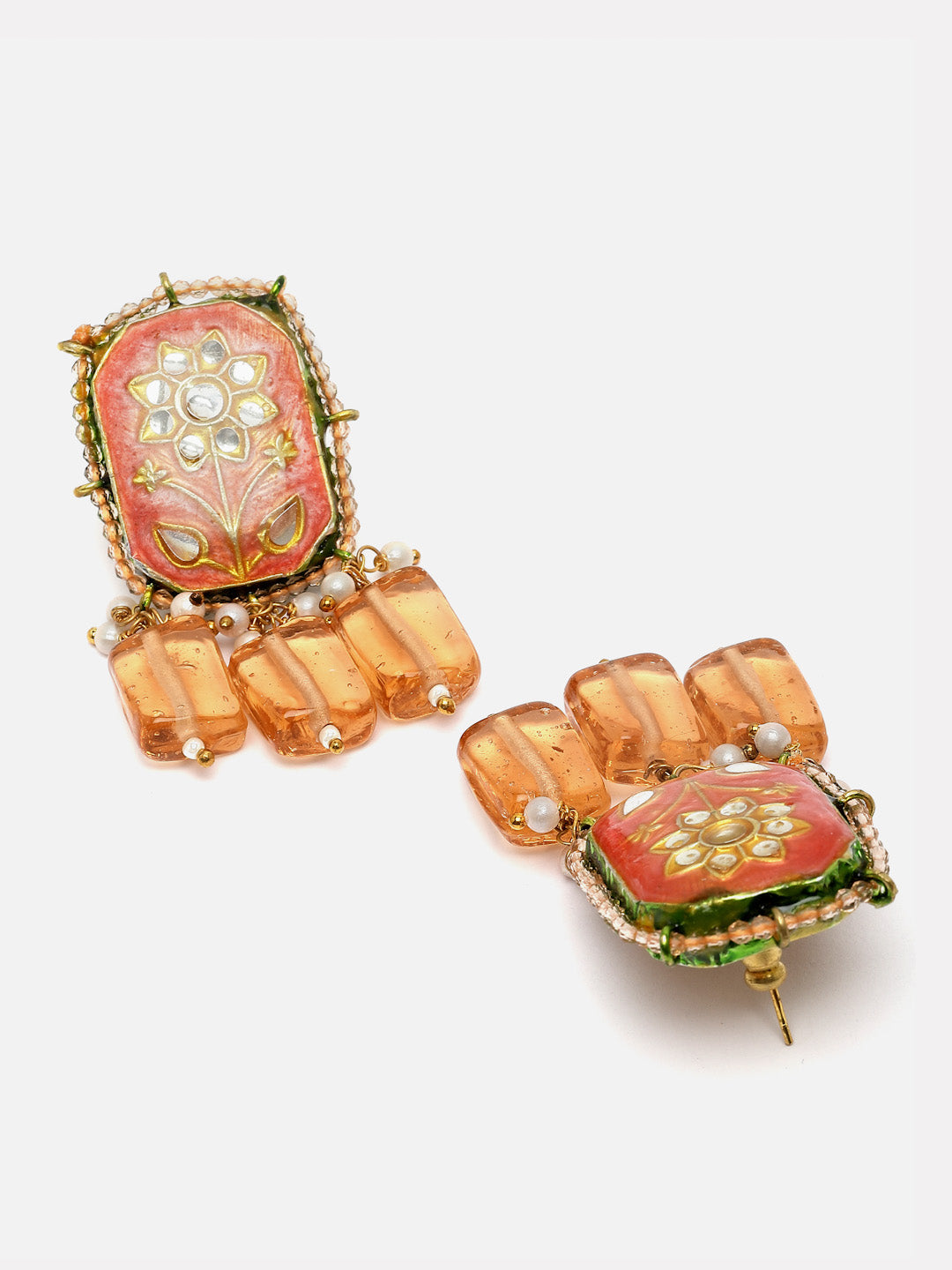 Peach Meenakari And Kundan Amalgamation With Semi Precious Droplets; Category Of Jewellery Is Earring; Sub Category Is Drop; Ideal For Women; Color Is Orange, Cream, White, Gold ; Gemstones Used - Kundan, Pearls, Natural Stones ; Plating Is Gold-Plated; Base Metal Is Alloy; Other Material Used - Closure Stopper; Size Is Freesize; Adjustable - No; Weight Is 28 Gms; Mesaurements - Length Of Earring= 5 Cm; Width Of Earring =3 Cm; Adjustable - No; Content 1 Pair Earring