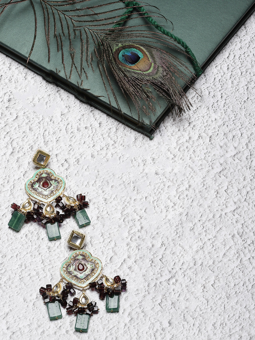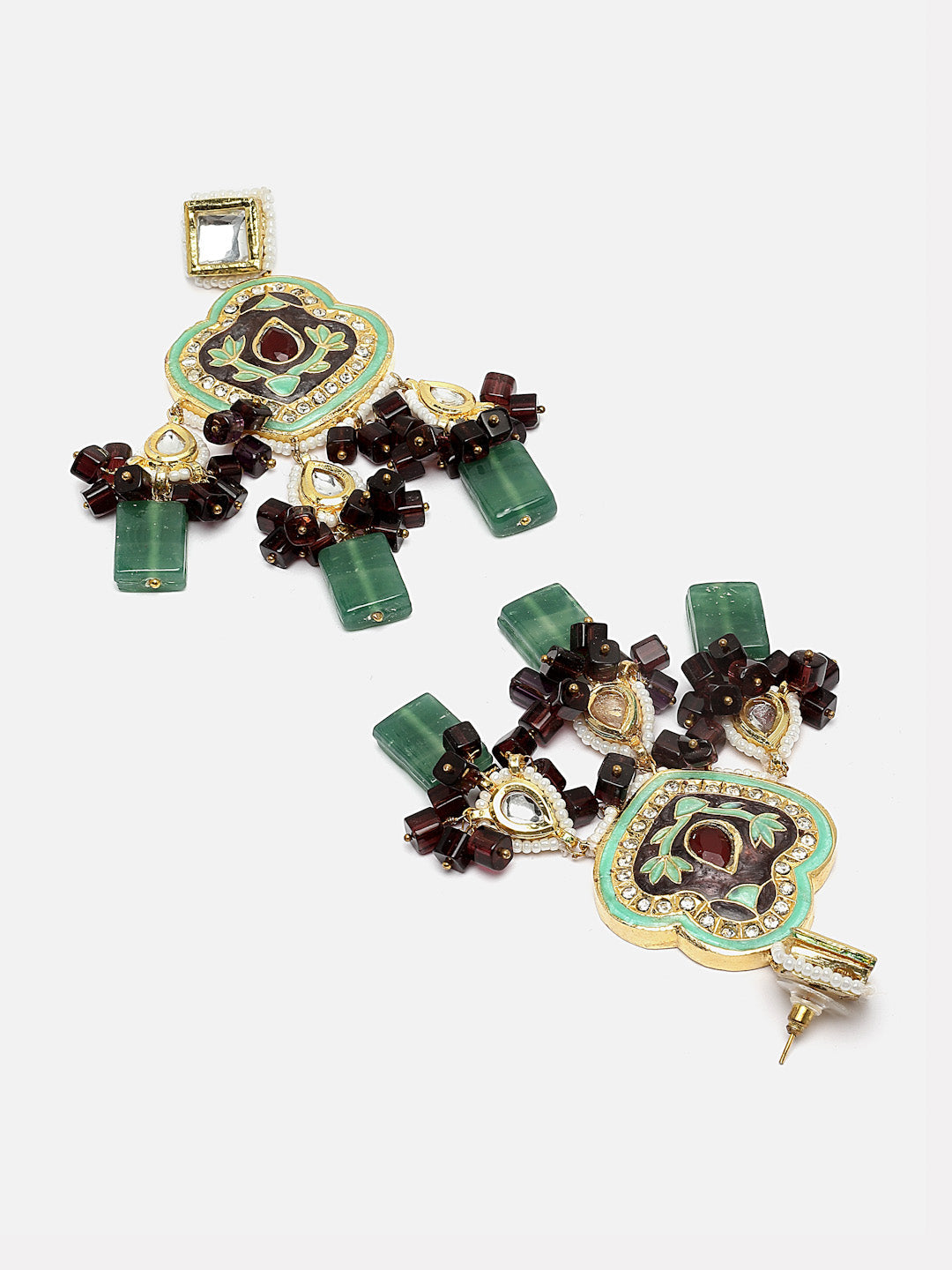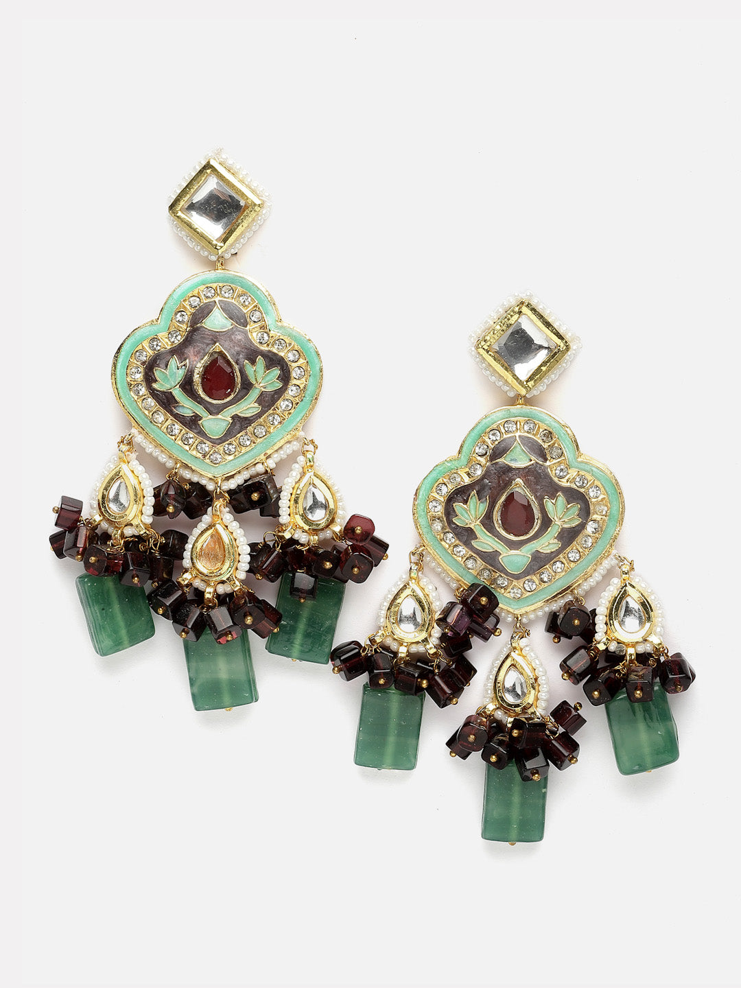Meenakari , Mint And Purple Earring Festive Look Peacock Colors Earring; Category Of Jewellery Is Earring; Sub Category Is Drop; Ideal For Women; Color Is Blue, Grey, Maroon, Green, Purple, Cream, Gold, White; Gemstones Used - Kundan, American Diamonds, Pearls, Natural Stones ; Plating Is Gold-Plated; Base Metal Is Alloy; Other Material Used - Closure Stopper; Size Is Freesize; Adjustable - No; Weight Is 78 Gms; Mesaurements - Length Of Earring= 10 Cm; Width Of Earring =5 Cm; Adjustable - No; Content 1 Pair Earring