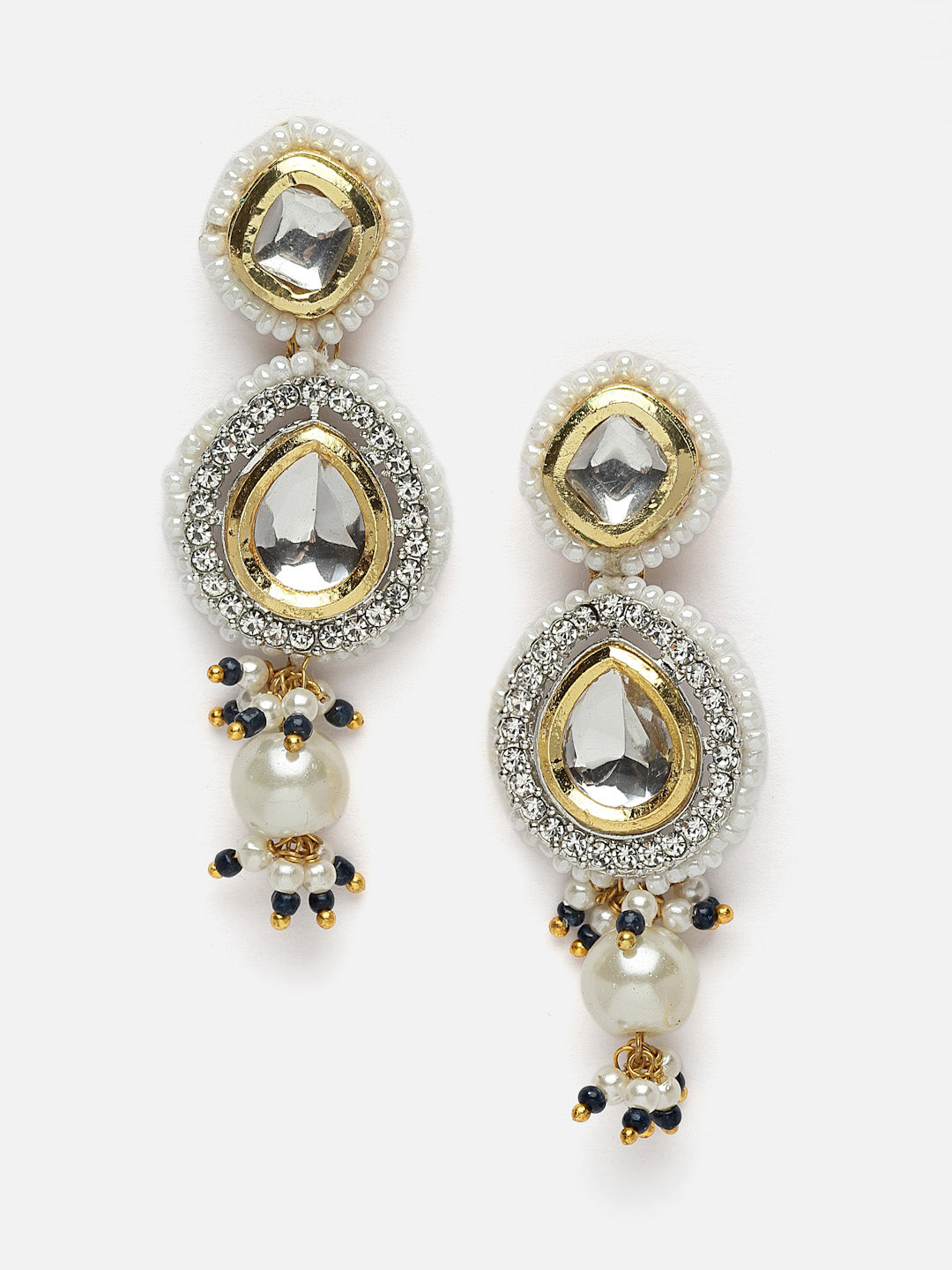 Indo Western Earring; Category Of Jewellery Is Earring; Sub Category Is Drop; Ideal For Women; Color Is Silver, Blue, Gold, White; Gemstones Used - Kundan, American Diamonds, Pearls, Natural Stones ; Plating Is Gold-Plated; Base Metal Is Alloy; Other Material Used - Closure Stopper; Size Is Freesize; Adjustable - No; Weight Is 12 Gms; Mesaurements - Length Of Earring= 6 Cm; Width Of Earring =2.1 Cm; Adjustable - No; Content 1 Pair Earring