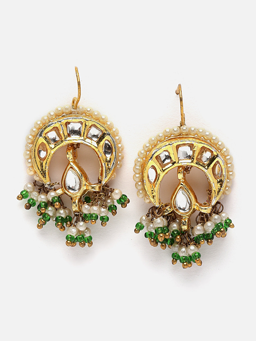 White Chand Earring; Category Of Jewellery Is Earring; Sub Category Is Drop; Ideal For Women; Color Is Green, Cream, Gold, White; Gemstones Used - Kundan, Pearls, Natural Stones, Faux Emerald; Plating Is Gold-Plated; Base Metal Is Alloy; Other Material Used - None; Size Is Freesize; Adjustable - No; Weight Is 12 Gms; Mesaurements - Length Of Earring= 4.5 Cm; Width Of Earring =2.5 Cm; Adjustable - No; Content 1 Pair Earring