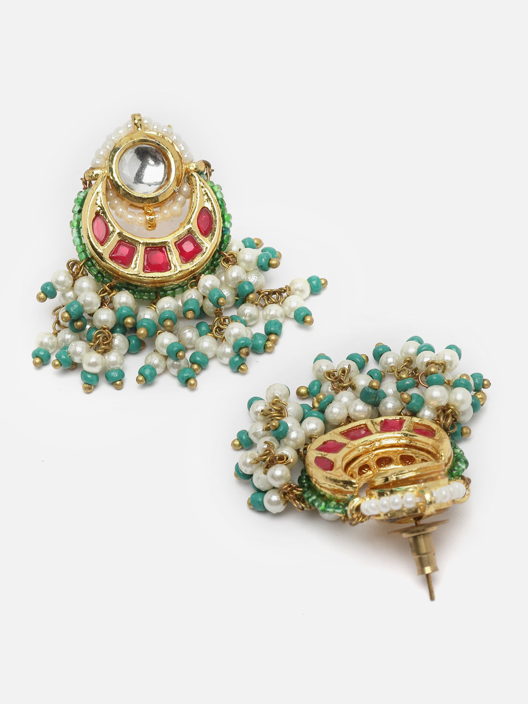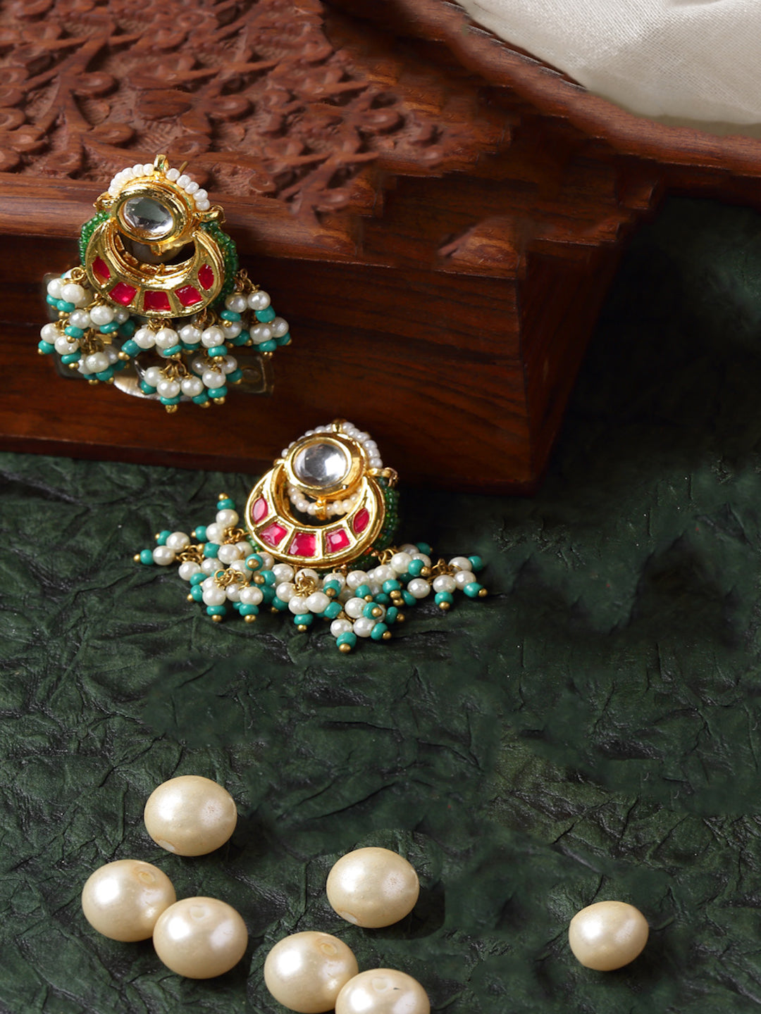 White And Pink Chand And Bindu Earring; Category Of Jewellery Is Earring; Sub Category Is Drop; Ideal For Women; Color Is Pink, Green, Blue, Cream, Gold, White; Gemstones Used - Kundan, Pearls, Natural Stones; Plating Is Gold-Plated; Base Metal Is Alloy; Other Material Used - Closure Stopper; Size Is Freesize; Adjustable - No; Weight Is 17 Gms; Mesaurements - Length Of Earring= 4.2 Cm; Width Of Earring =3.2 Cm; Adjustable - No; Content 1 Pair Earring