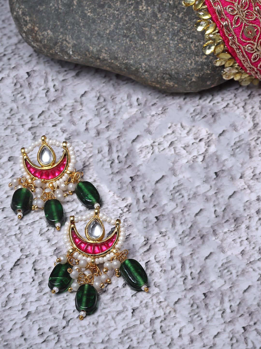 Pink And White Green Dropplet Earring; Category Of Jewellery Is Earring; Sub Category Is Drop; Ideal For Women; Color Is Pink, Green, Gold, Cream, White; Gemstones Used - Kundan, Natural Stones, Pearls, Faux Emerald ; Plating Is Gold-Plated; Base Metal Is Alloy; Other Material Used - Closure Stopper; Size Is Freesize; Adjustable - No; Weight Is 11 Gms; Mesaurements - Length Of Earring= 6.5 Cm; Width Of Earring =4 Cm; Adjustable - No; Content 1 Pair Earring