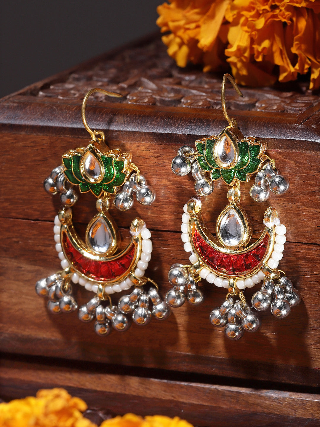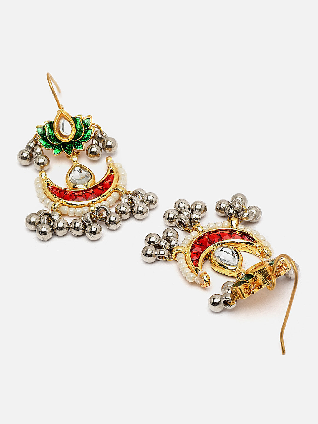 Lotus And Chand Earring With Silver Dropplets; Category Of Jewellery Is Earring; Sub Category Is Drop; Ideal For Women; Color Is Red, Green, Cream, Gold, Silver ; Gemstones Used - Kundan, Pearls, Natural Stones; Plating Is Gold-Plated; Base Metal Is Alloy; Other Material Used - Hook; Size Is Freesize; Adjustable - No; Weight Is 9 Gms; Mesaurements - Length Of Earring= 5 Cm; Width Of Earring =3 Cm; Adjustable - No; Content 1 Pair Earring