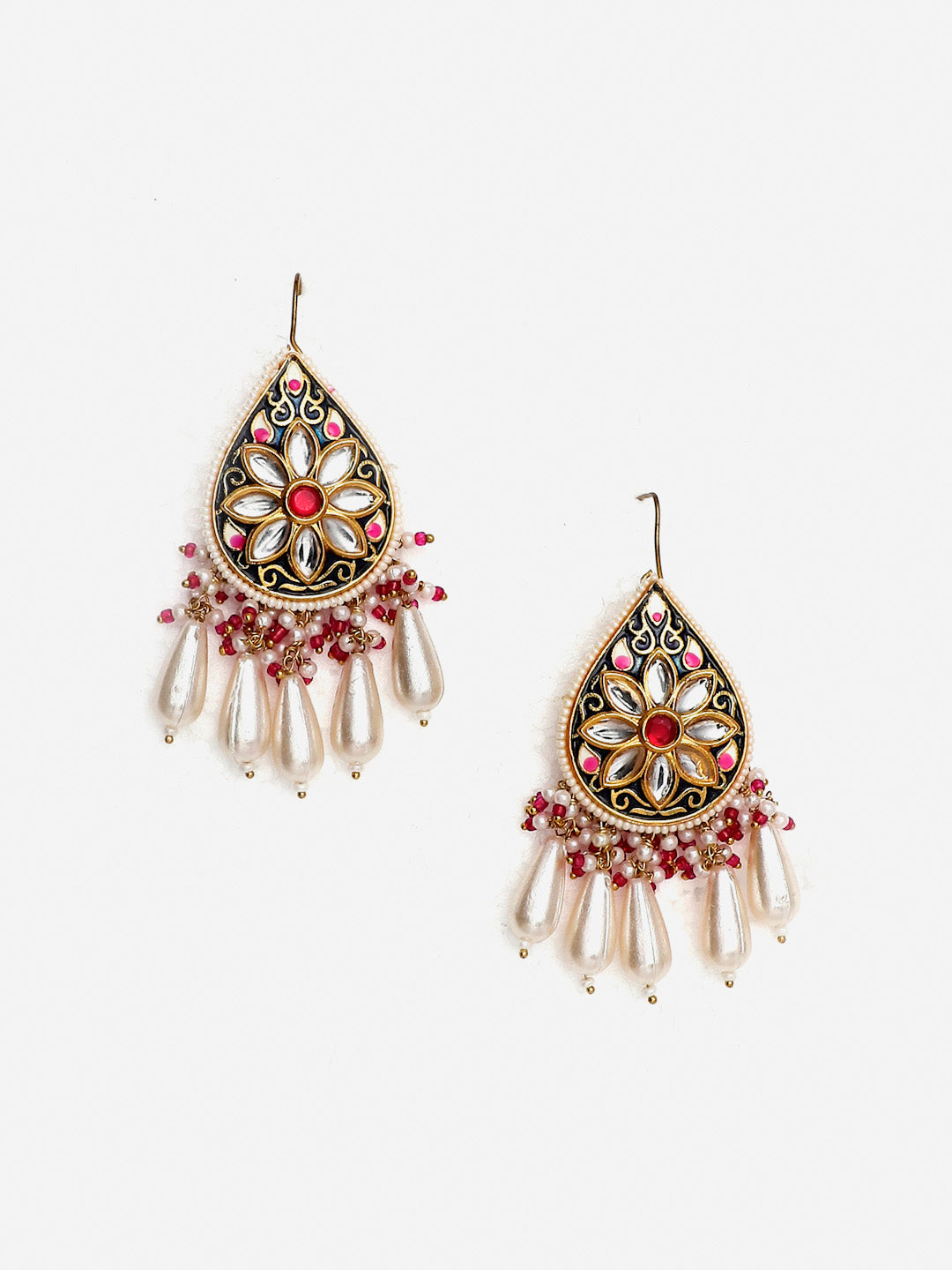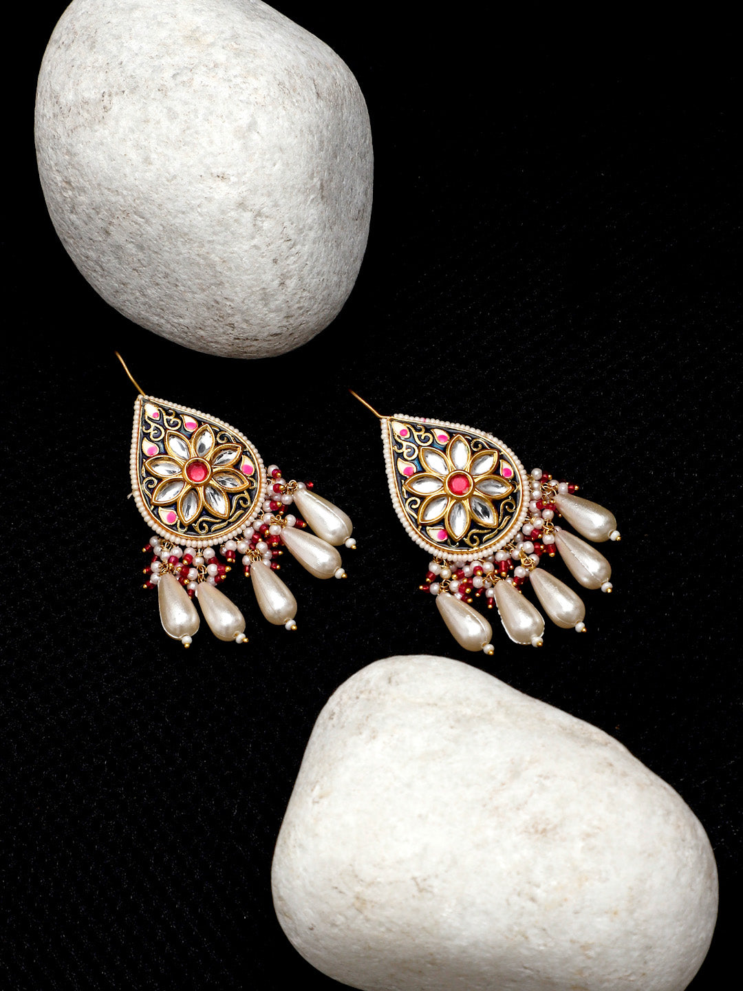 Blue Meenakari And Drop Perl Earring Trending; Category Of Jewellery Is Earring; Sub Category Is Drop; Ideal For Women; Color Is Pink, Blue, Cream, Gold, White; Gemstones Used - Kundan, Pearls, Natural Stones; Plating Is Gold-Plated; Base Metal Is Alloy; Other Material Used - Hook; Size Is Freesize; Adjustable - No; Weight Is 23 Gms; Mesaurements - Length Of Earring= 8.1 Cm; Width Of Earring =4.2 Cm; Adjustable - No; Content 1 Pair Earring