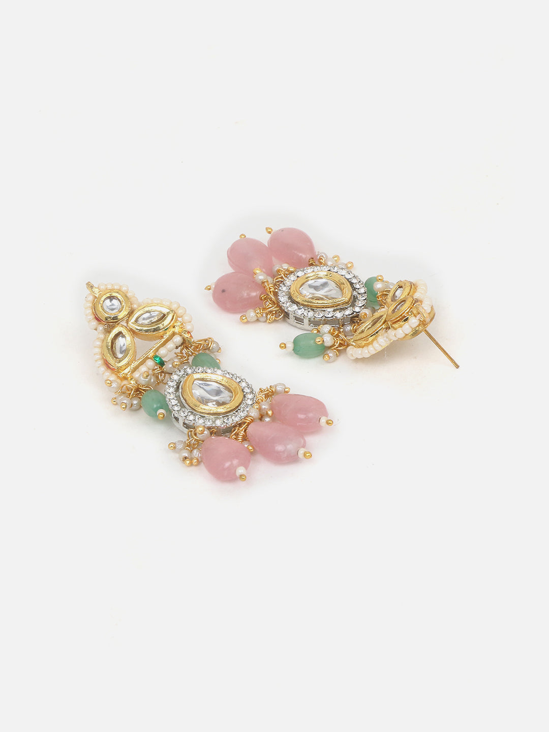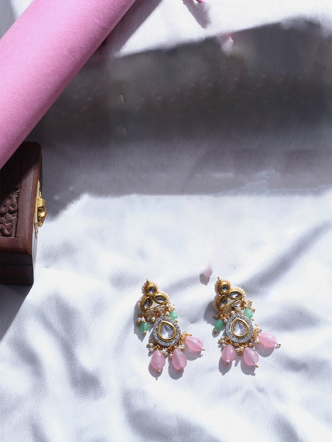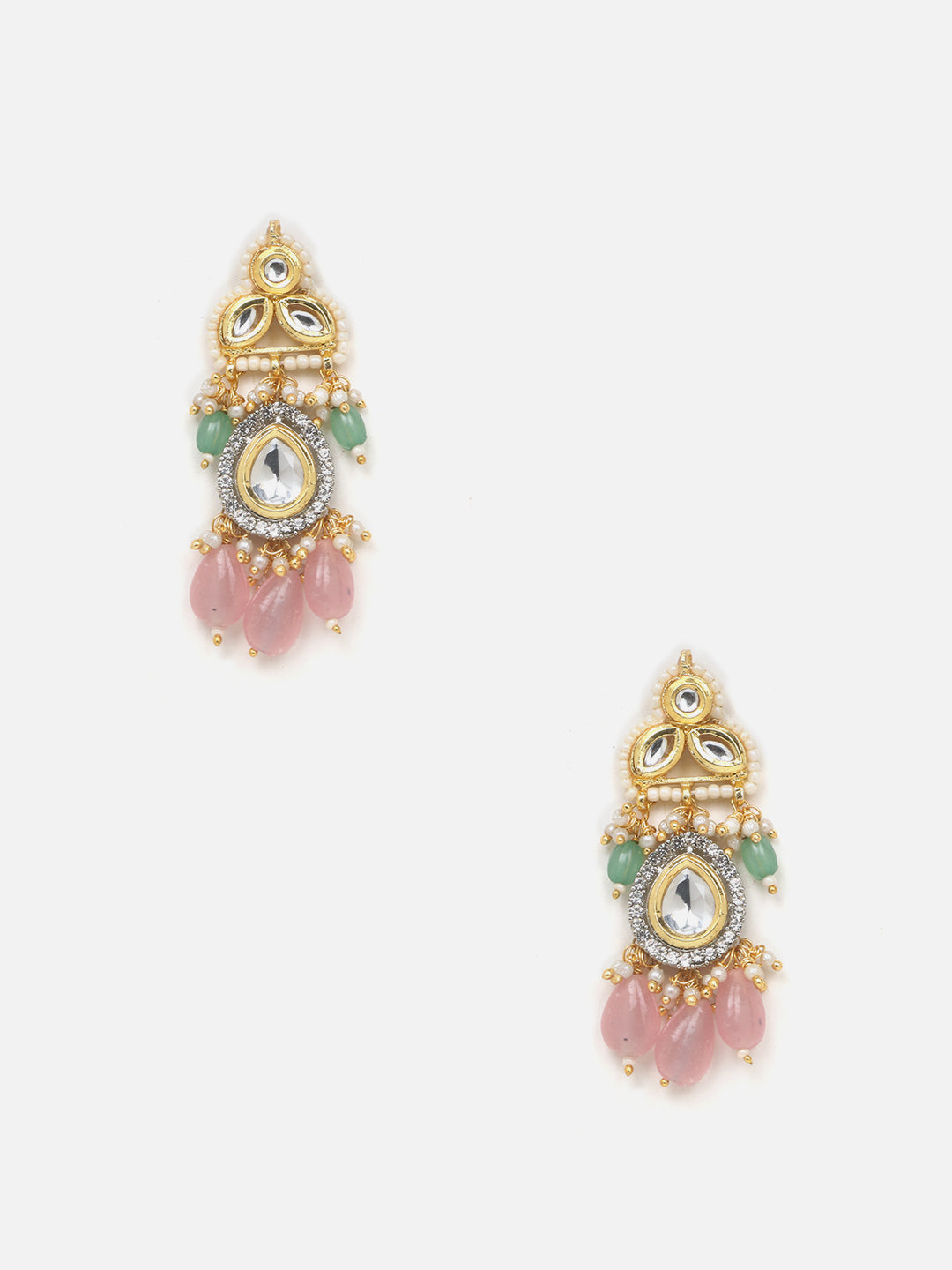Colour Paletfull Of Green And Pink Earring; Category Of Jewellery Is Earring; Sub Category Is Drop; Ideal For Women; Color Is Pink, Green, Cream, Gold, White; Gemstones Used - Kundan, American Diamonds, Pearls, Natural Stones; Plating Is Gold-Plated; Base Metal Is Alloy; Other Material Used - Closure Stopper; Size Is Freesize; Adjustable - No; Weight Is 22 Gms; Mesaurements - Length Of Earring= 7 Cm; Width Of Earring =3 Cm; Adjustable - No; Content 1 Pair Earring